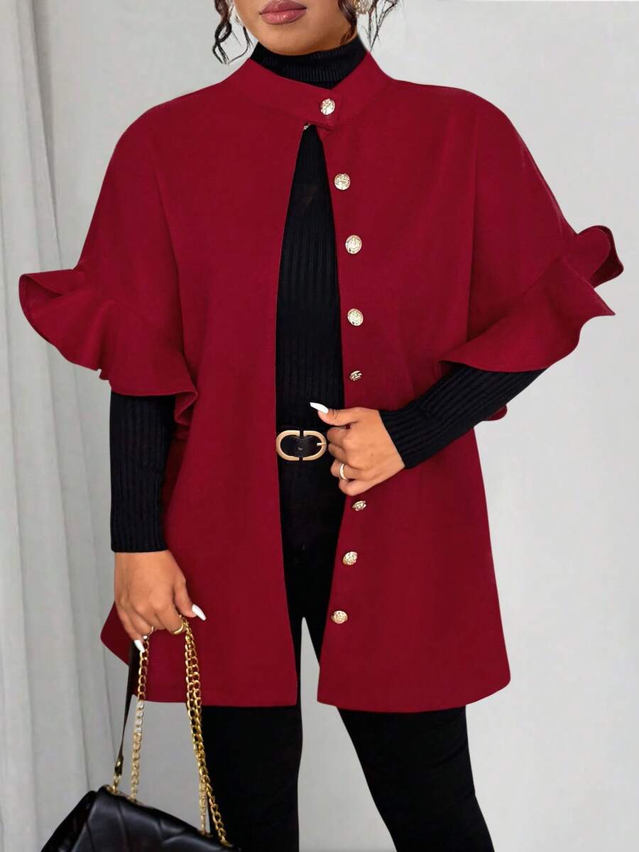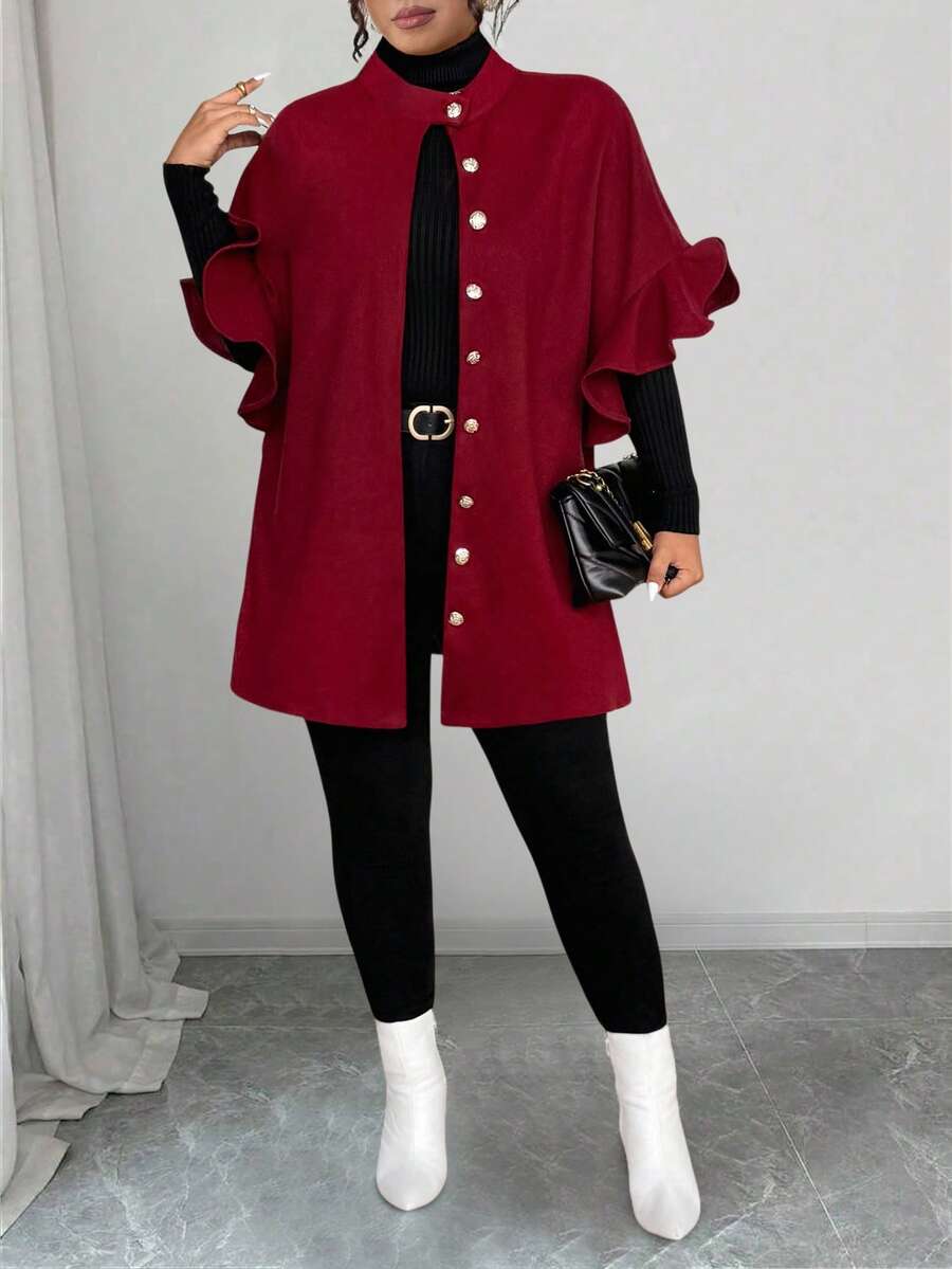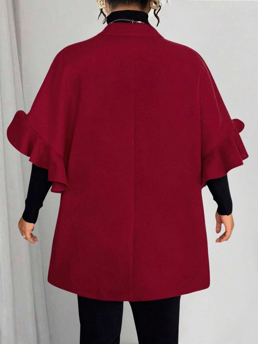 Abrigo de lana de mezcla de talla grande para mujer, informal, con volantes y manga 3/4 de largo medio