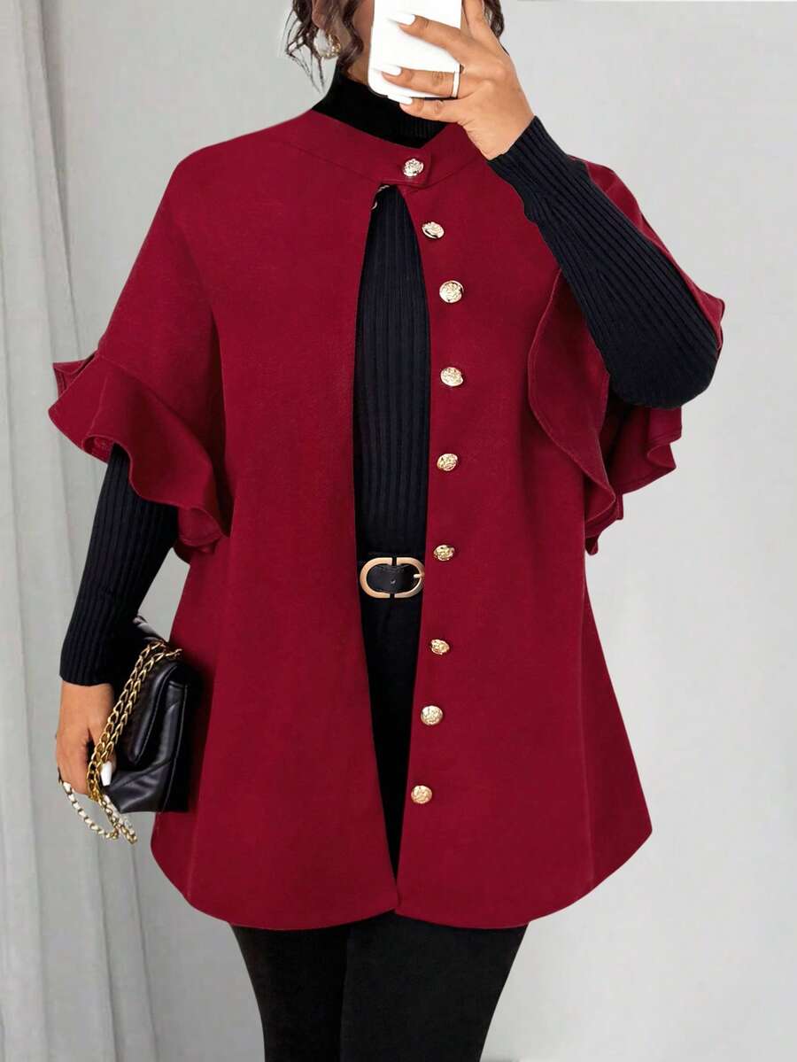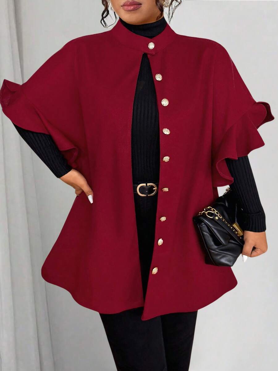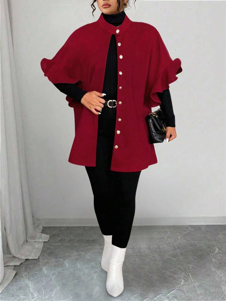 Abrigo de lana de mezcla de talla grande para mujer, informal, con volantes y manga 3/4 de largo medio