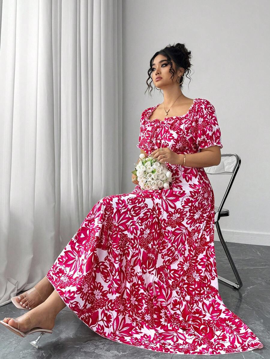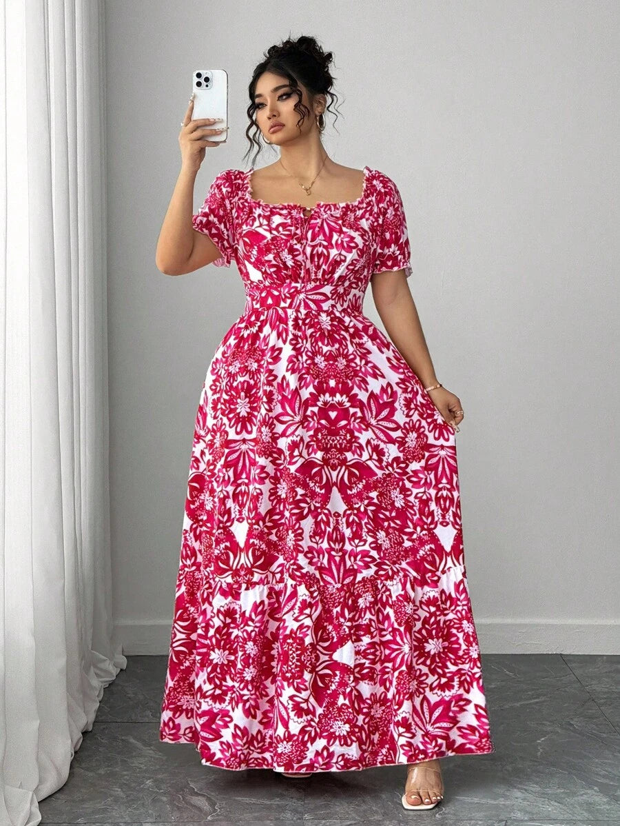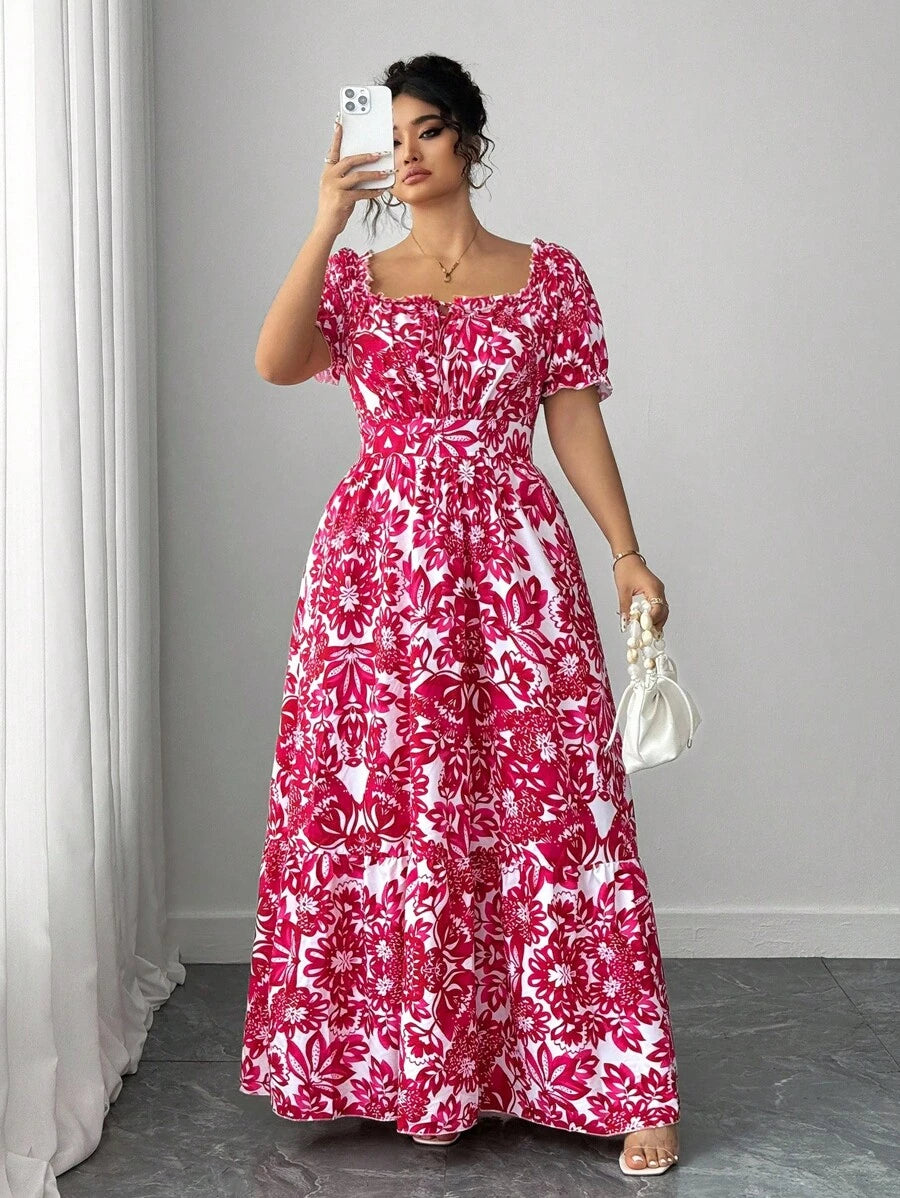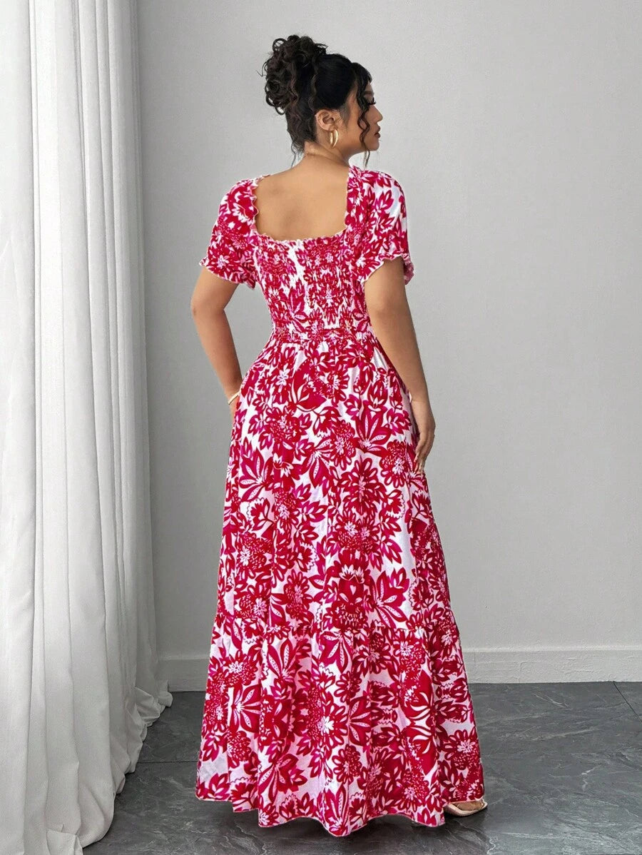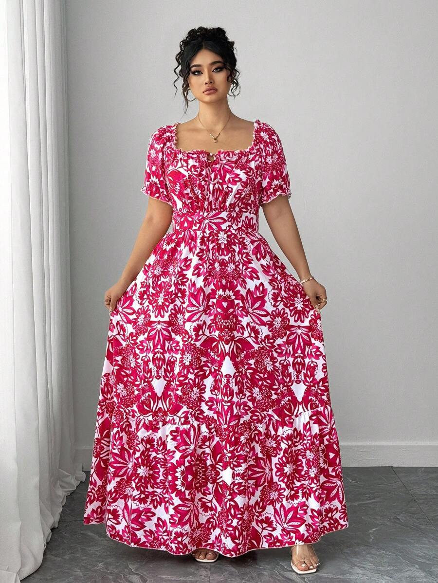 Vestido largo con cuello cuadrado, mangas abullonadas y espalda descubierta para mujer de talla grande, estilo casual de resort elegante, adecuado para primavera y verano