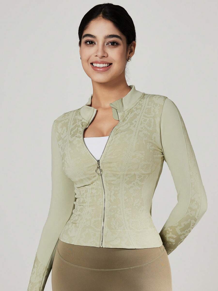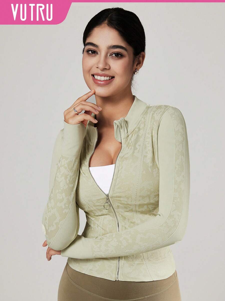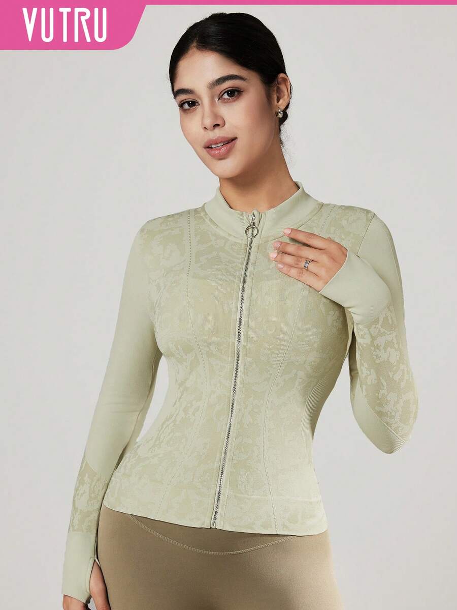 Vutru chaqueta deportiva de tela jacquard brillante, top de cuello alto para yoga y correr, otono/invierno