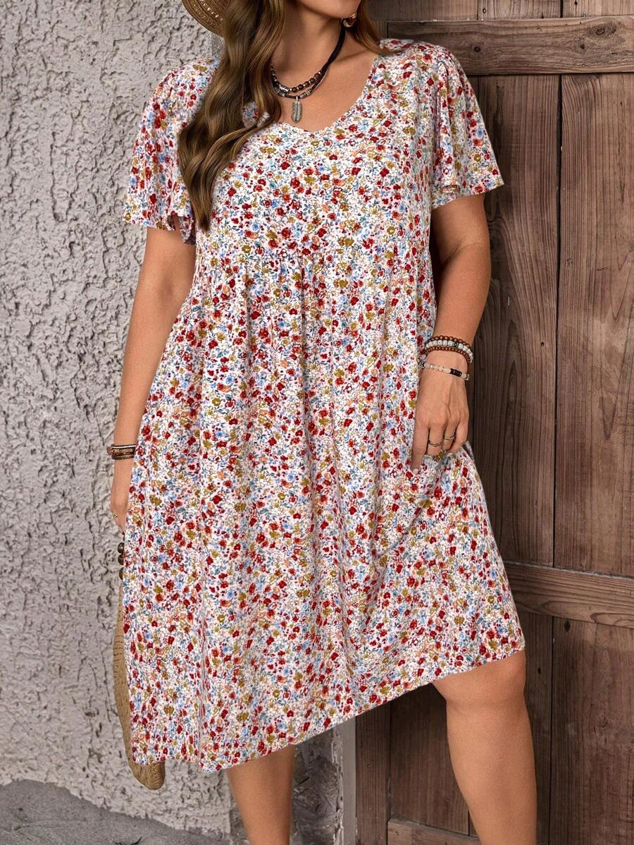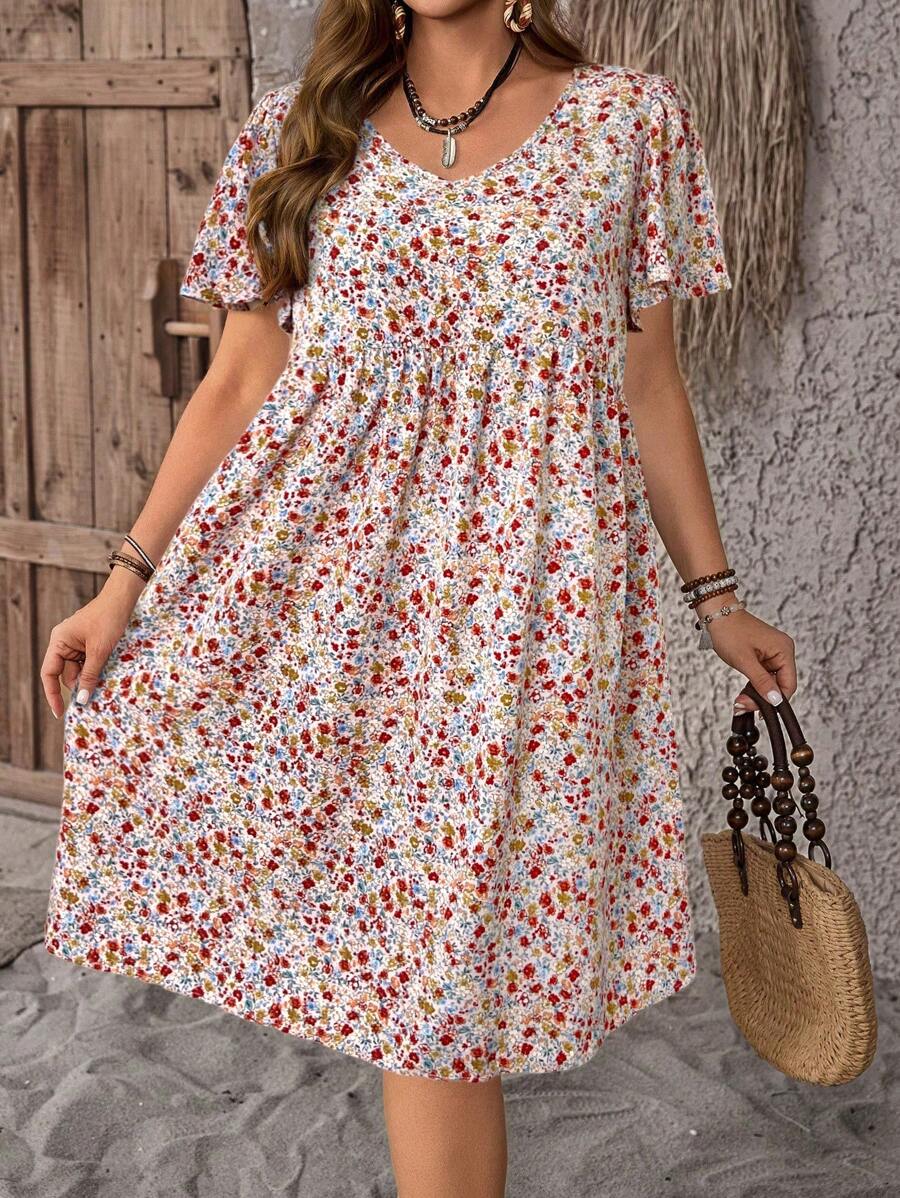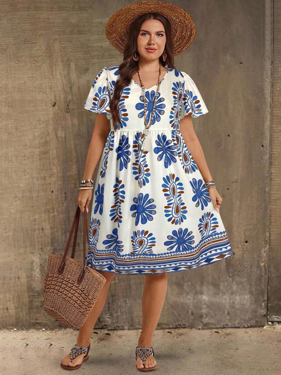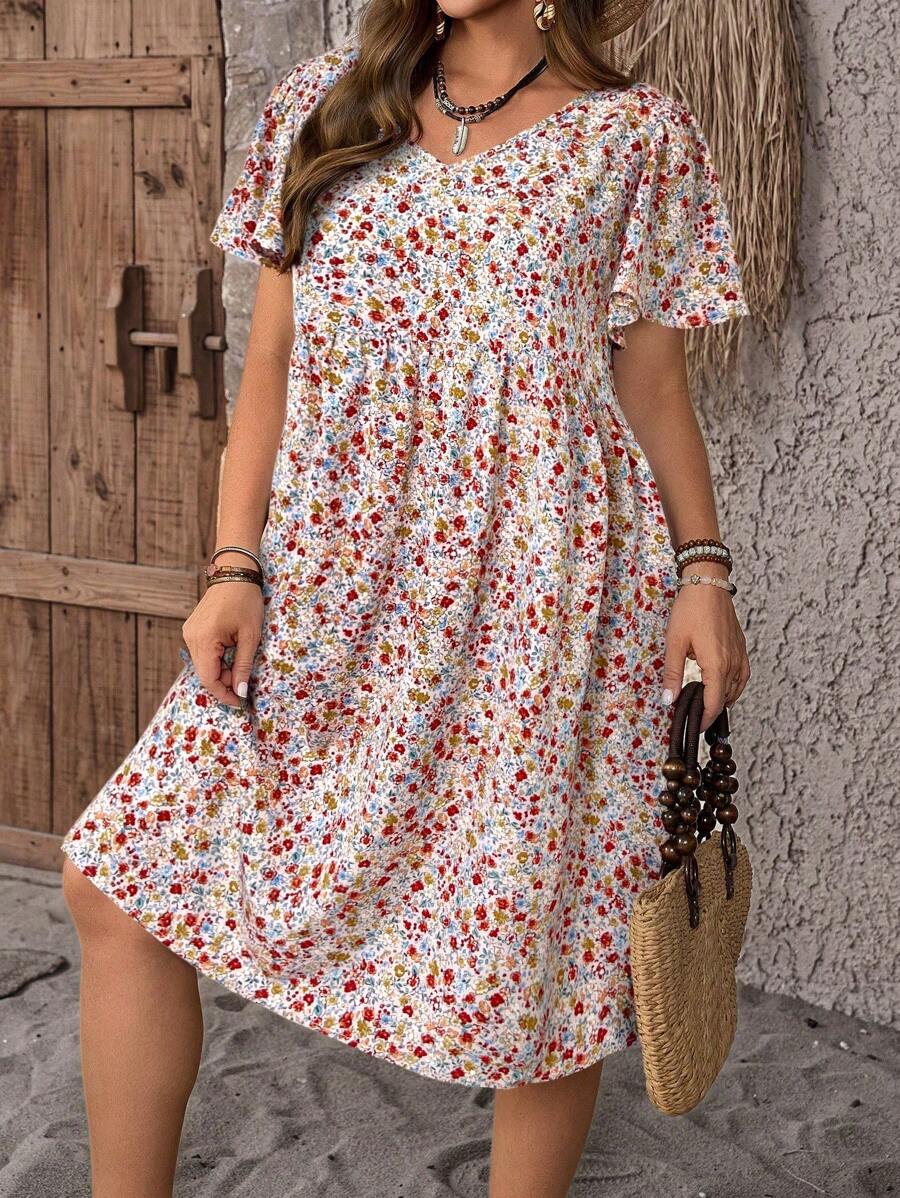 Vestido casual holgado con estampado floral y mangas con volantes para mujer de talla grande