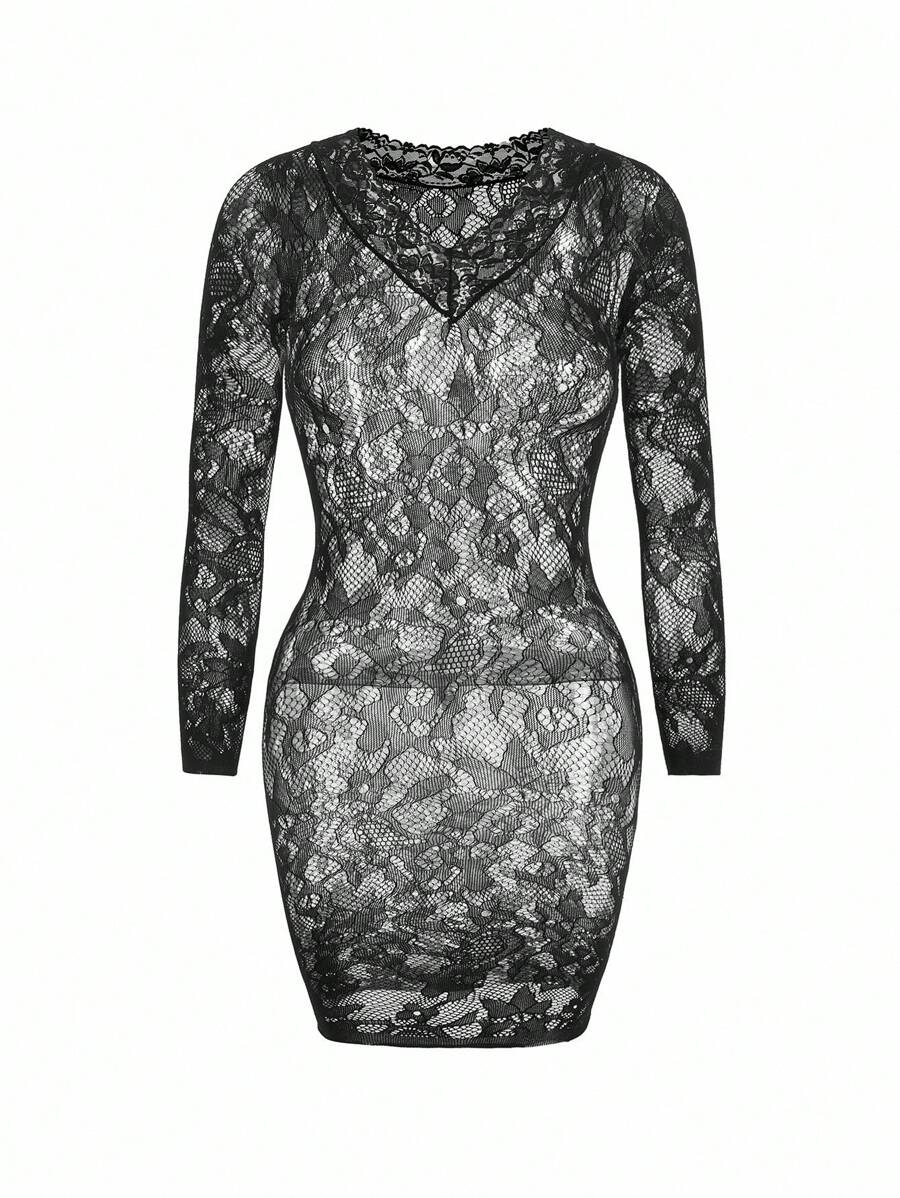 Chasethenight vestido negro de malla con cuello en v, mangas largas y detalles de encaje en un ajuste favorecedor, lenceria de encaje transparente, body de lenceria, para salir