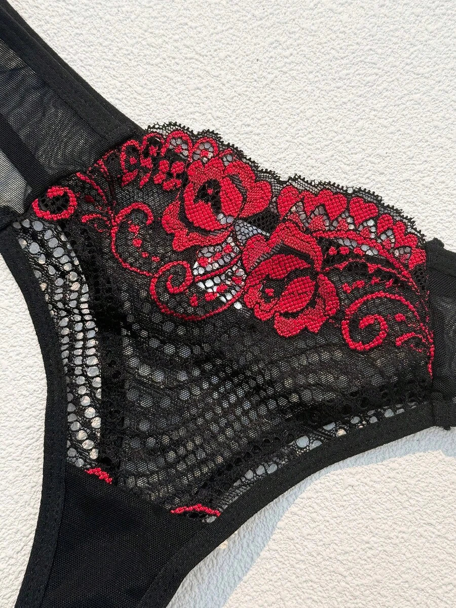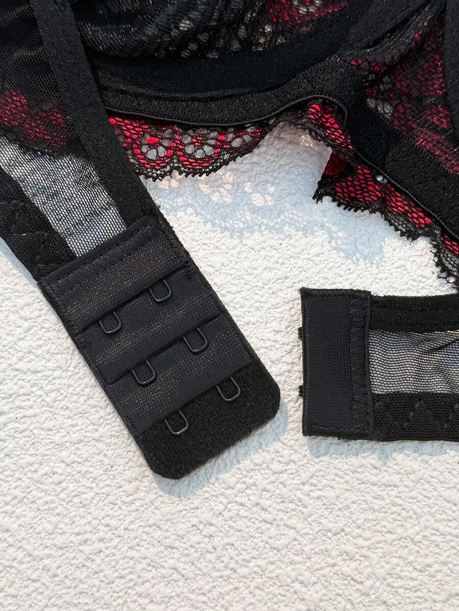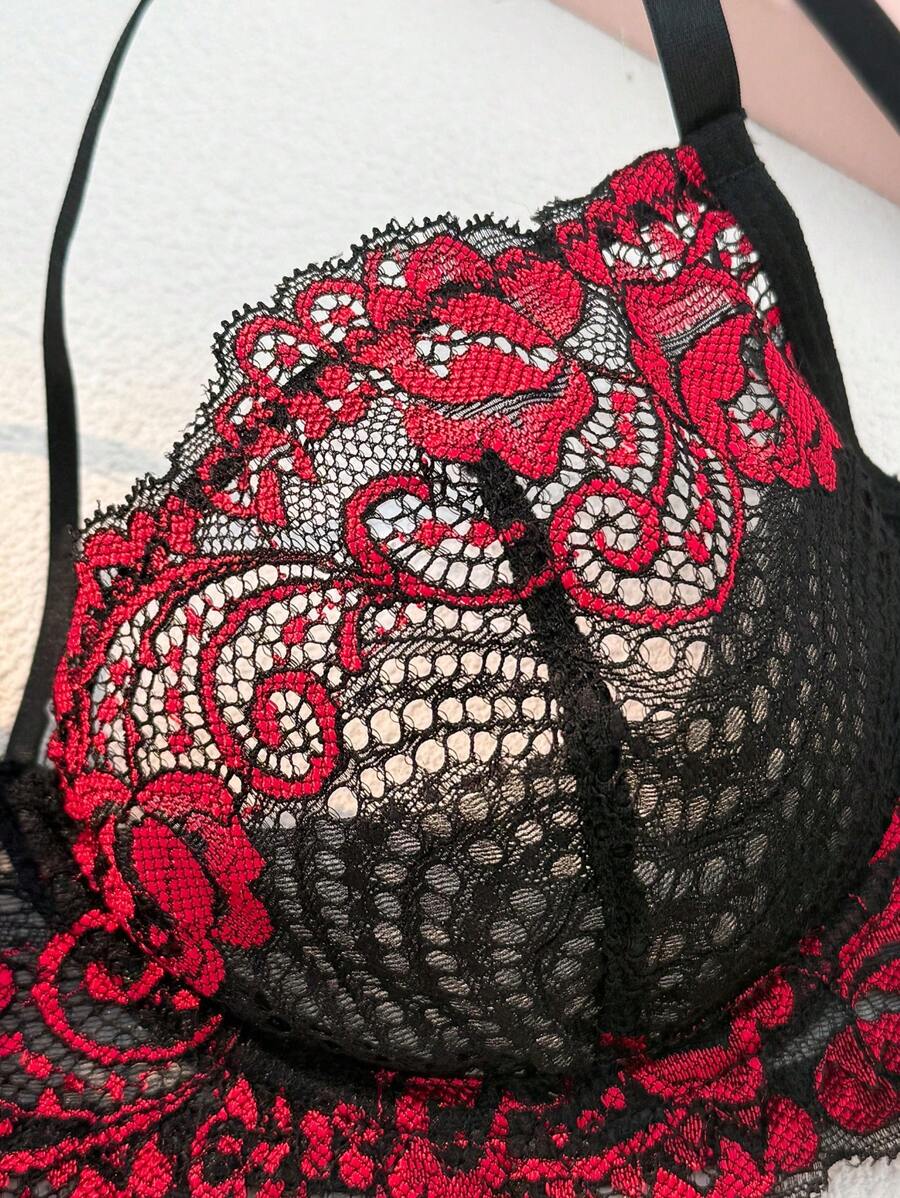 2 piezas conjunto de brasier y panty con borde de encaje negro y rojo, estilo gotico con contraste negro y rojo, ropa interior comoda y suave para mujer, adecuado para halloween
