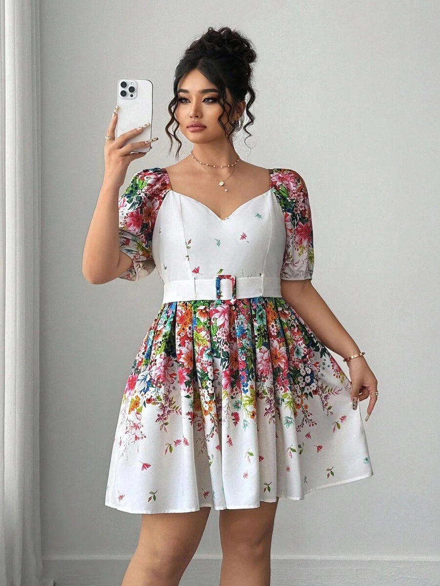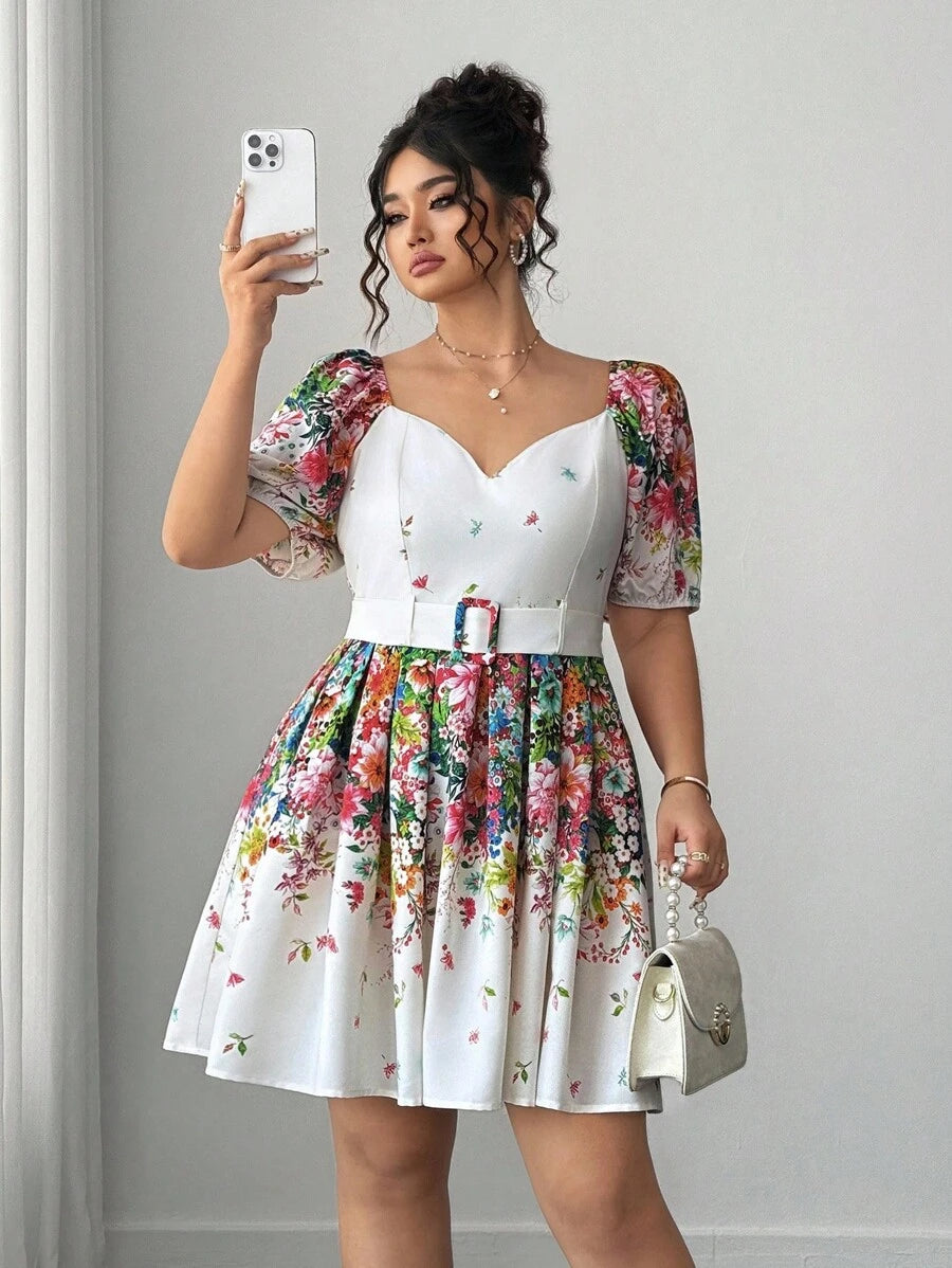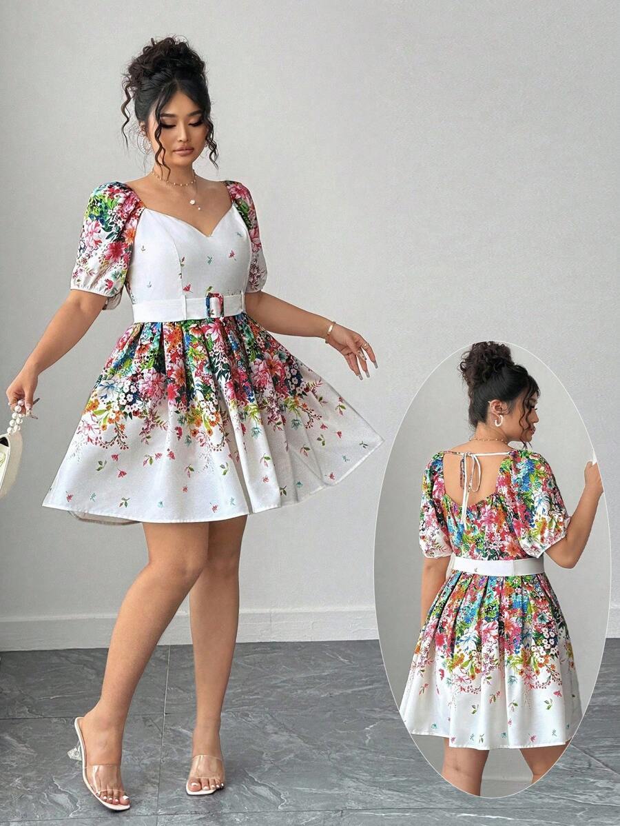 Vestido corto y mini elegante y de moda con diseno de cuello de corazon y cintura cenida, con estampado floral para mujer de talla grande