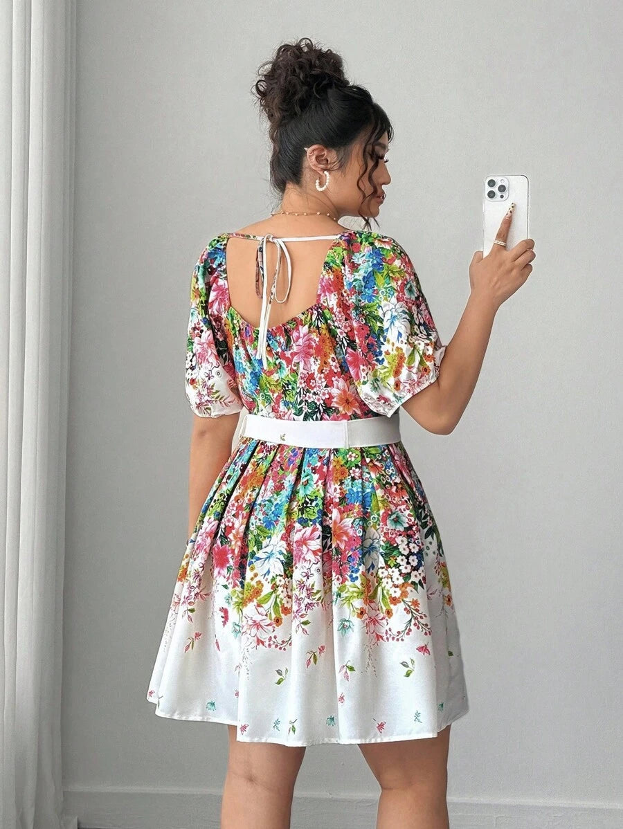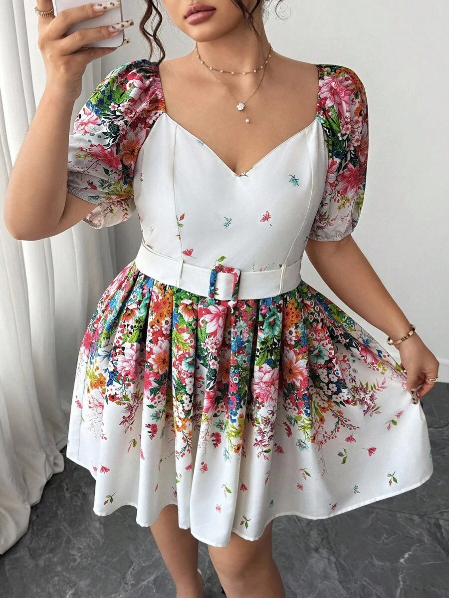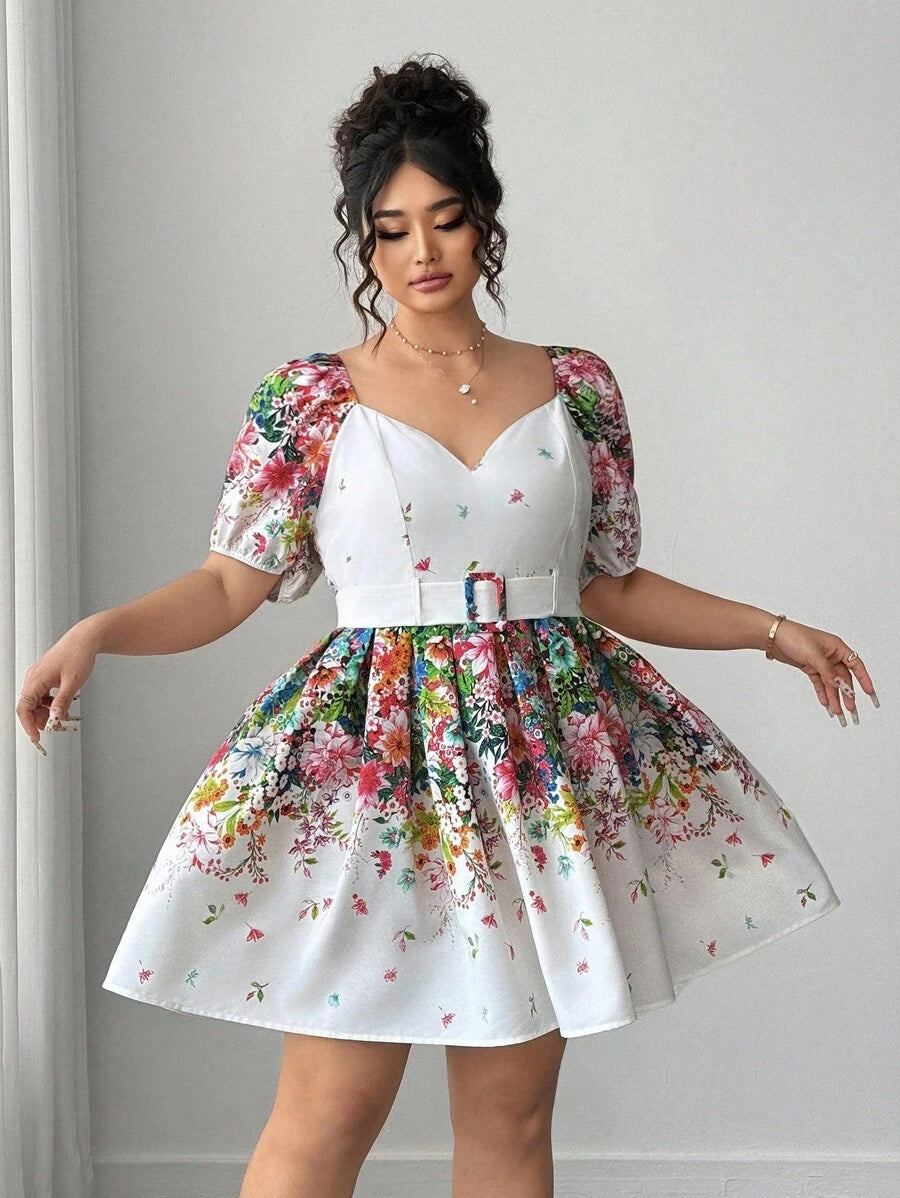Vestido corto y mini elegante y de moda con diseno de cuello de corazon y cintura cenida, con estampado floral para mujer de talla grande