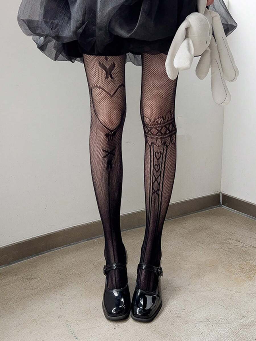 1 pieza medias de red con diseno de corazon estilo y2k, pantimedia transparente y calada, mallas negras vintage estilo lolita