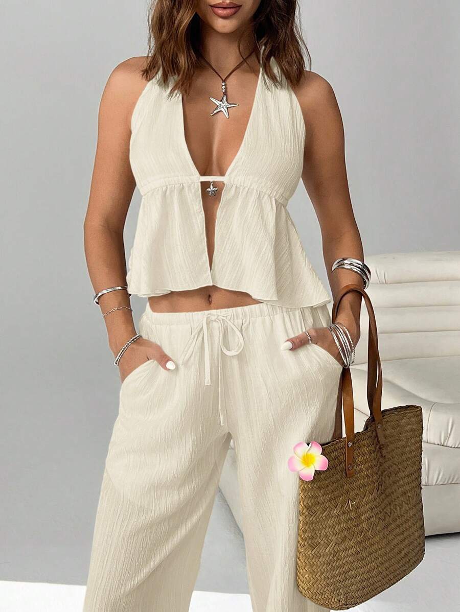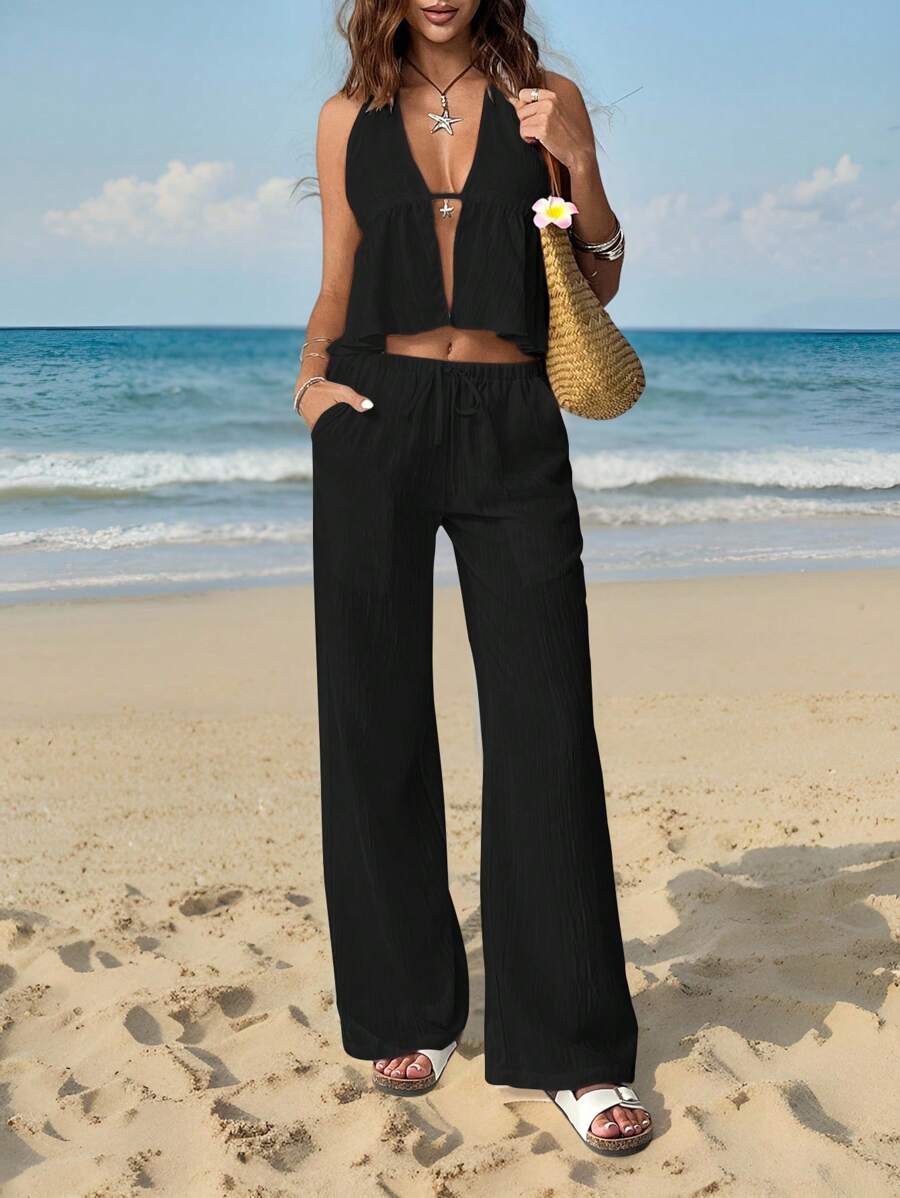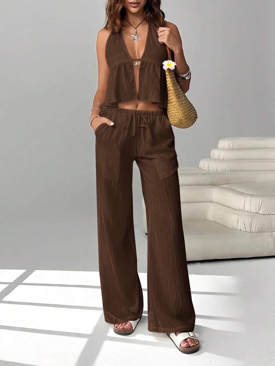 2 piezas conjunto de top halter y pantalones casuales de vacaciones para mujer