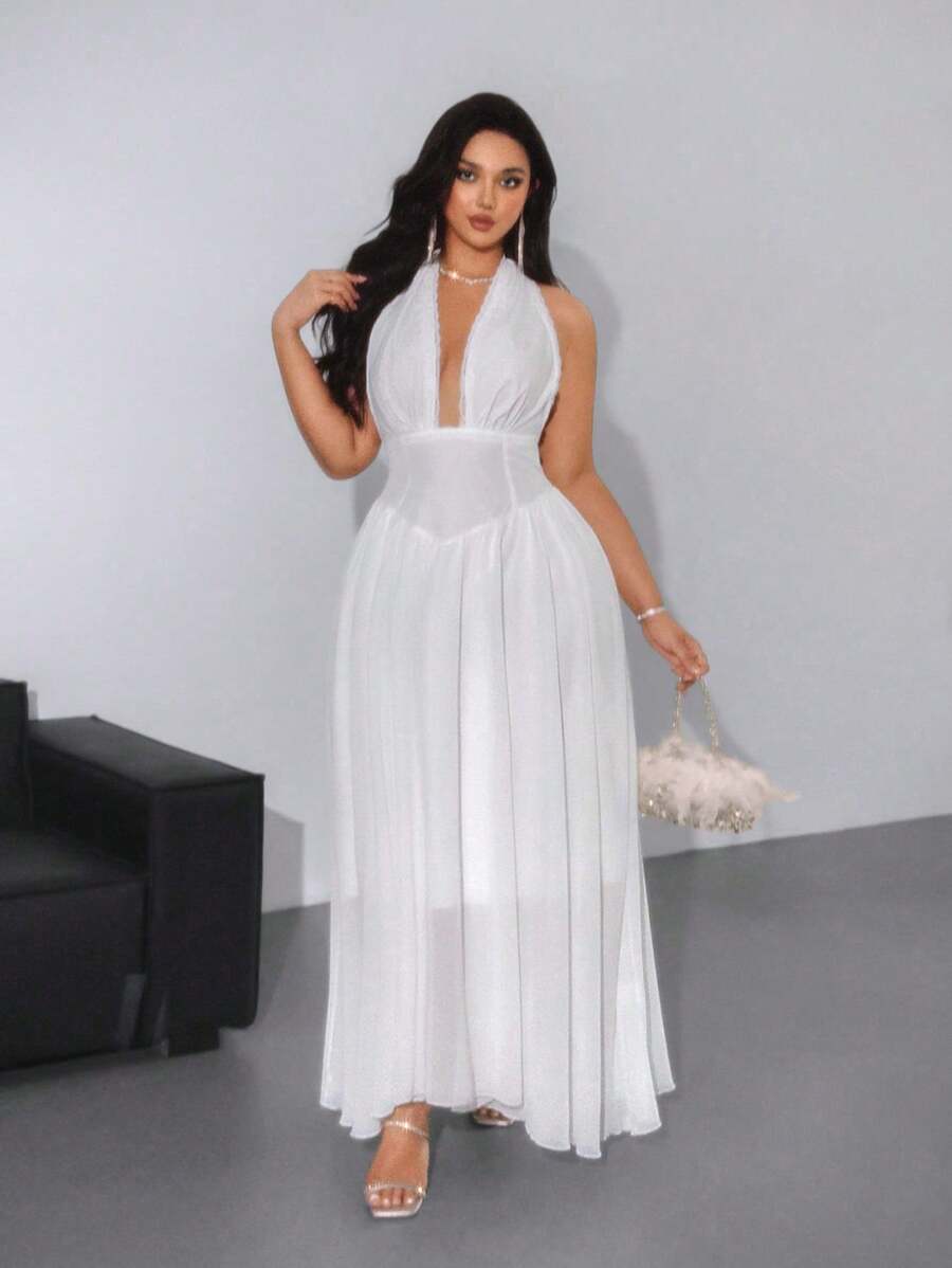Viva relle vestido largo vintage romantico y dulce de unicolor con cintura cenida para mujer de talla grande