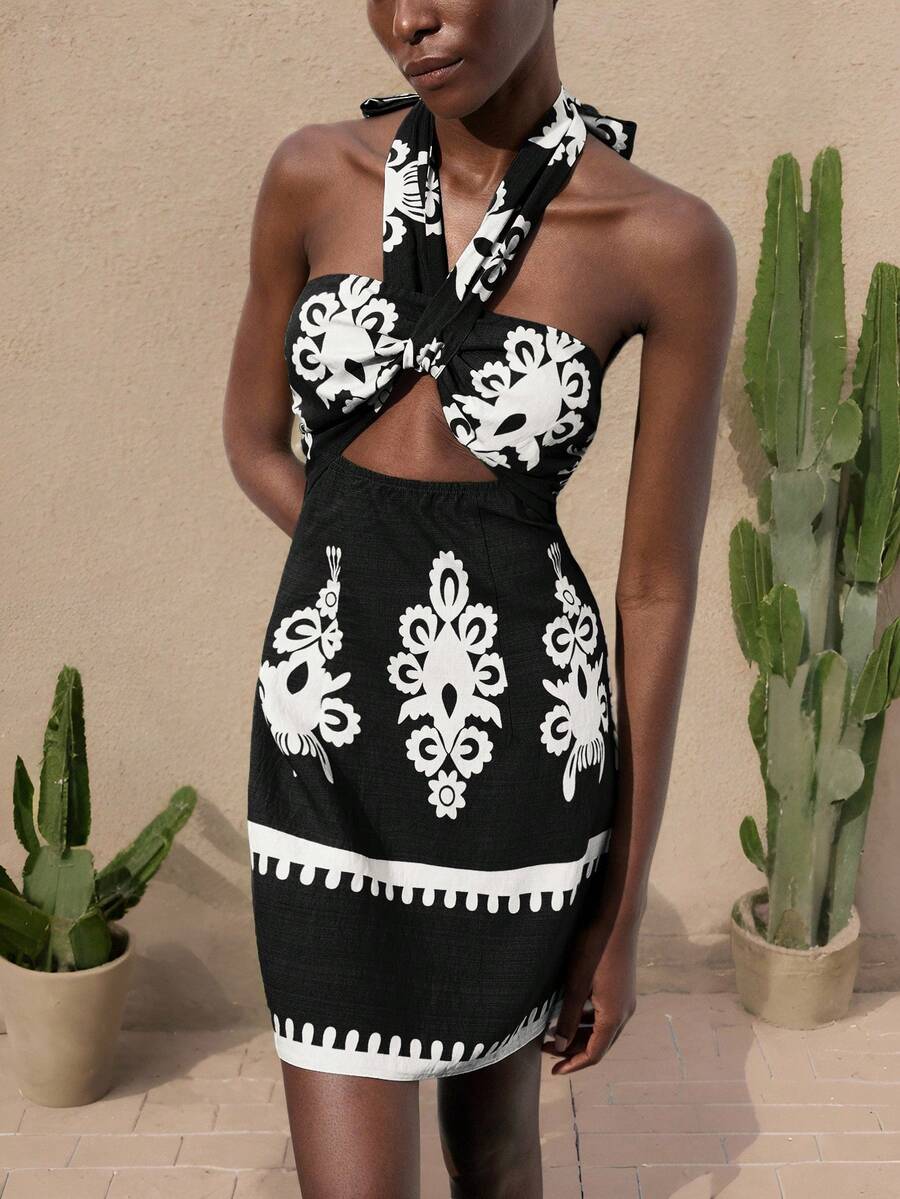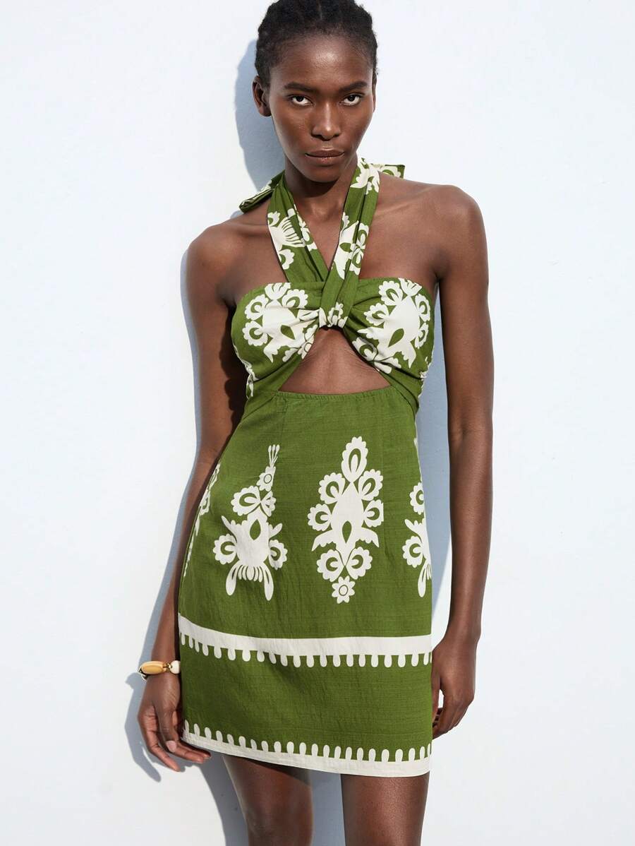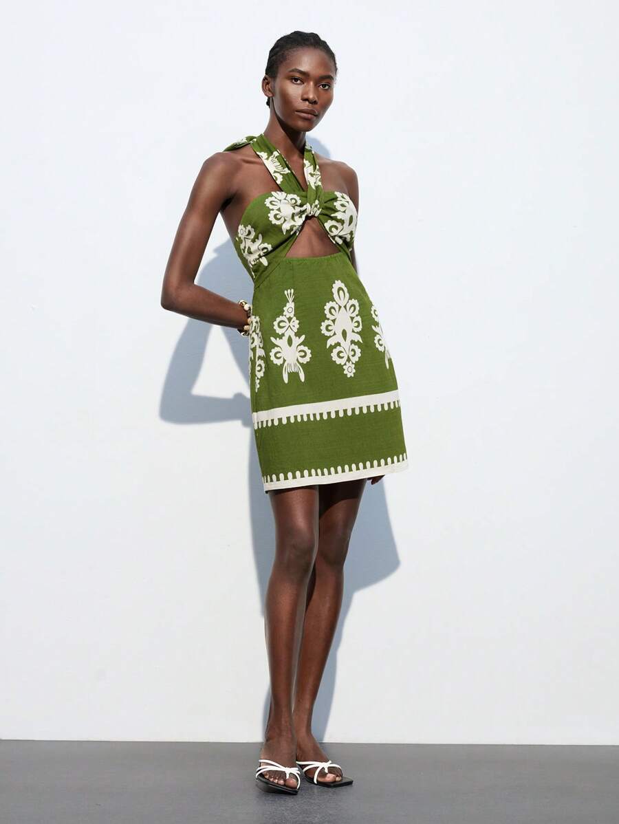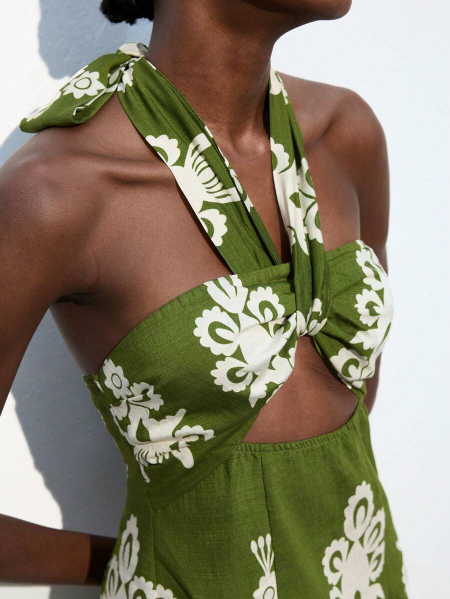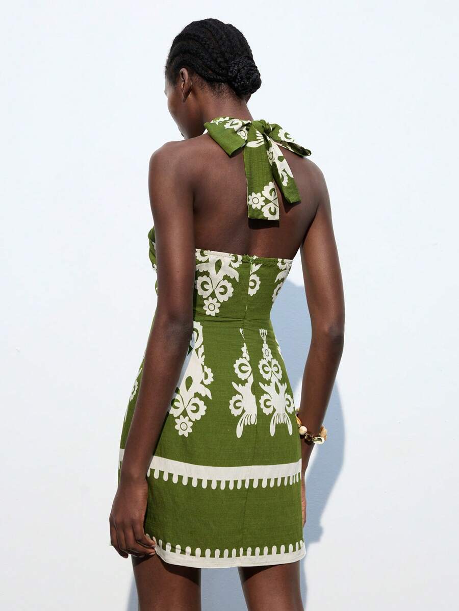 Vestido verde de verano para mujer, cuello halter con nudo, estampado floral, cintura elastica, cremallera lateral, elegante vestido bohemio de playa y vacaciones mini