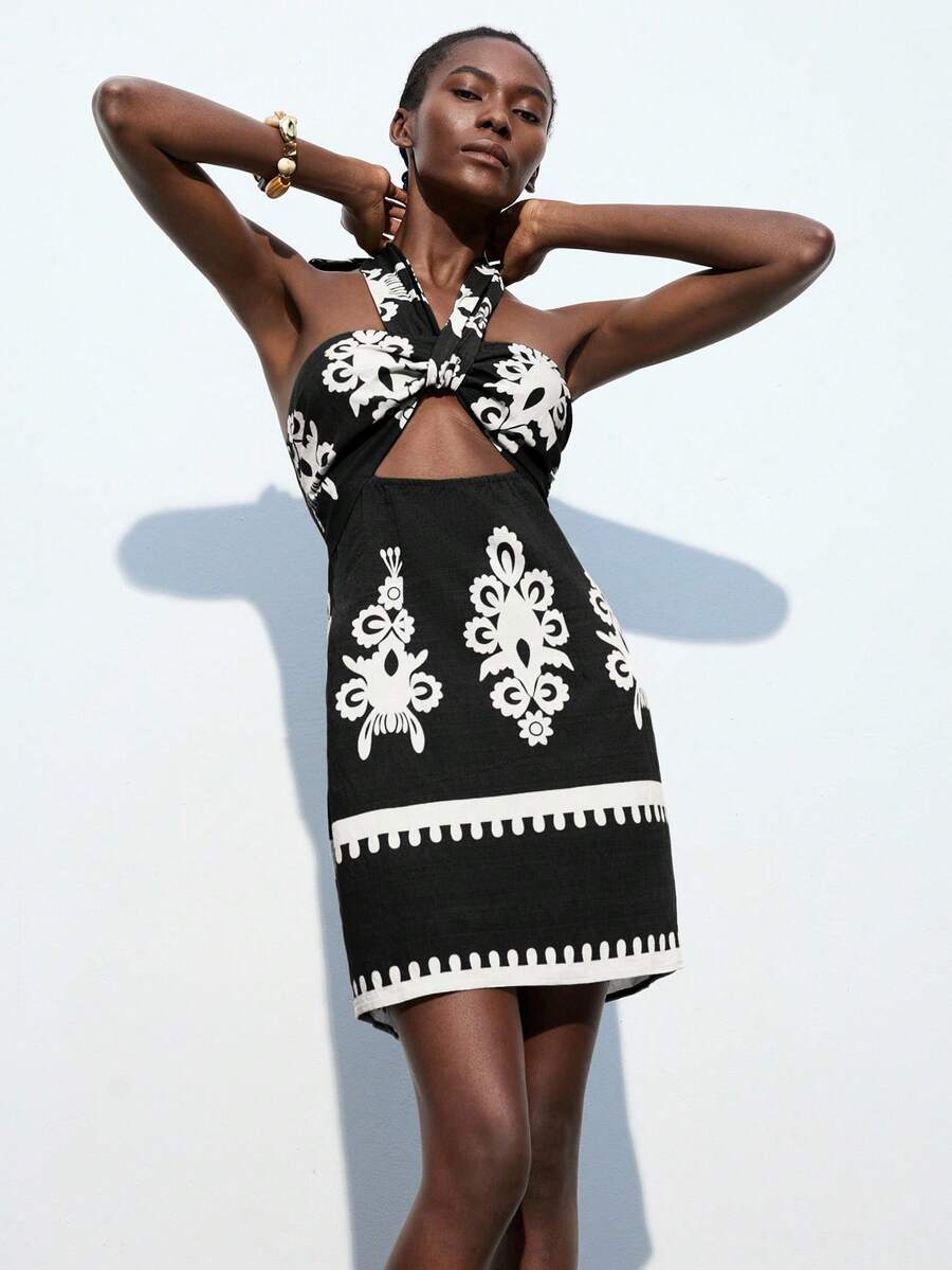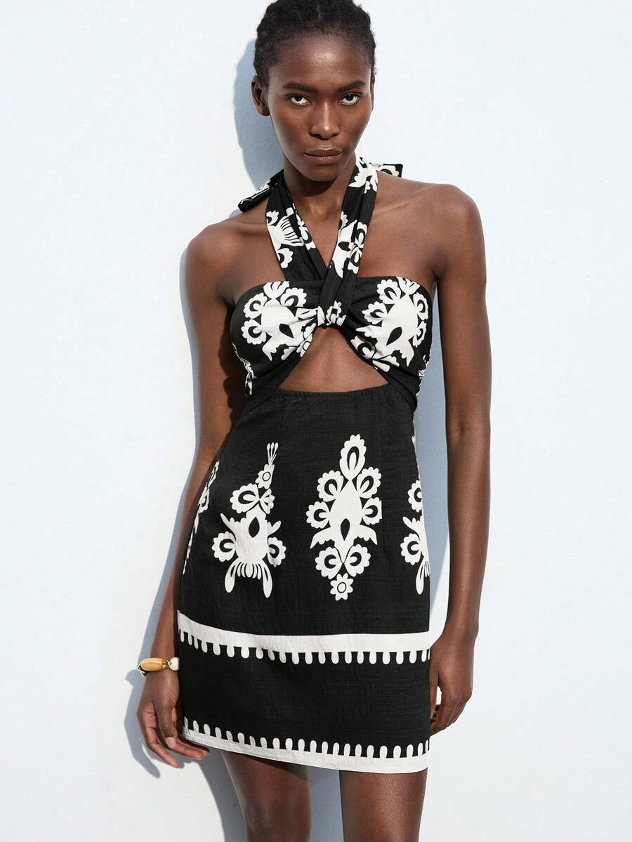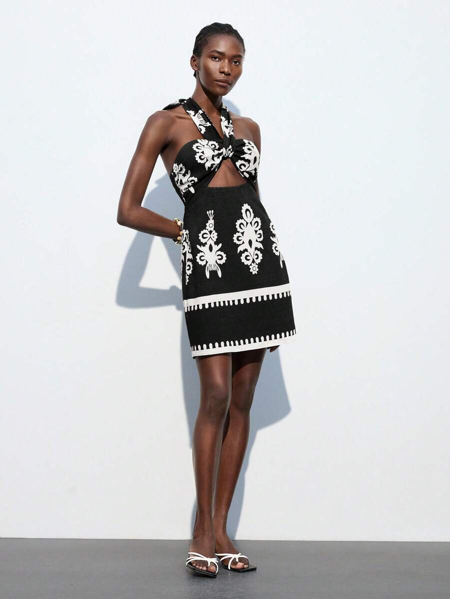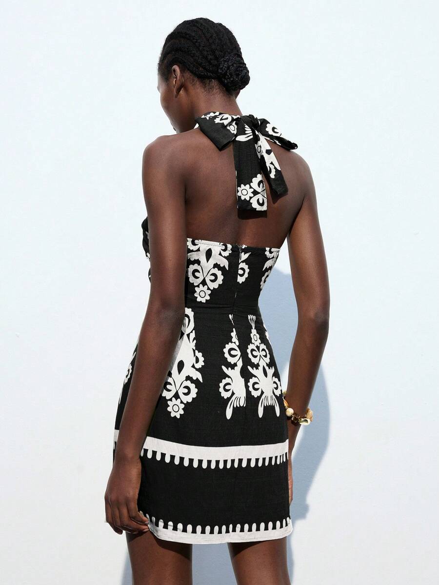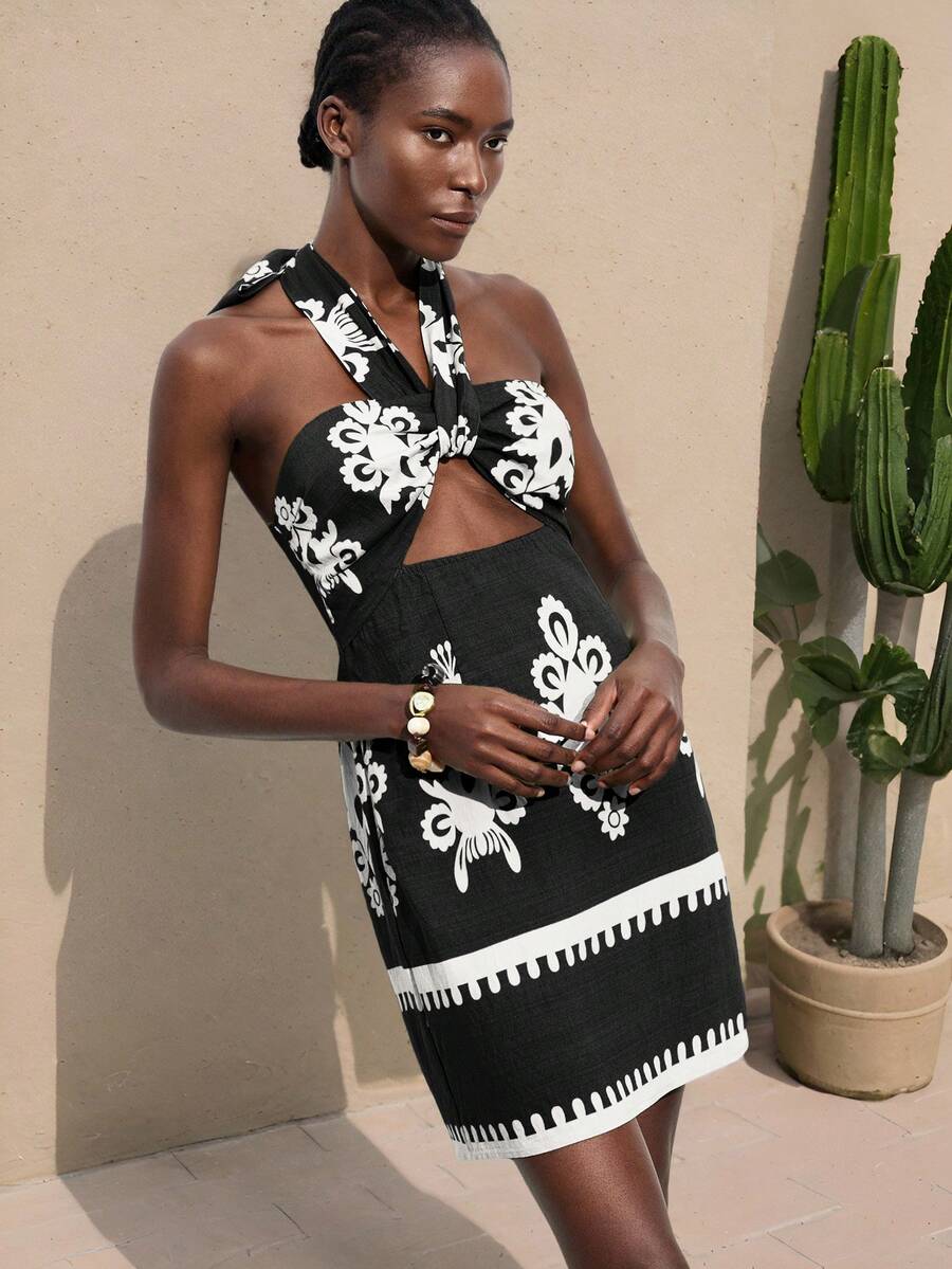 Vestido verde de verano para mujer, cuello halter con nudo, estampado floral, cintura elastica, cremallera lateral, elegante vestido bohemio de playa y vacaciones mini
