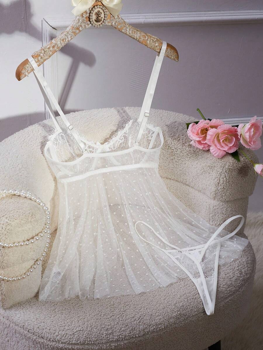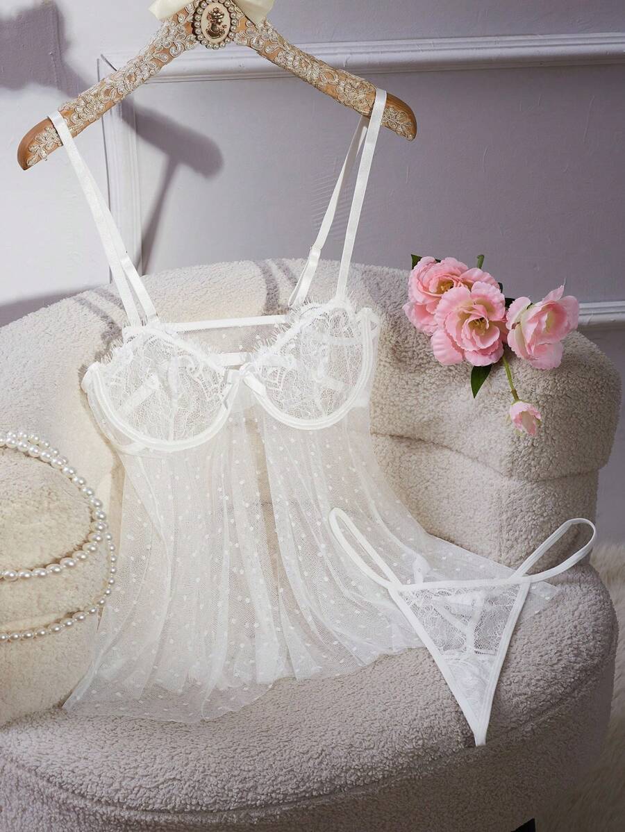 2 piezas conjunto de camison sexy con brasier con aros y encaje de lunares y malla para mujeres