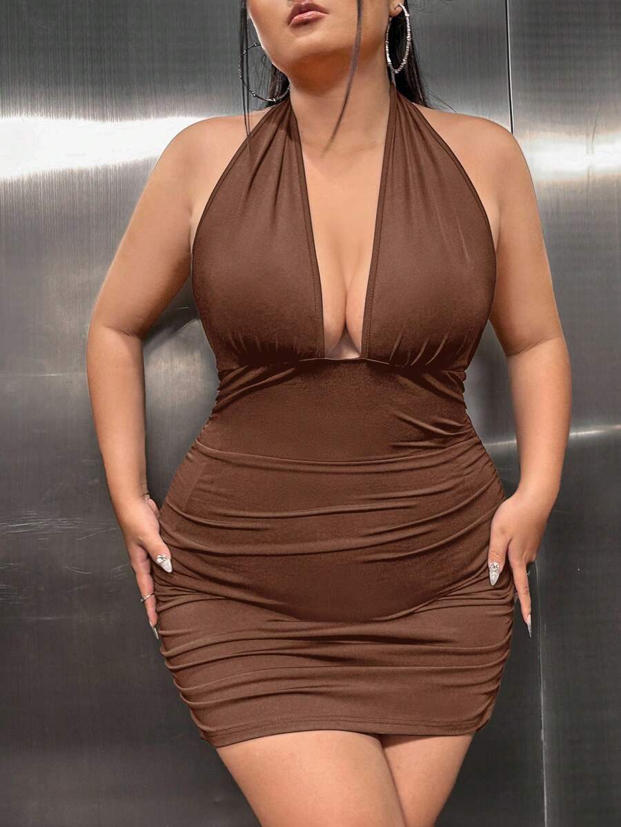 Vestido de verano con espalda descubierta, cuello halter y fruncido, de unicolor y talla grande