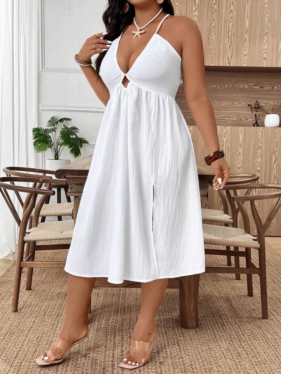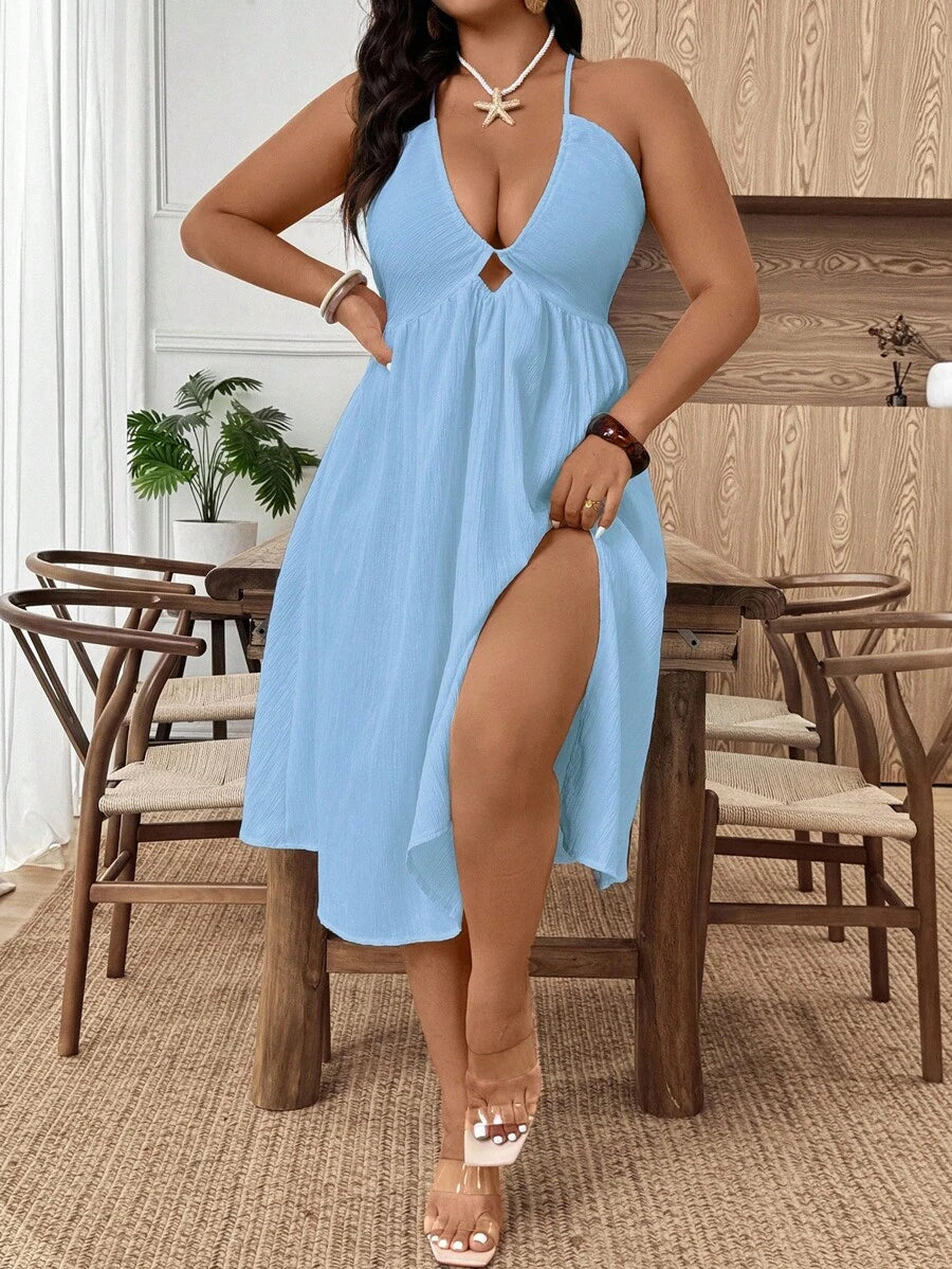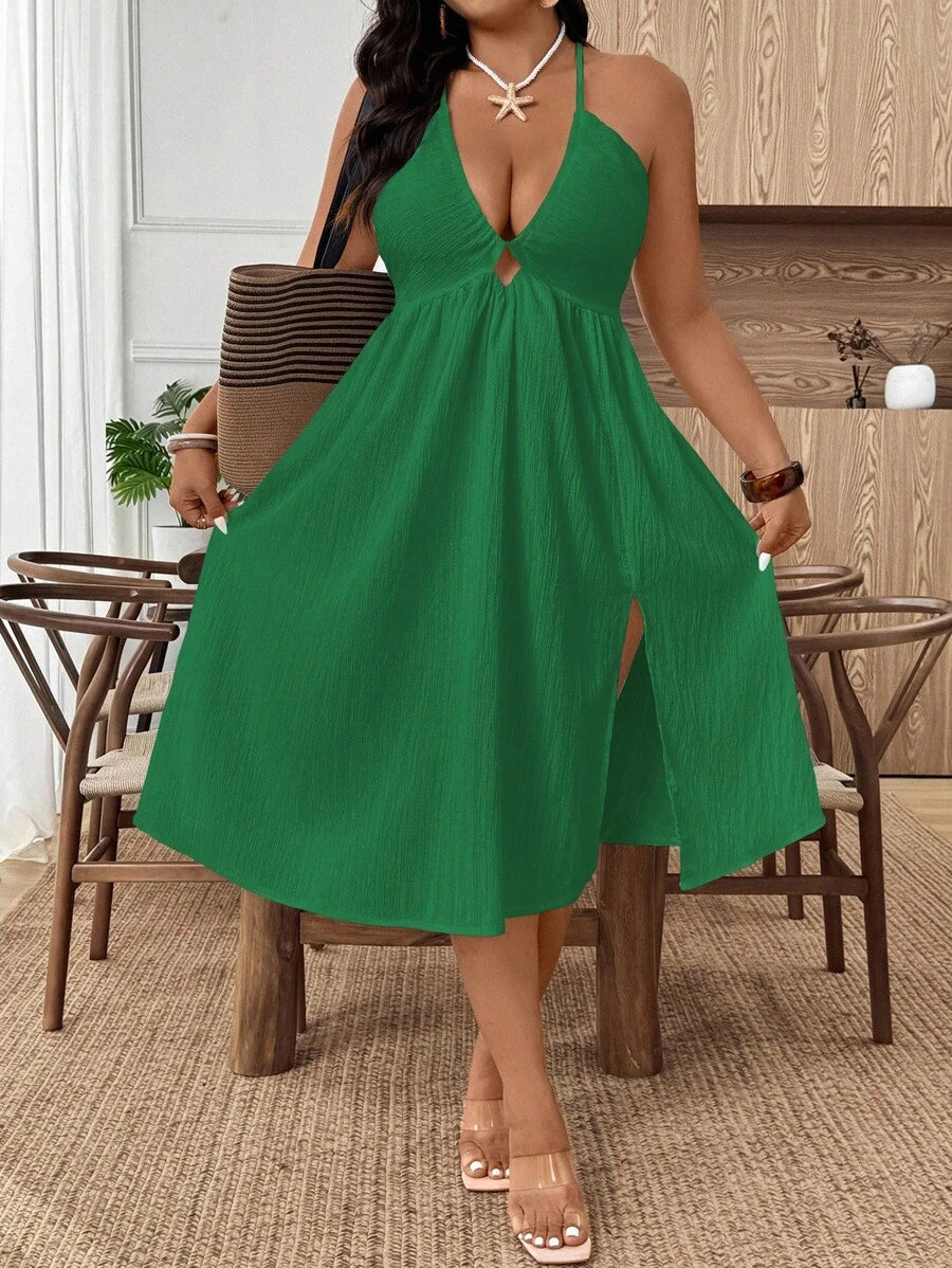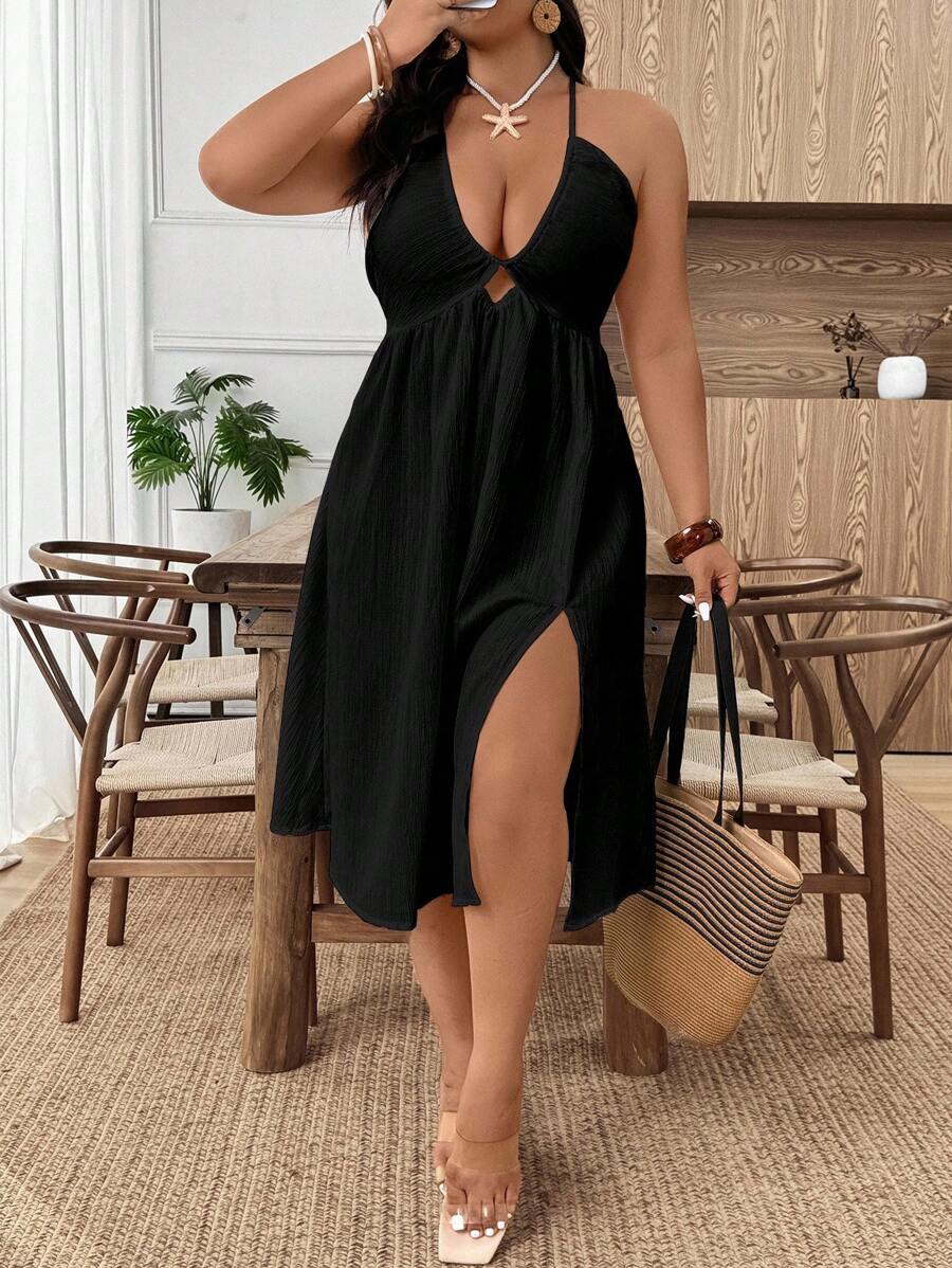 Vestido maxi sexy de talla grande para mujer con cuello en v profundo, abertura lateral y dobladillo para vacaciones de unicolor