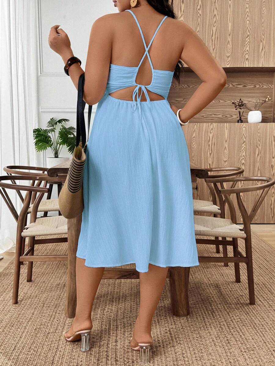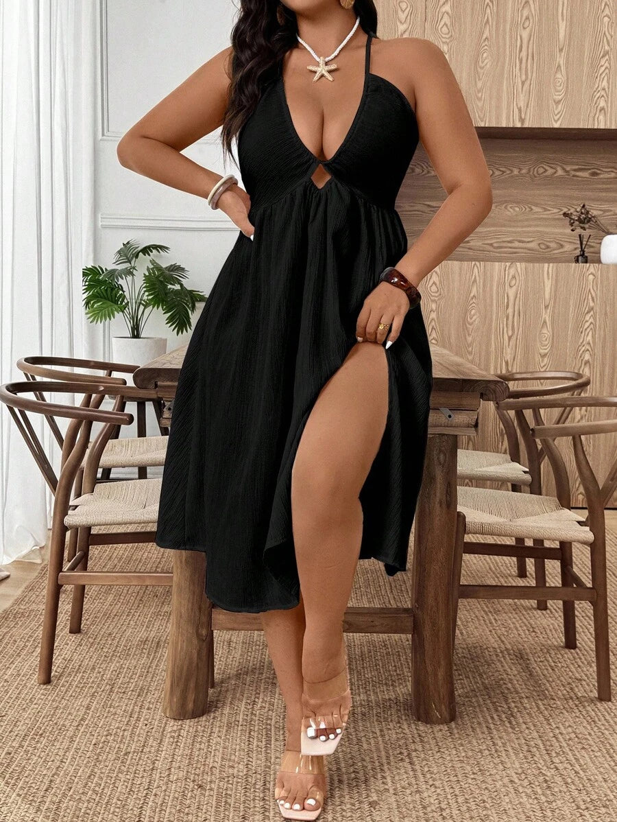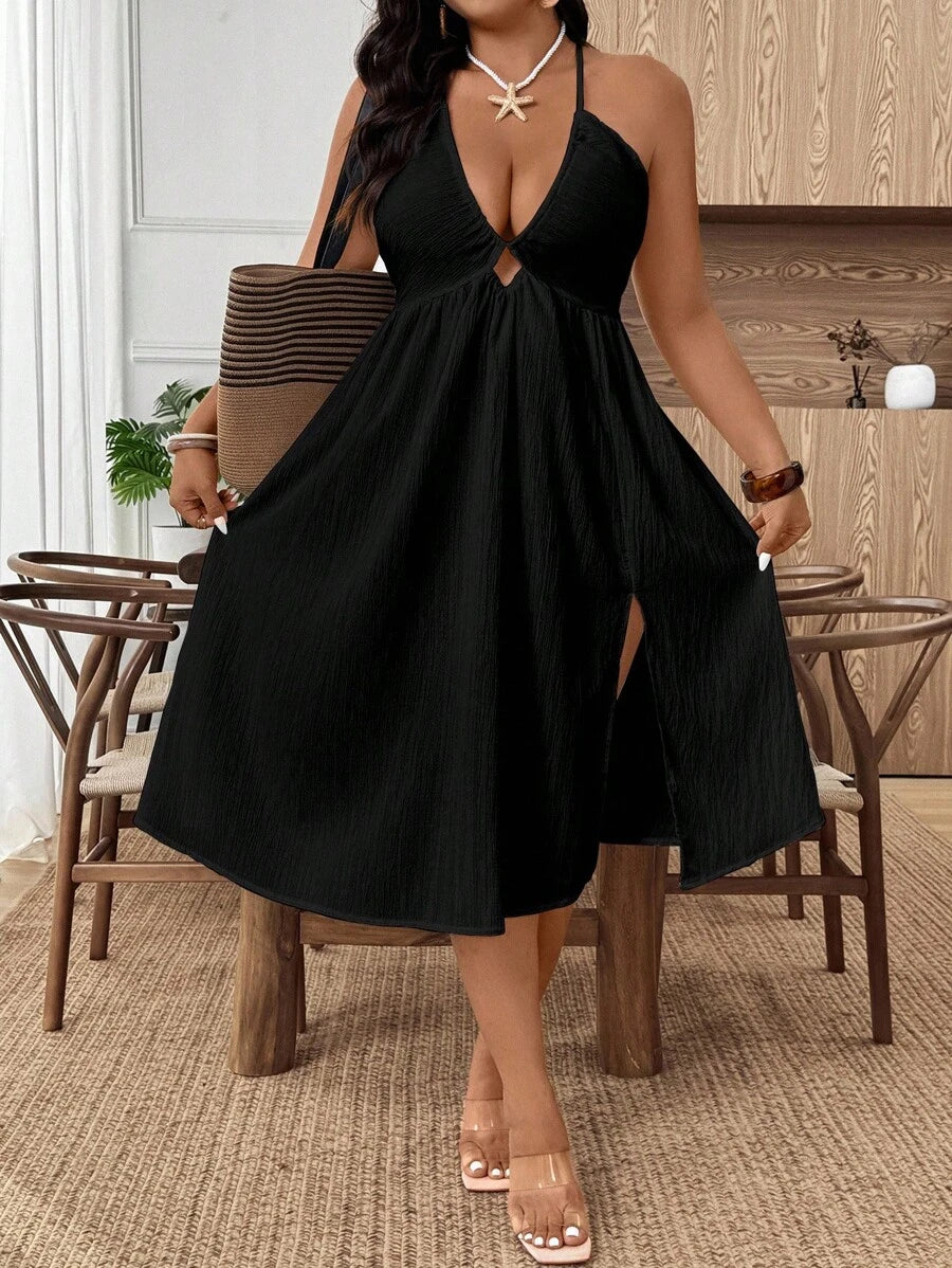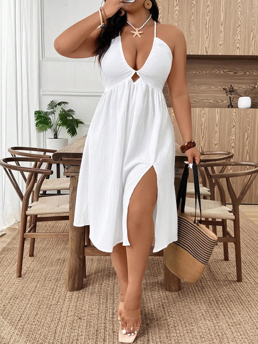 Vestido maxi sexy de talla grande para mujer con cuello en v profundo, abertura lateral y dobladillo para vacaciones de unicolor
