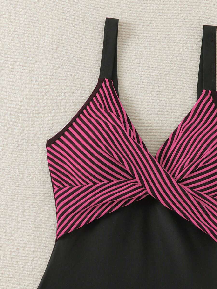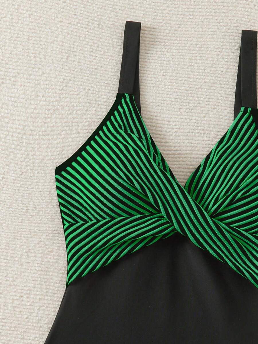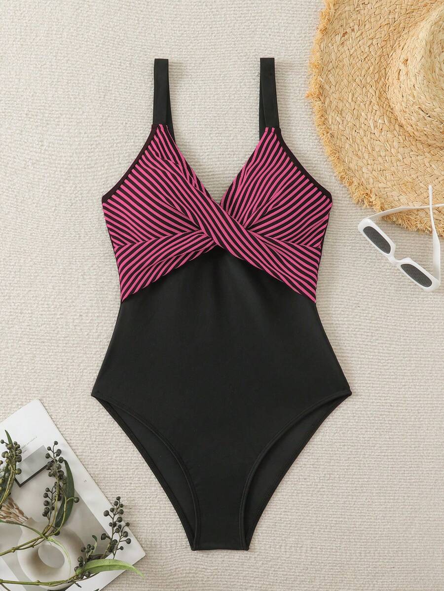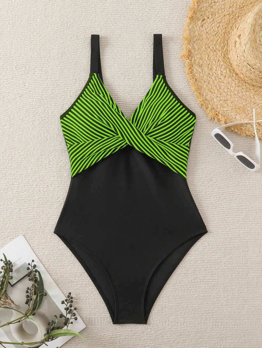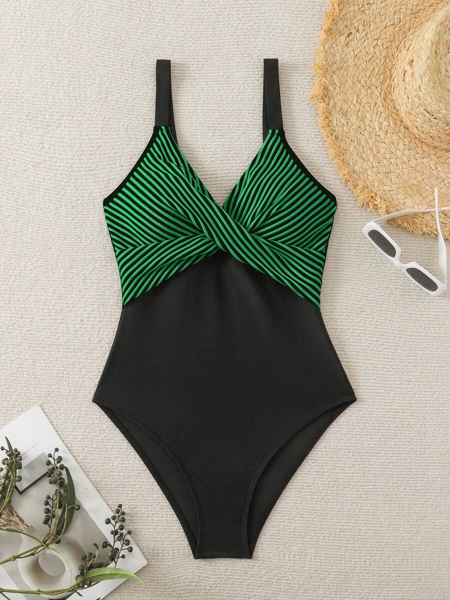 1 pieza traje de bano de una sola pieza con frente cruzado a rayas para mujer, ropa de vacaciones
