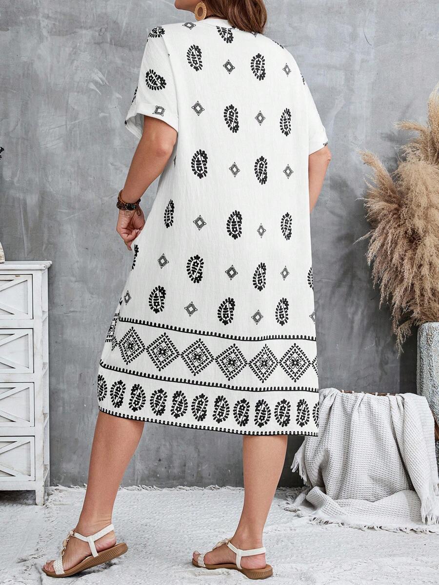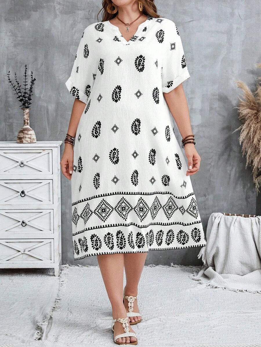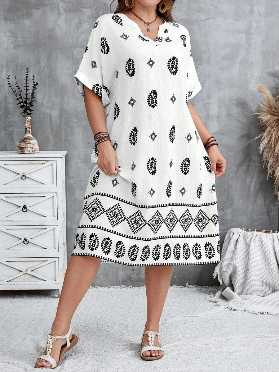 Vestido holgado de estilo de vacaciones de verano para mujer de talla grande con estampado de paisley, cuello con muesca y mangas tipo murcielago