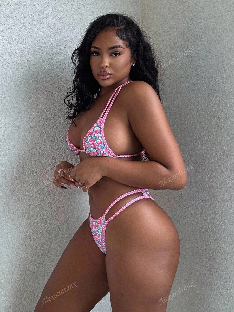 Alexandranx conjunto de 2 piezas para vacaciones de verano: bikini con top sin mangas con estampado de frutas en todo el diseno y detalles de contraste, y bottom con tiras laterales