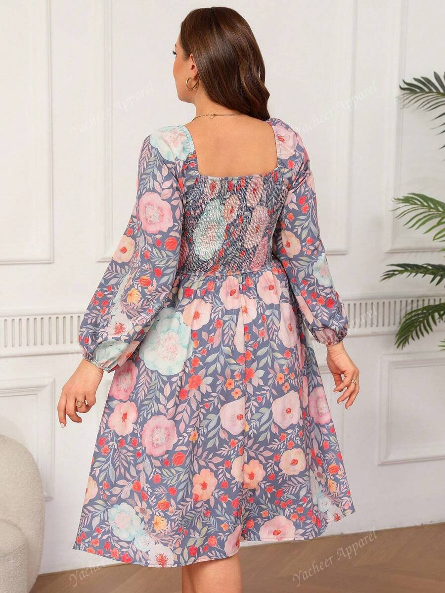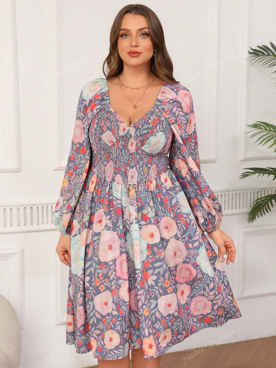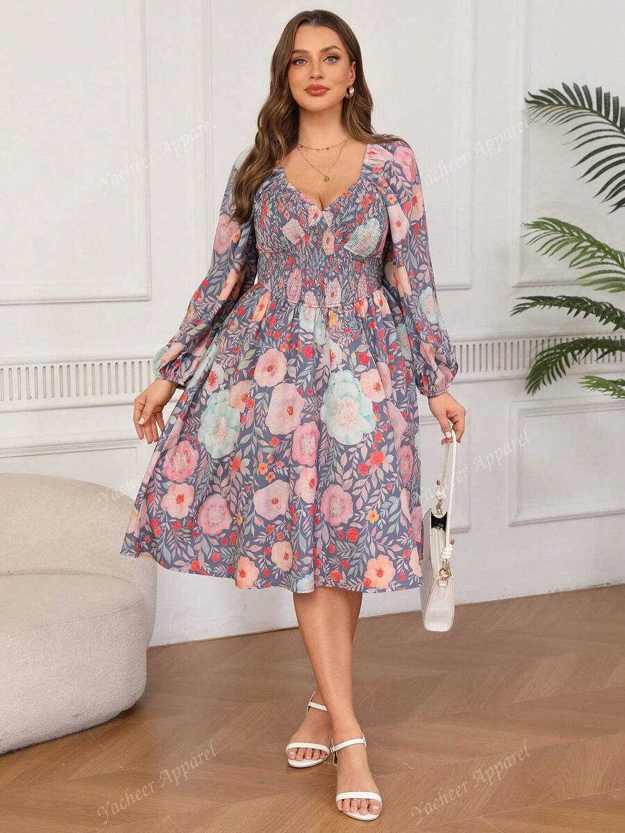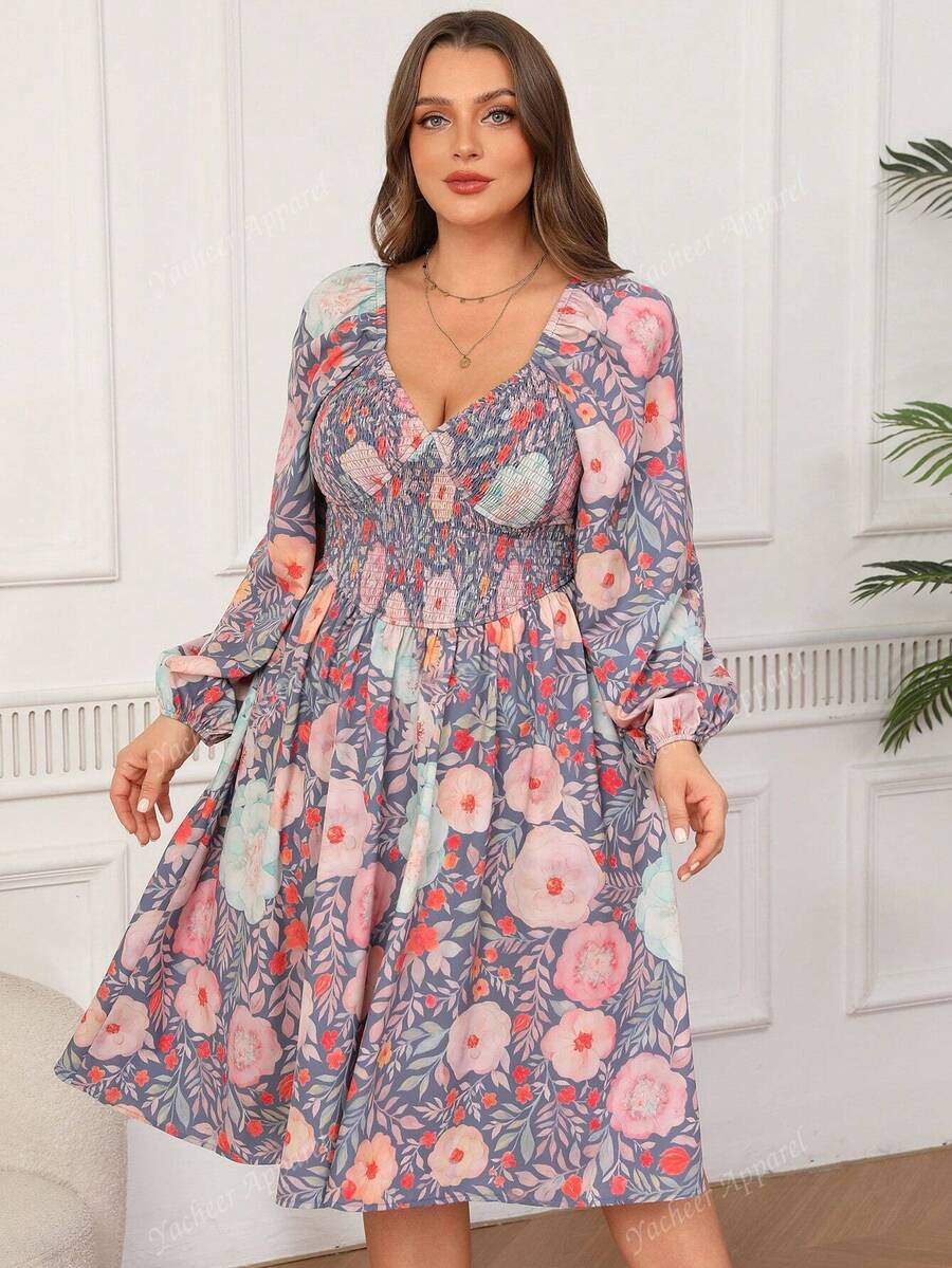 Vestido de linea a con cuello de corazon, manga farol y cintura con cordon, con estampado floral para vacaciones en tallas grandes para mujeres