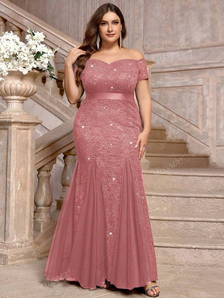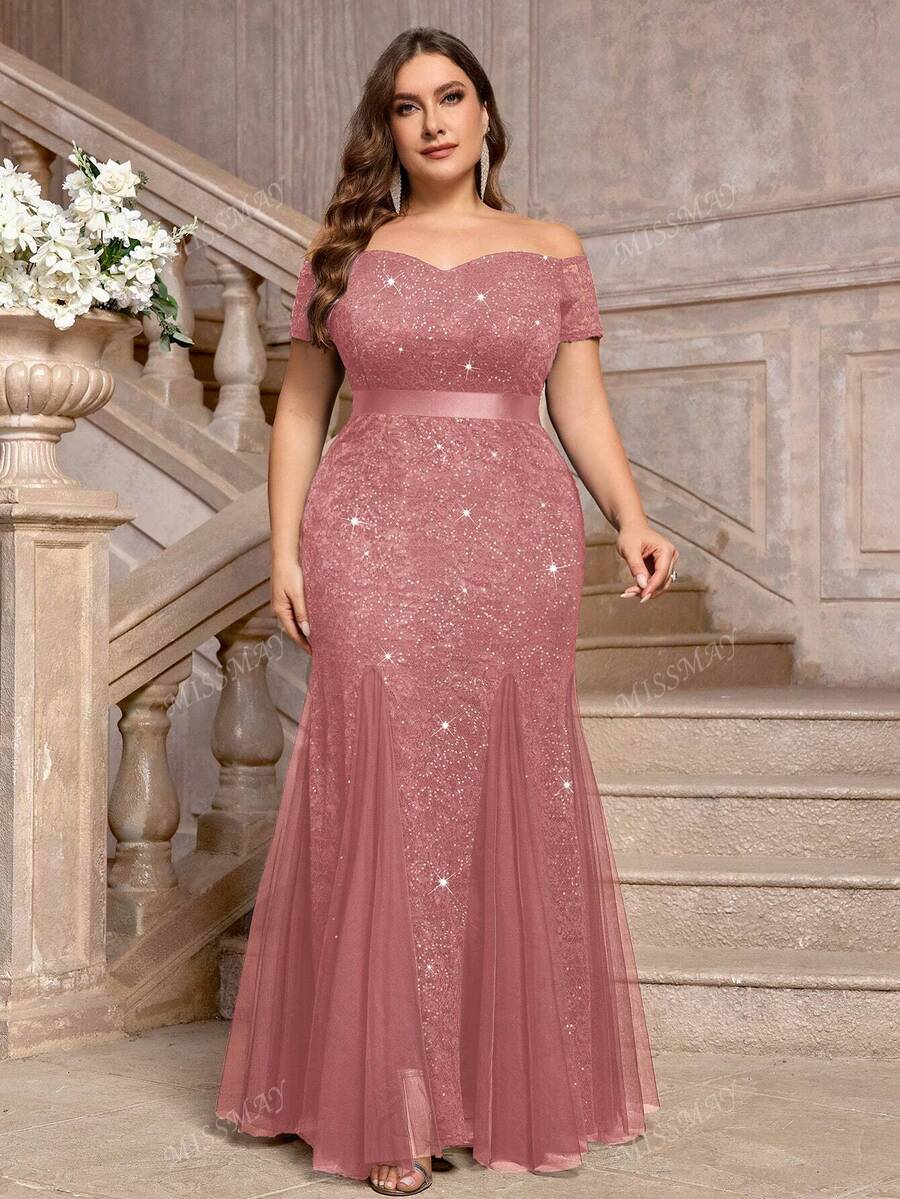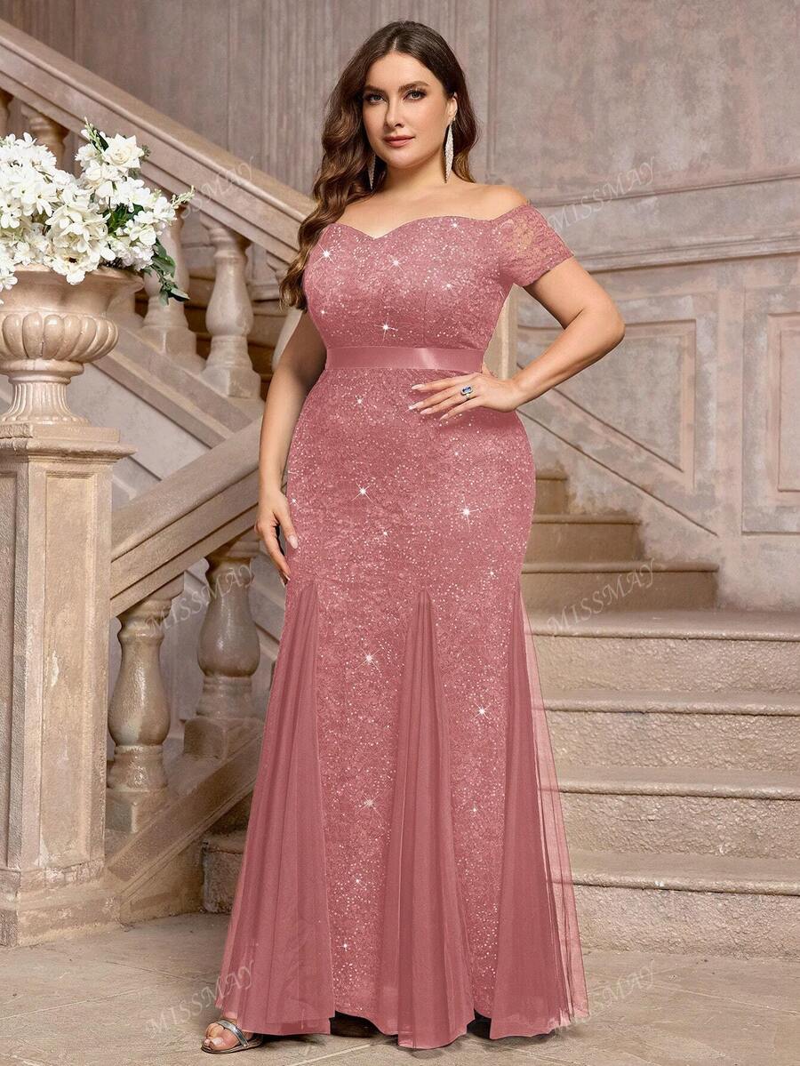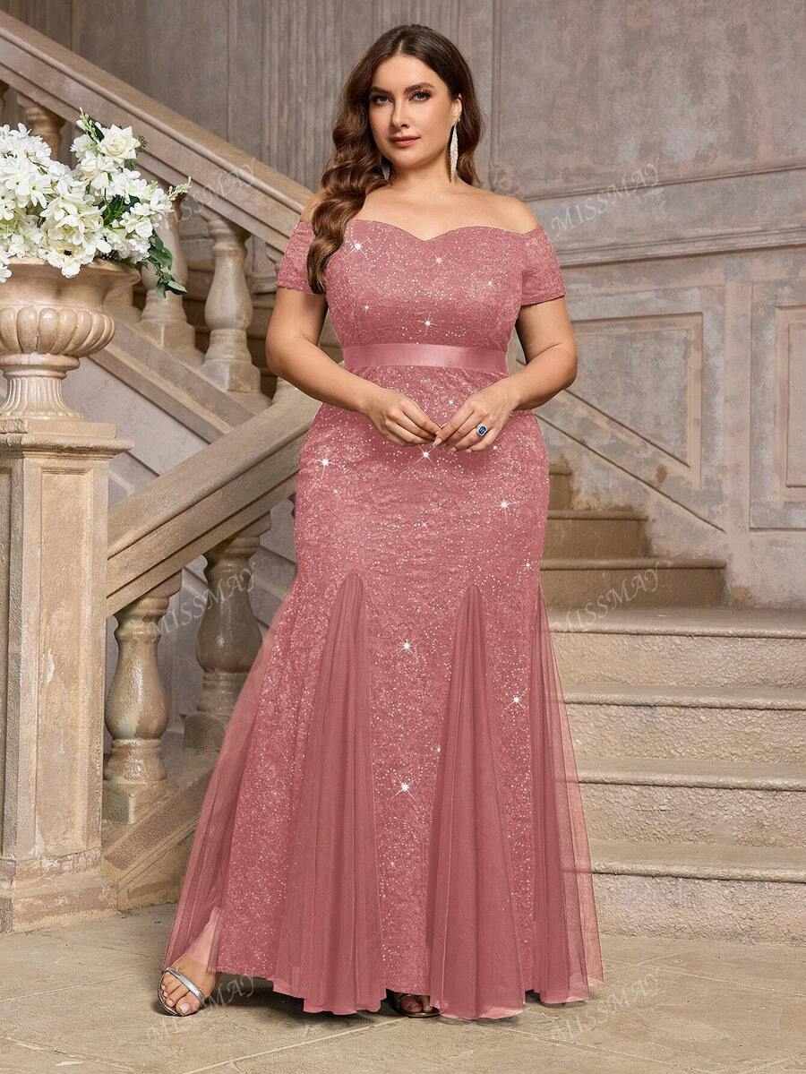 Vestido largo formal de fiesta con hombros descubiertos, encaje floral con lentejuelas, contraste de malla y dobladillo de cola de sirena, para tallas grandes. vestidos de otono, elegantes para baile de graduacion, invitada de boda, cumpleanos, cena,