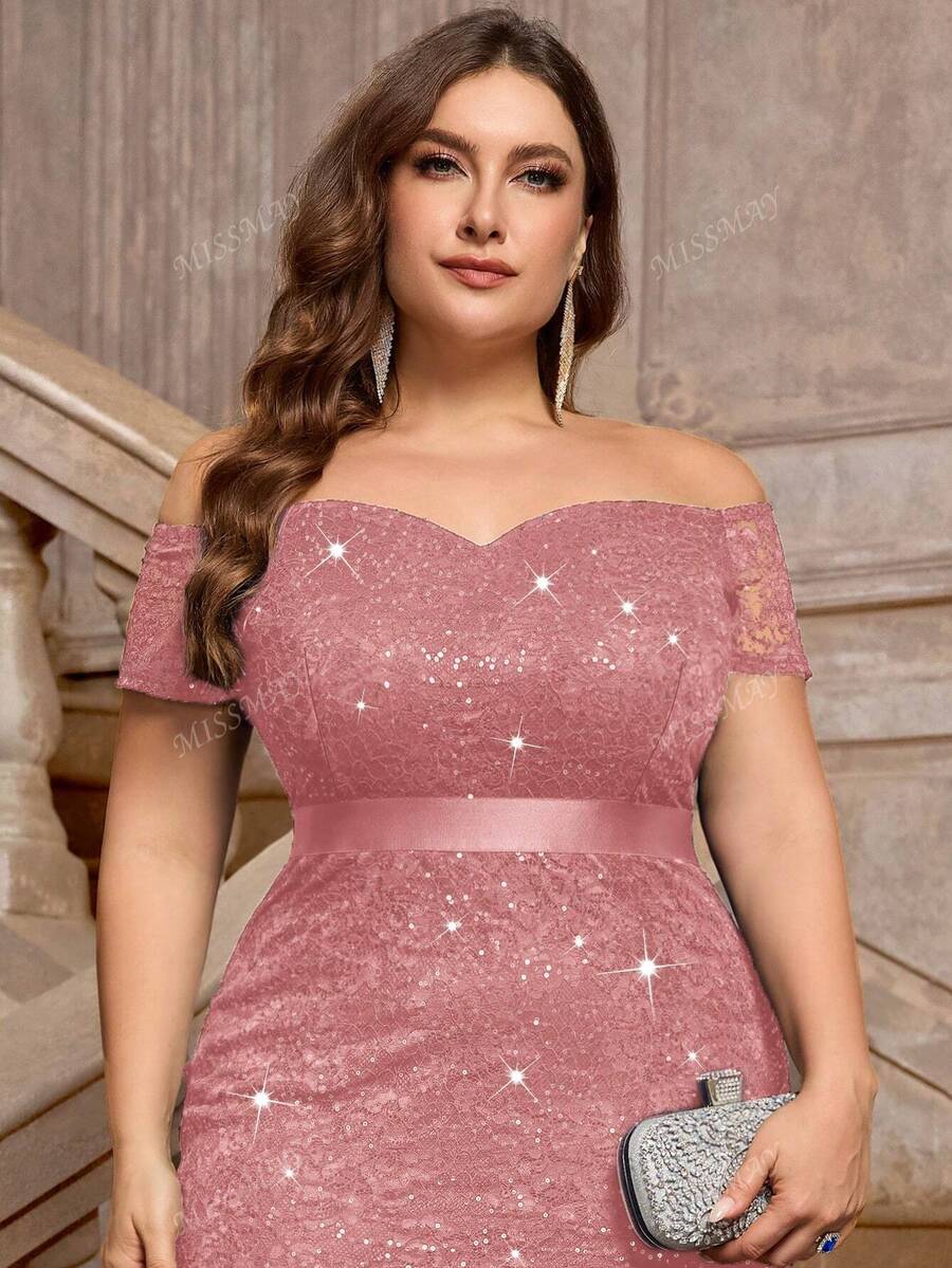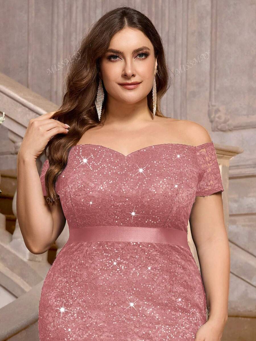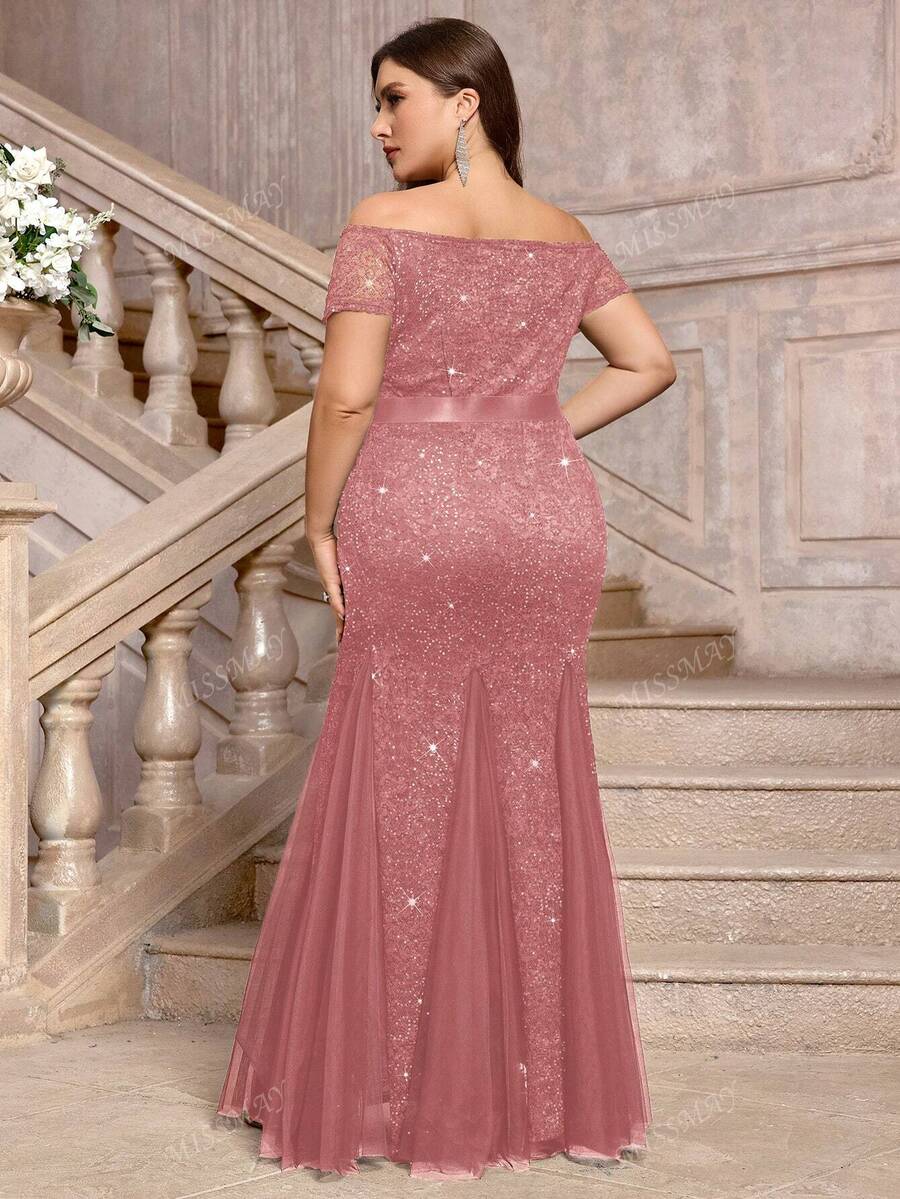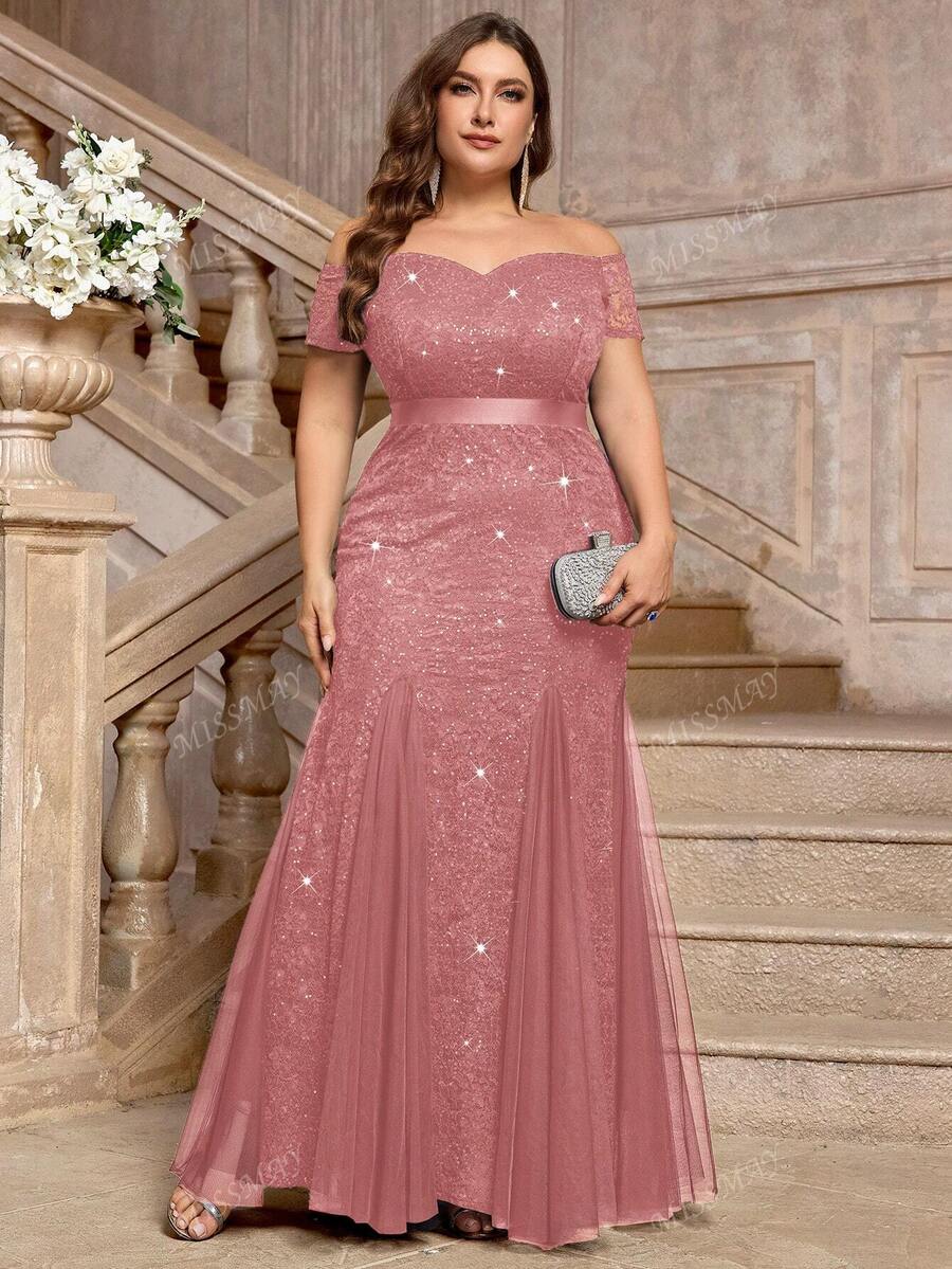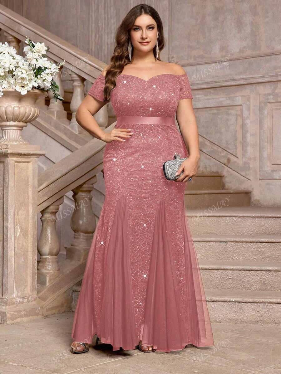 Vestido largo formal de fiesta con hombros descubiertos, encaje floral con lentejuelas, contraste de malla y dobladillo de cola de sirena, para tallas grandes. vestidos de otono, elegantes para baile de graduacion, invitada de boda, cumpleanos, cena,