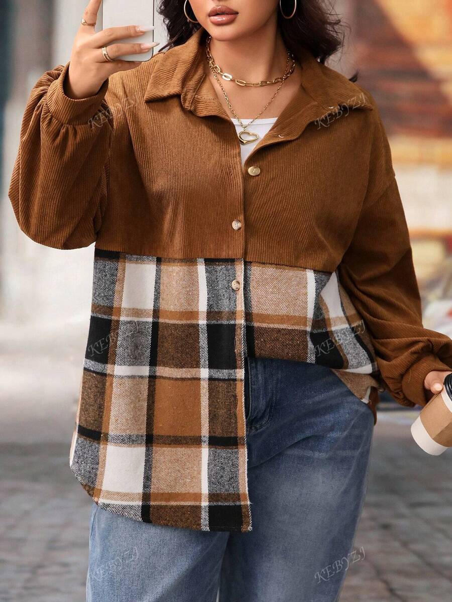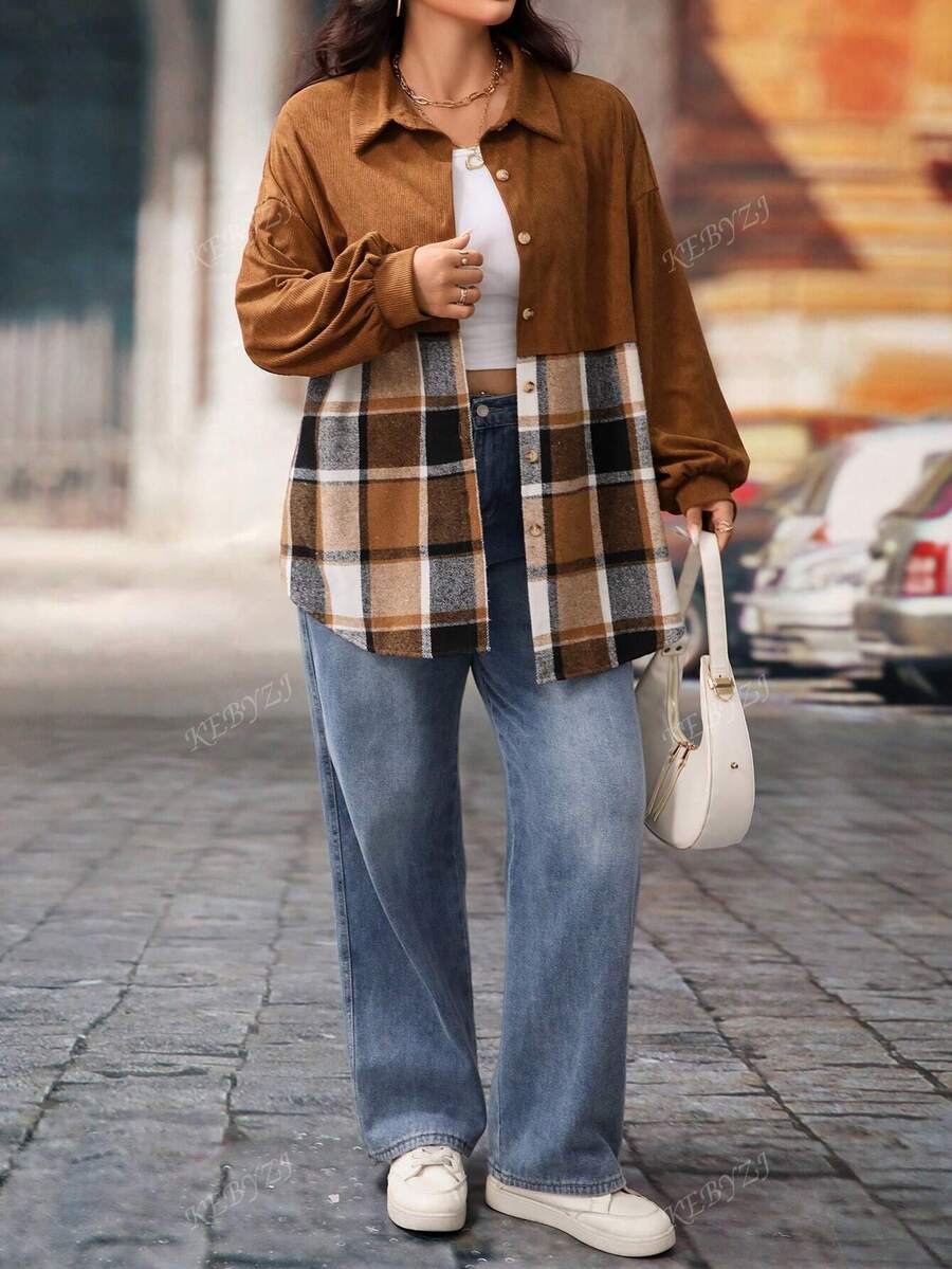 Abrigo de cuadros marrones de talla grande, suelto y casual con solapa y manga larga
