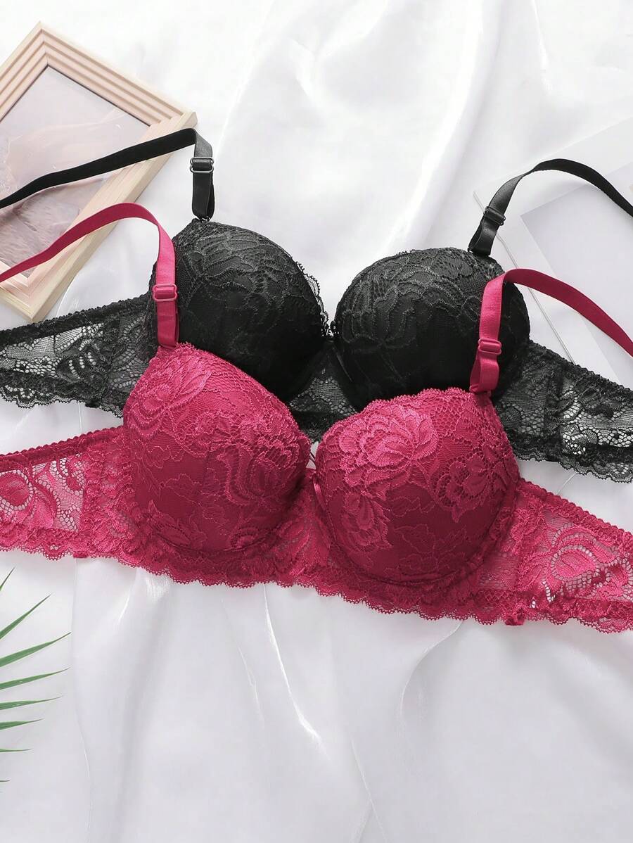 2 conjuntos de ropa interior para mujer, conjunto de brasier y pantie de encaje con aros, relleno no extraible, cierre de gancho y ojal, calzoncillos tipo hipster
