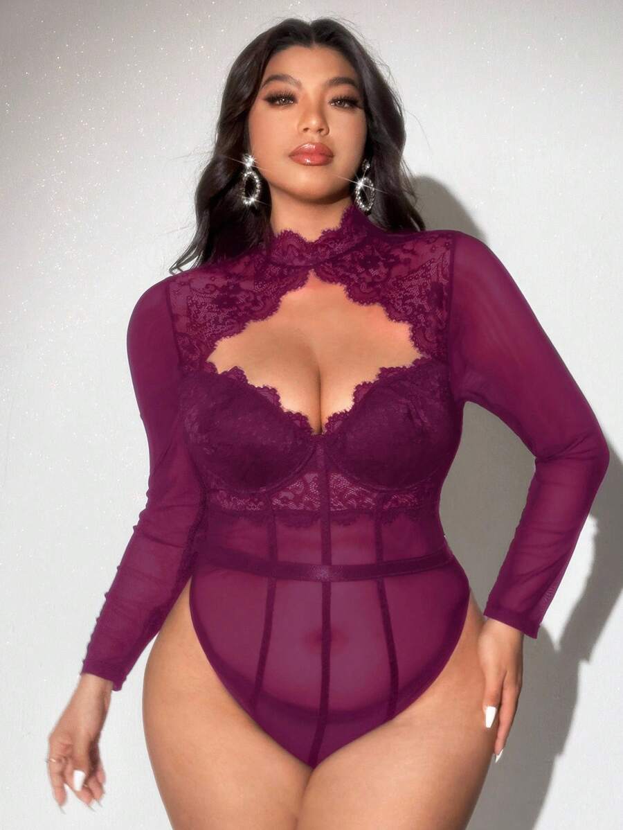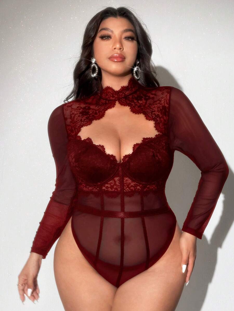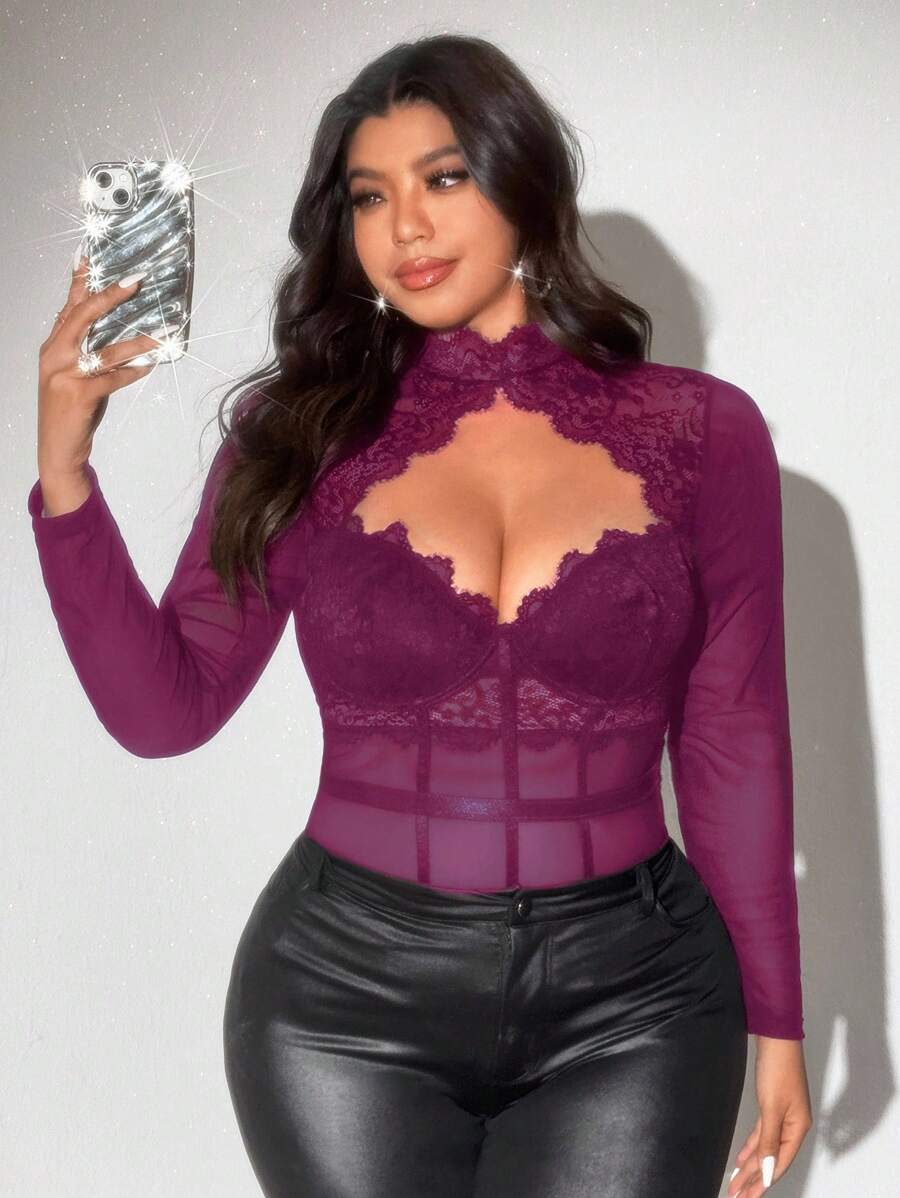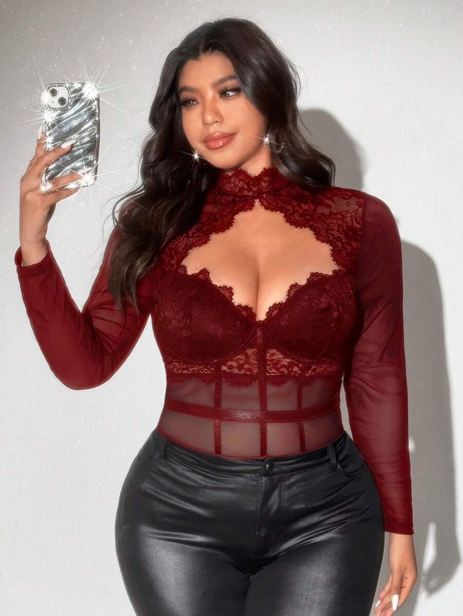 Viva relle body de encaje calado y malla con contraste para mujer talla grande