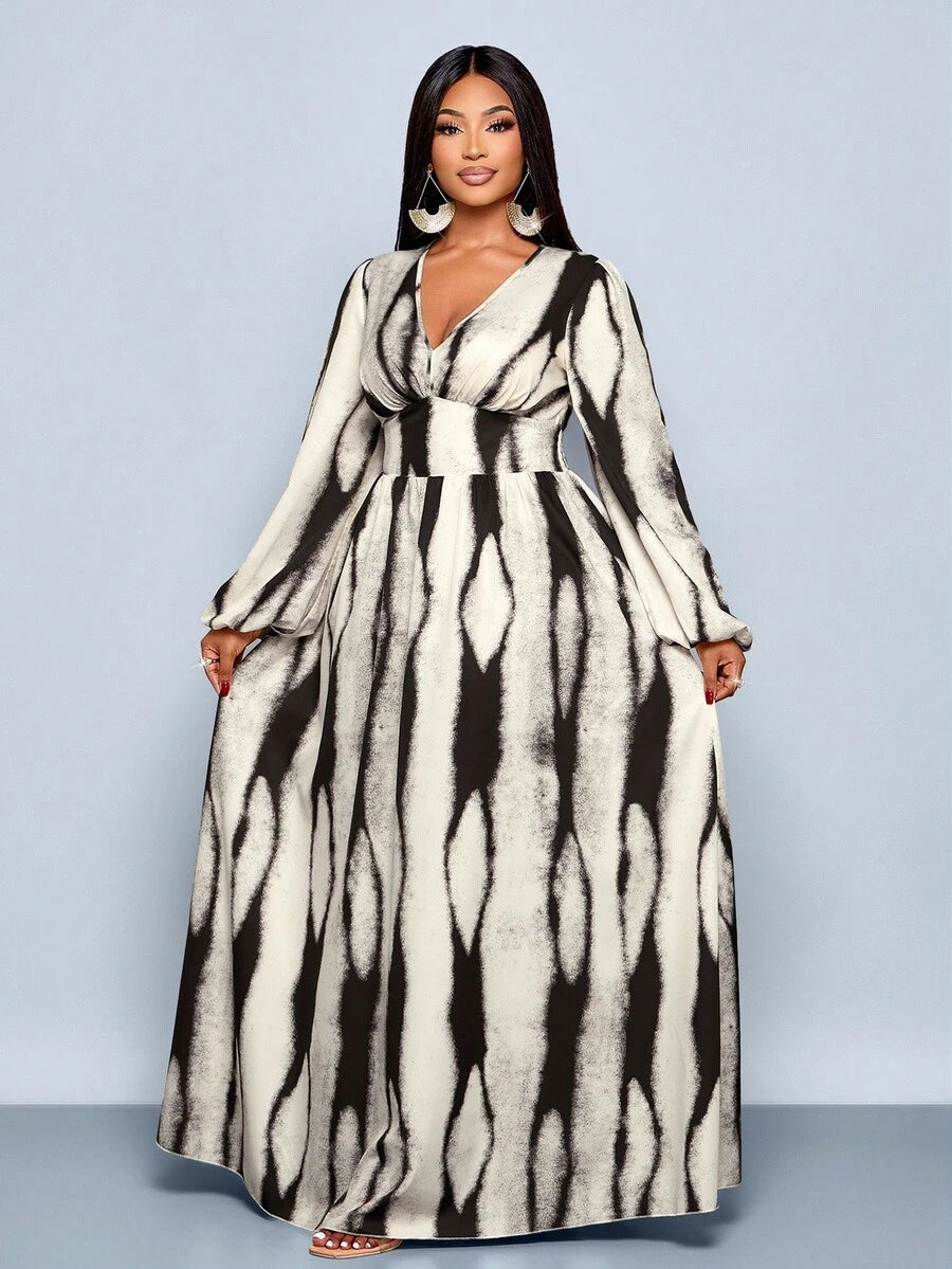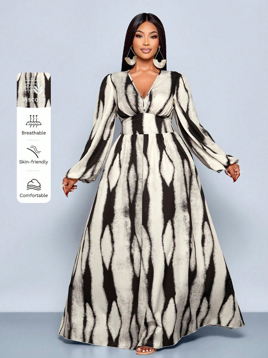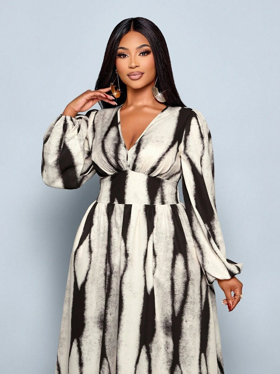 Vestido tejido de talle alto con volantes, mangas murcielago y cuello en v con estampado negro y albaricoque para uso diario y casual de mujer talla grande (flores aleatorias)