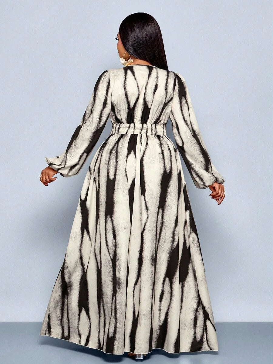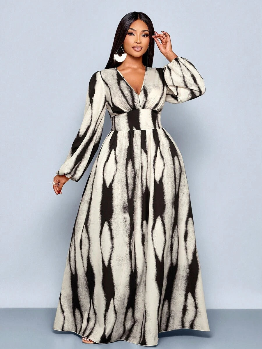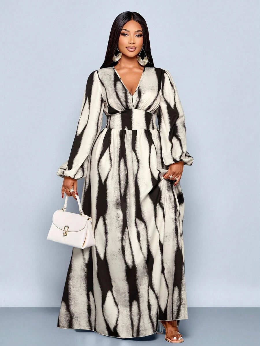 Vestido tejido de talle alto con volantes, mangas murcielago y cuello en v con estampado negro y albaricoque para uso diario y casual de mujer talla grande (flores aleatorias)