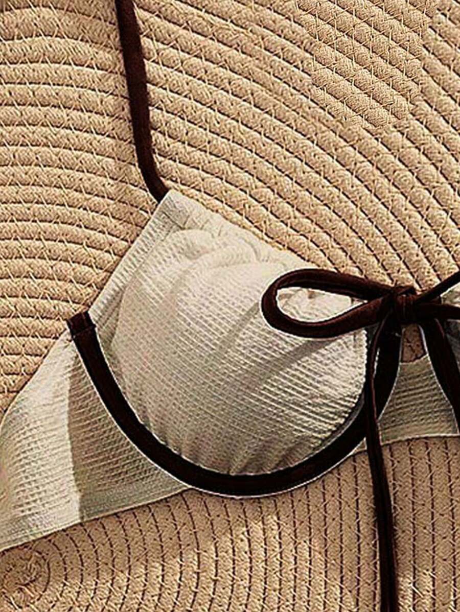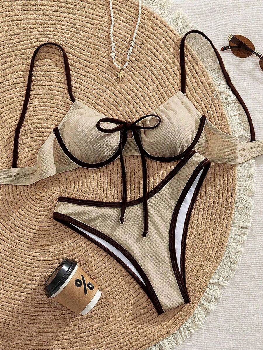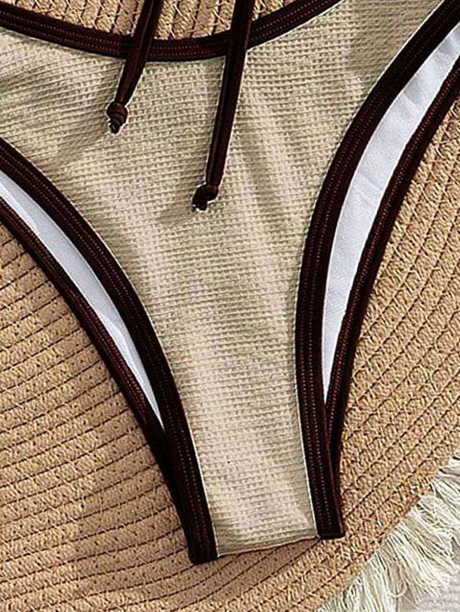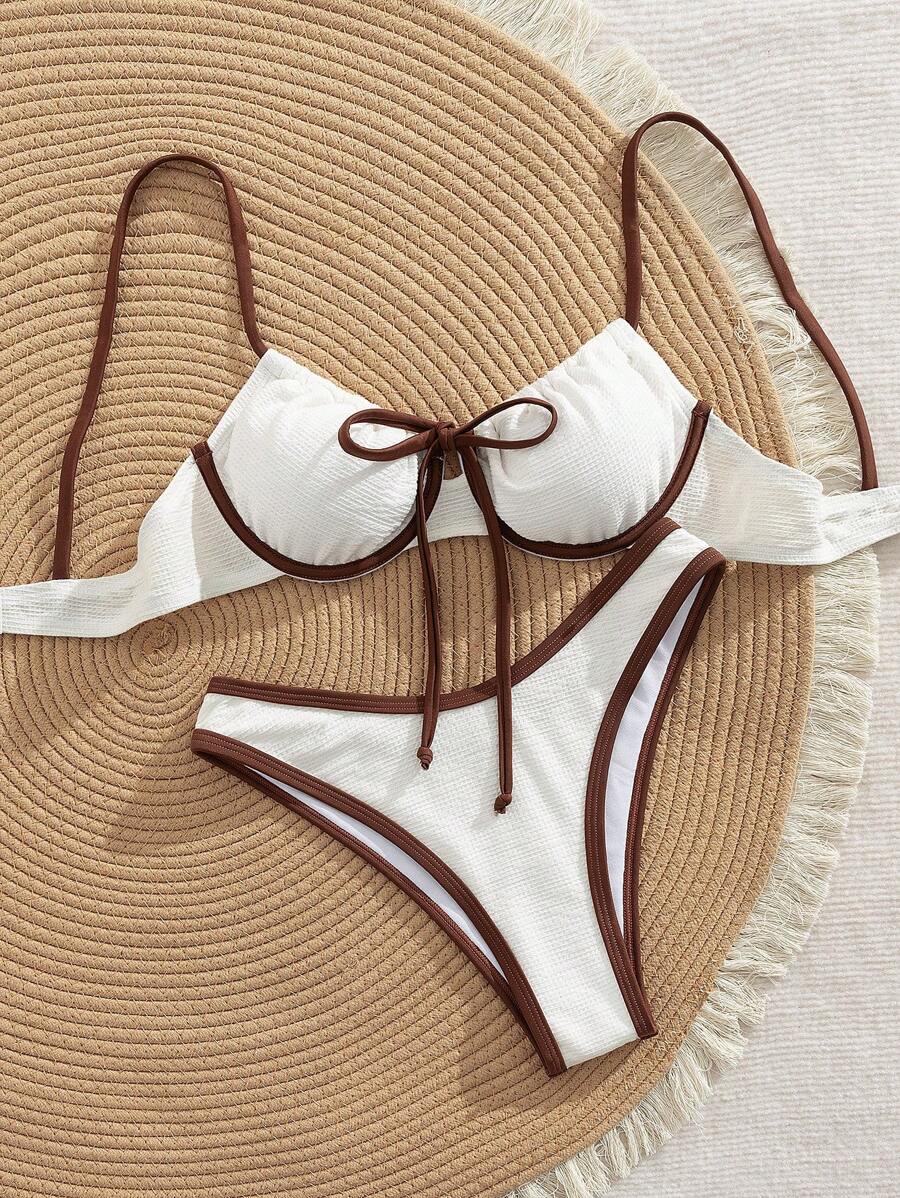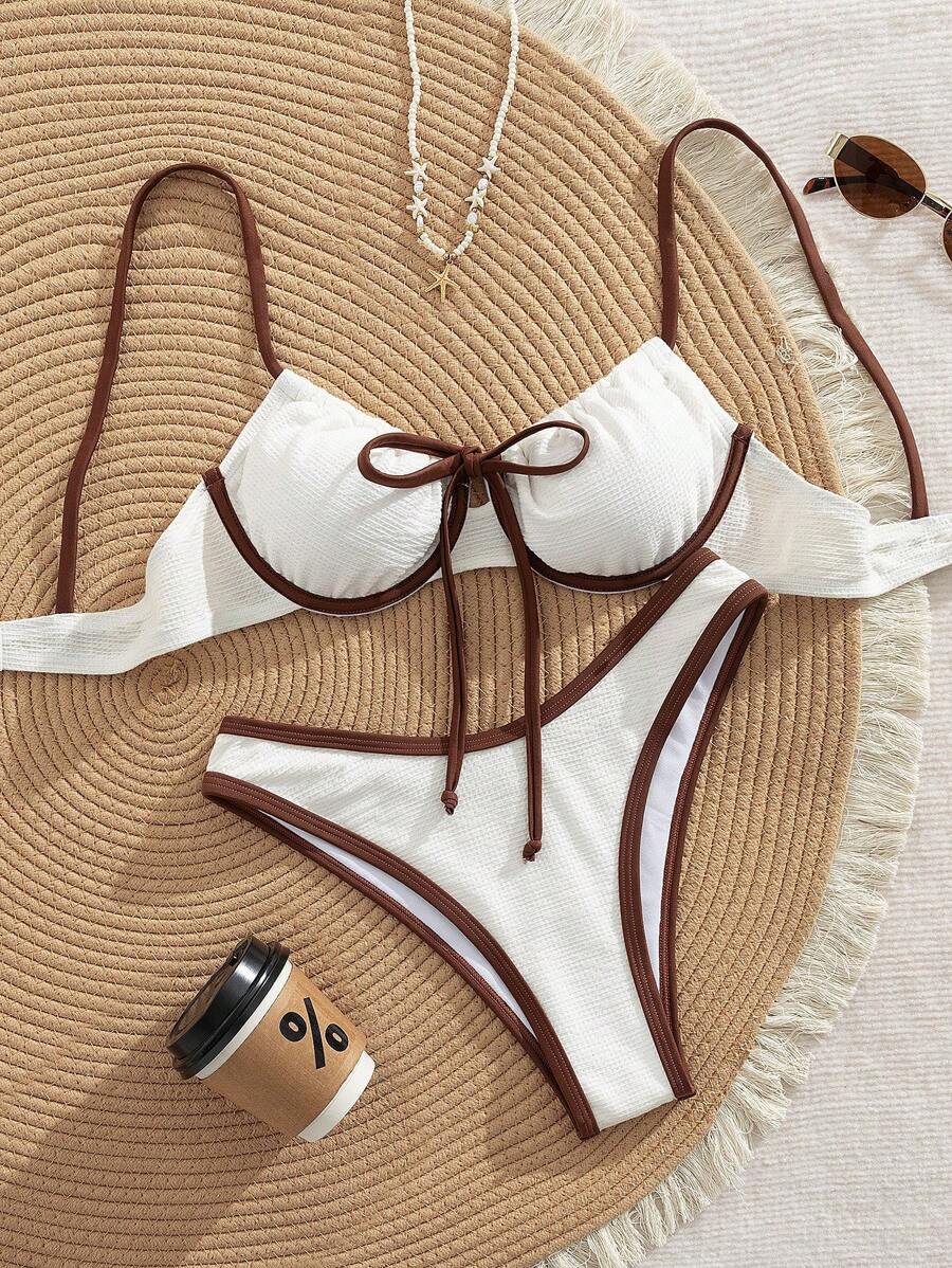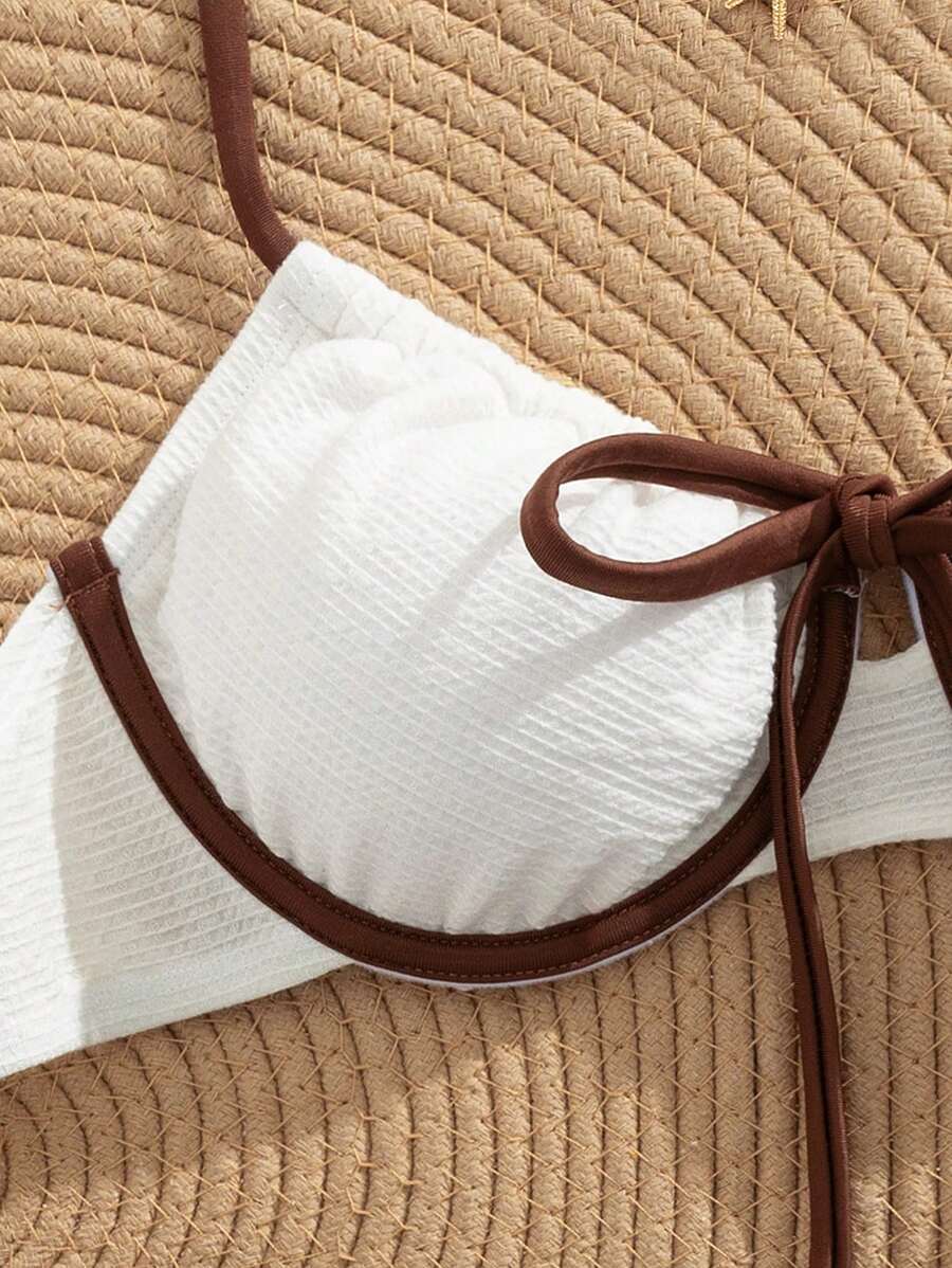 2 piezas conjunto de bikini con taza suave con textura blanca, desmontable y acolchada con aro, con mono marron, traje de bano minimalista y sexy para mujeres
