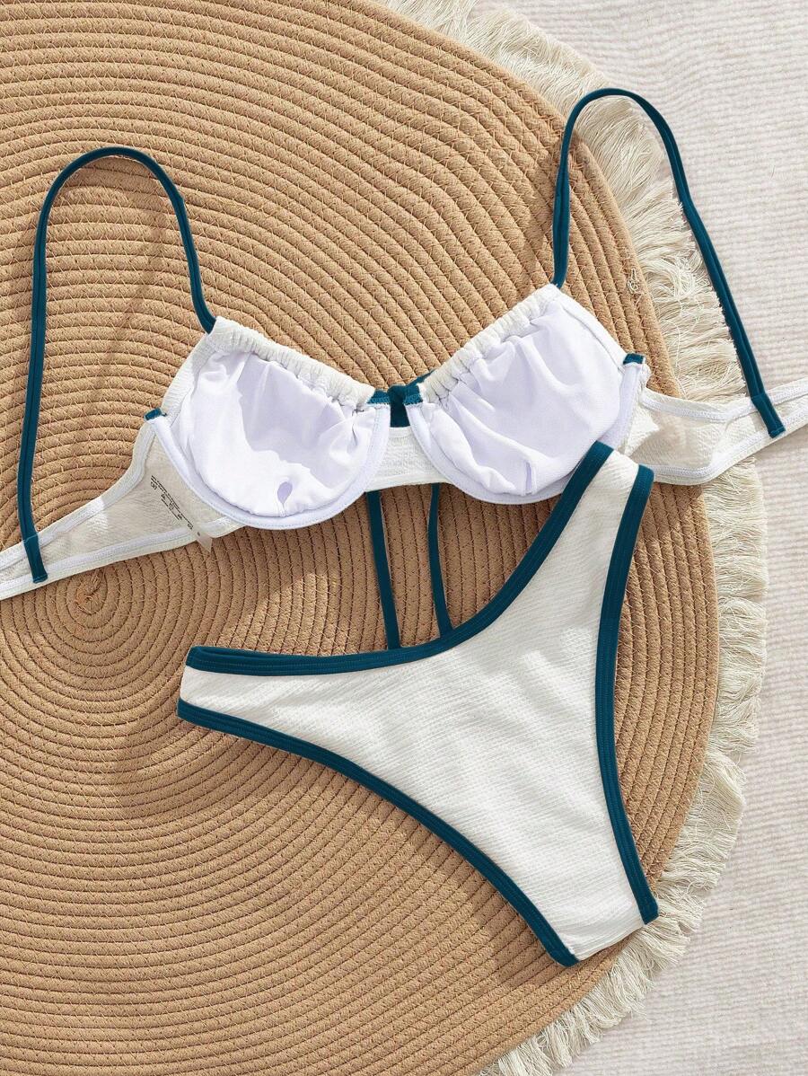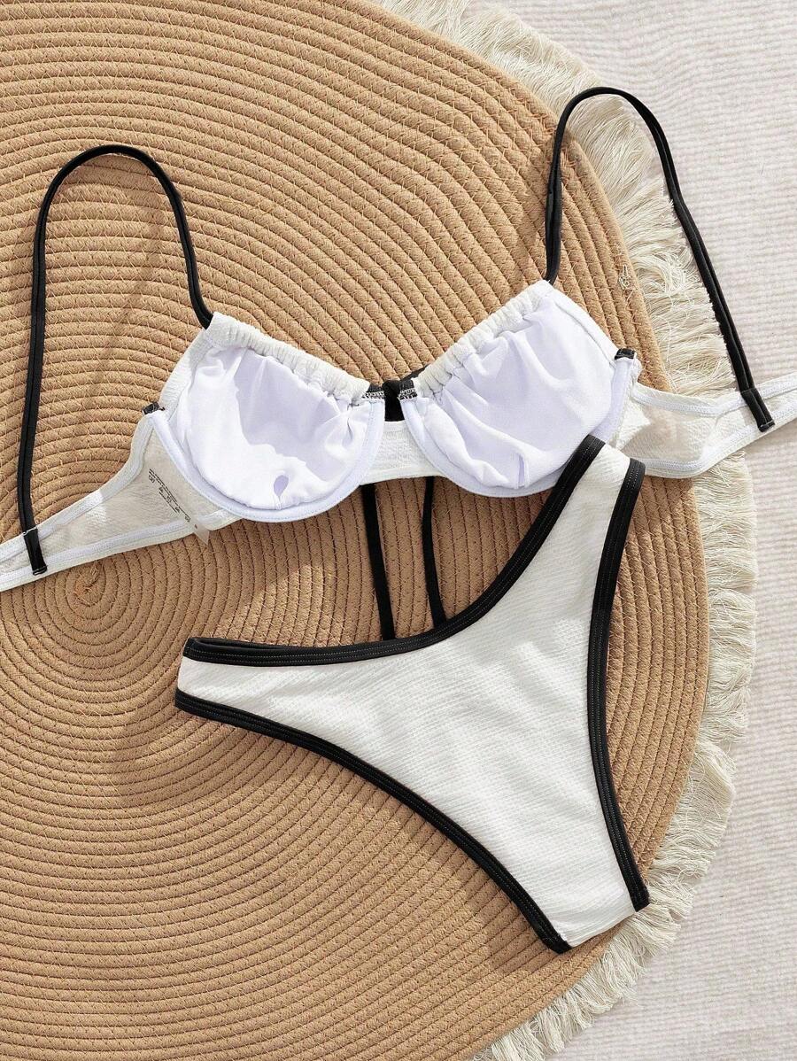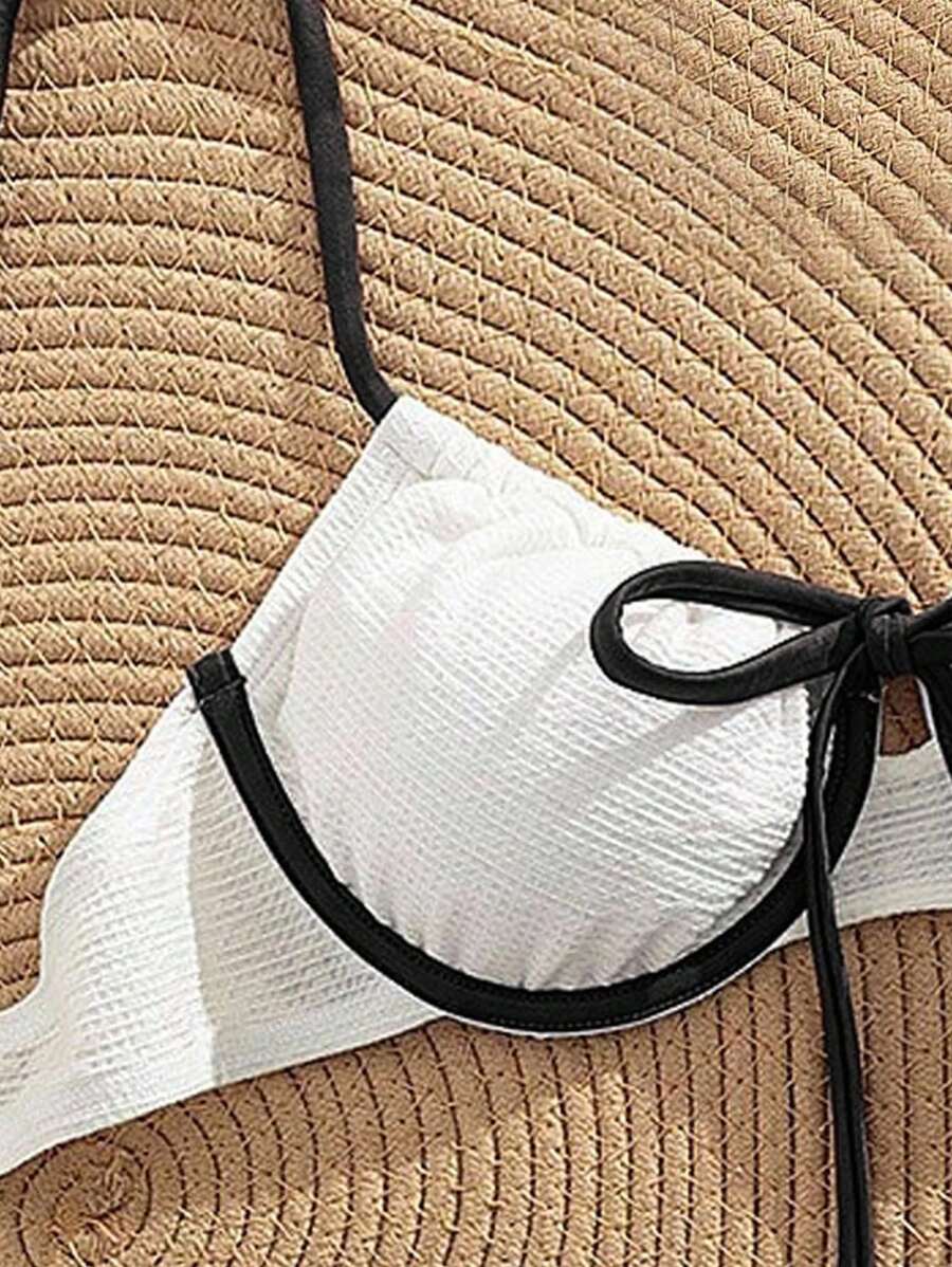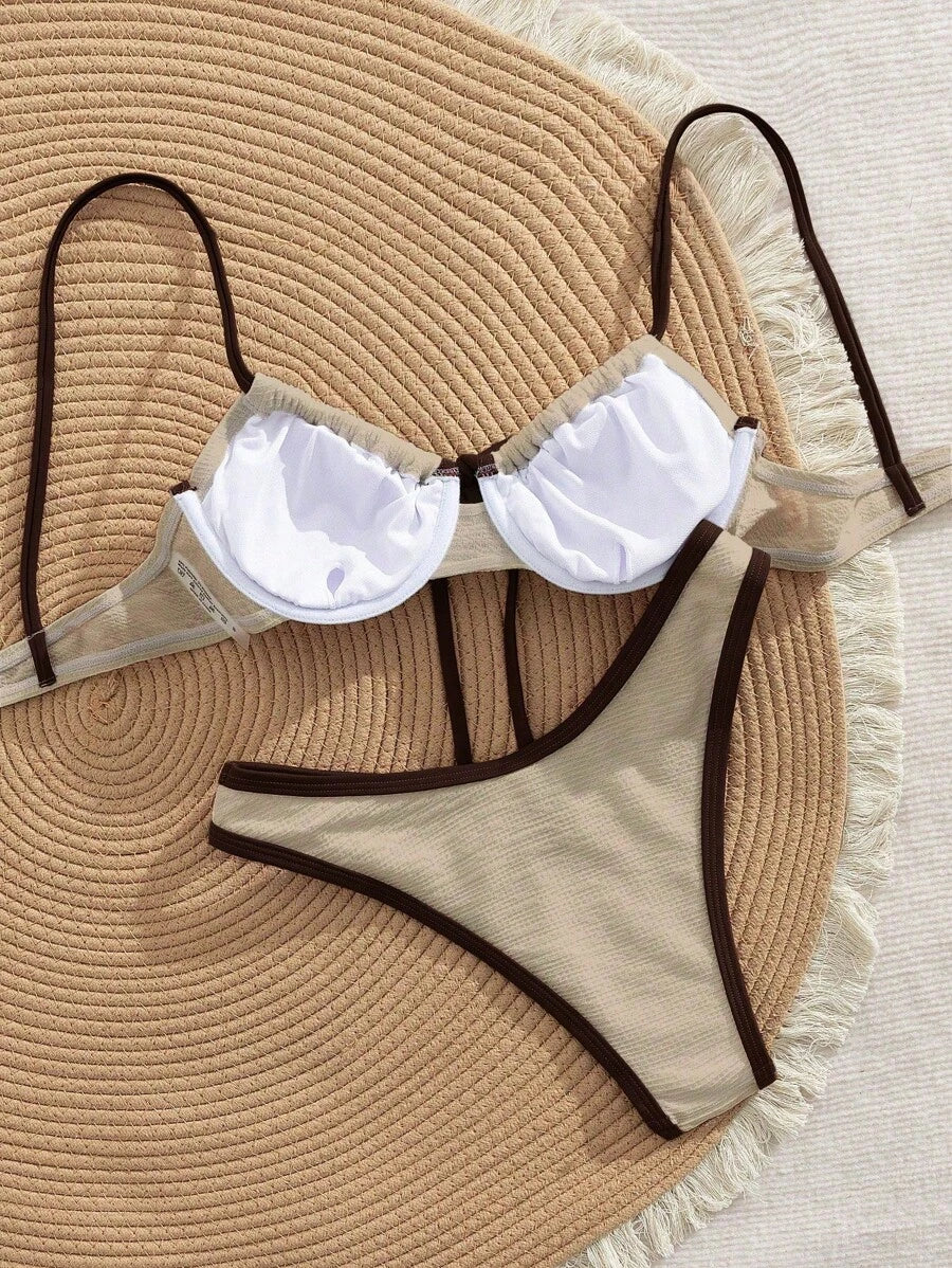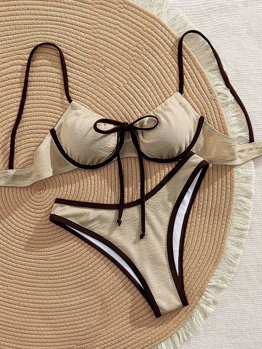 2 piezas conjunto de bikini con taza suave con textura blanca, desmontable y acolchada con aro, con mono marron, traje de bano minimalista y sexy para mujeres