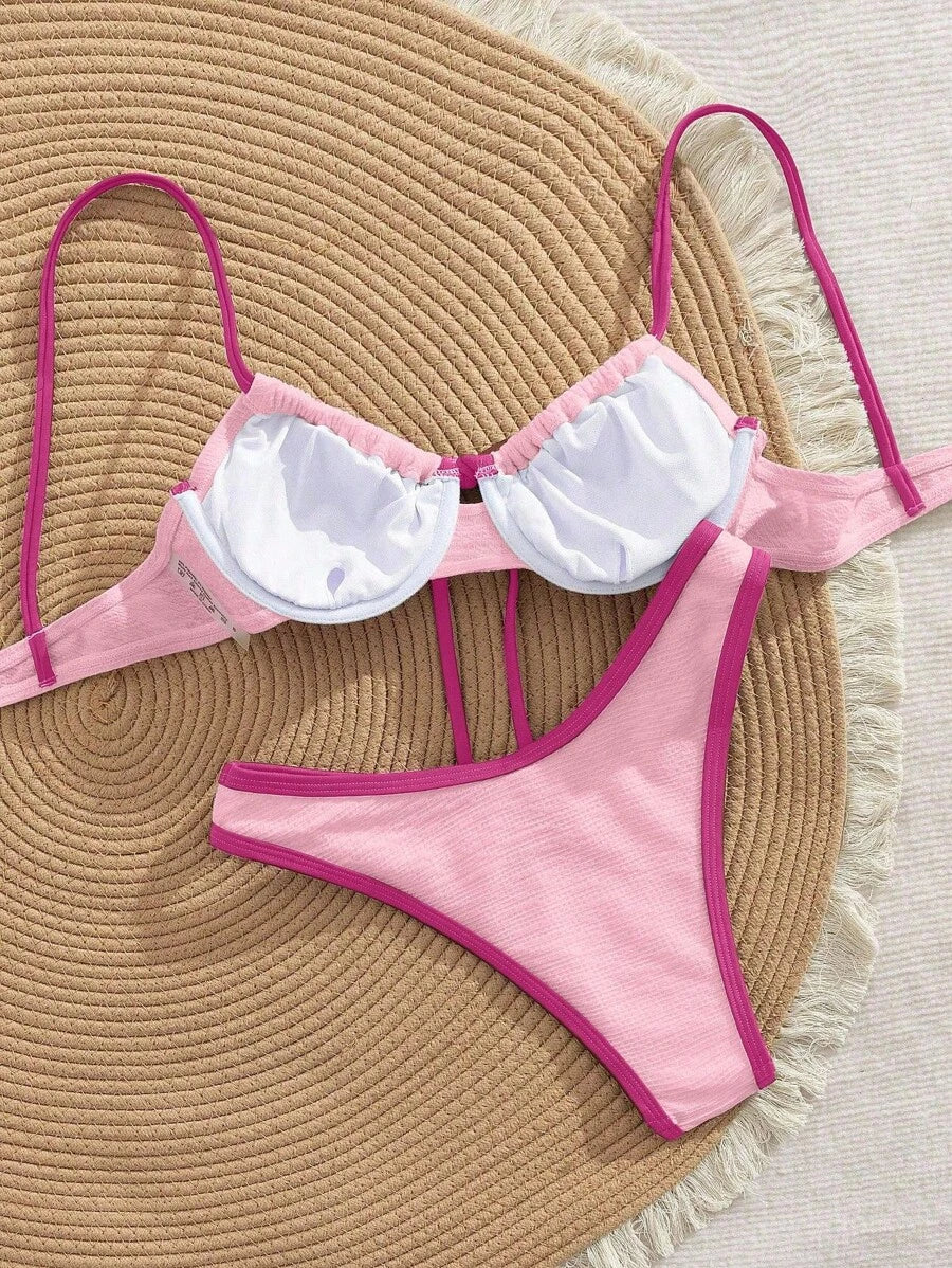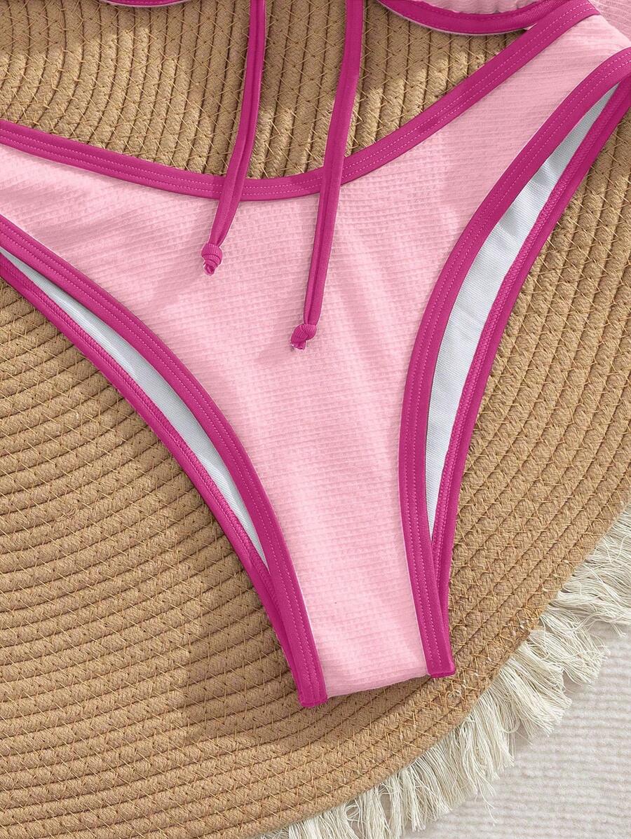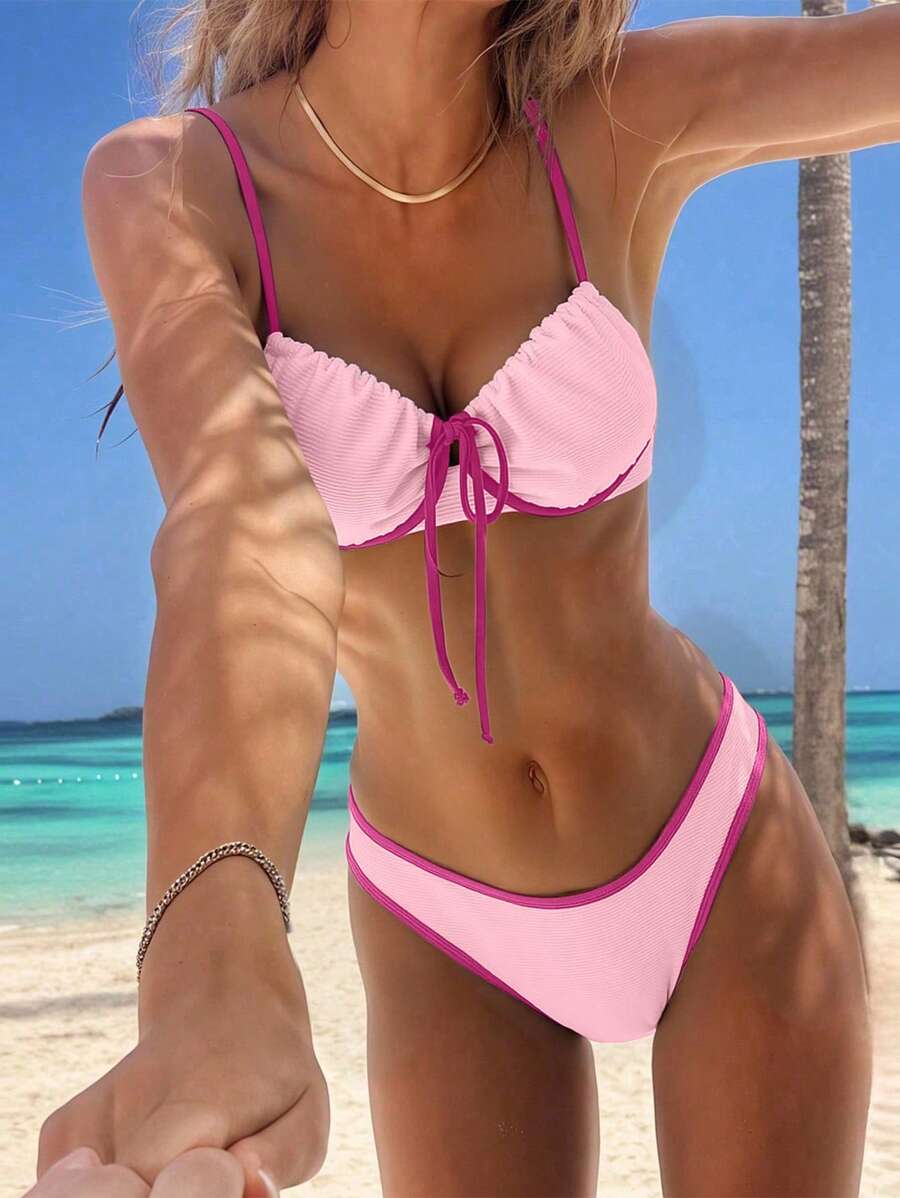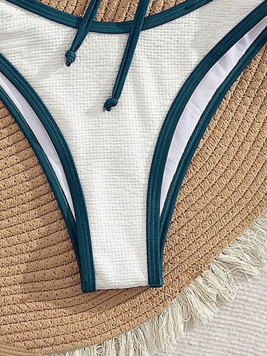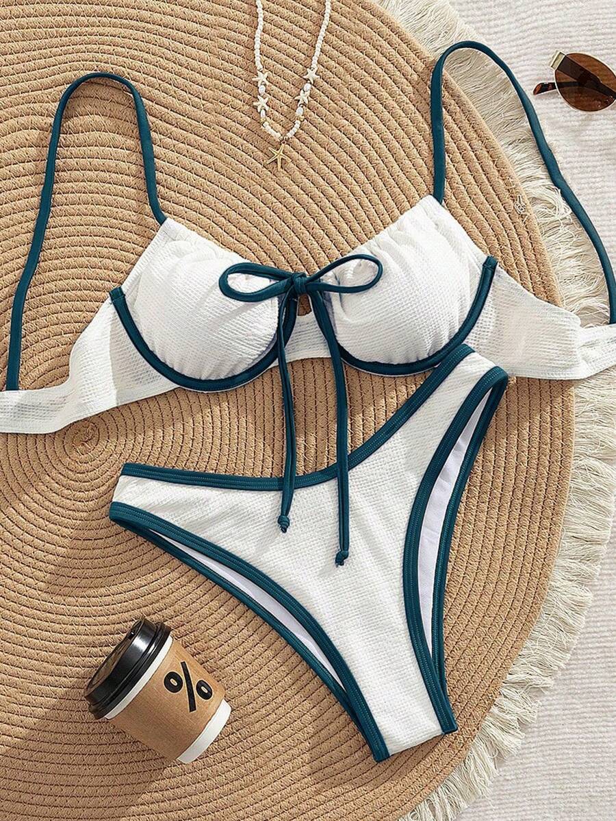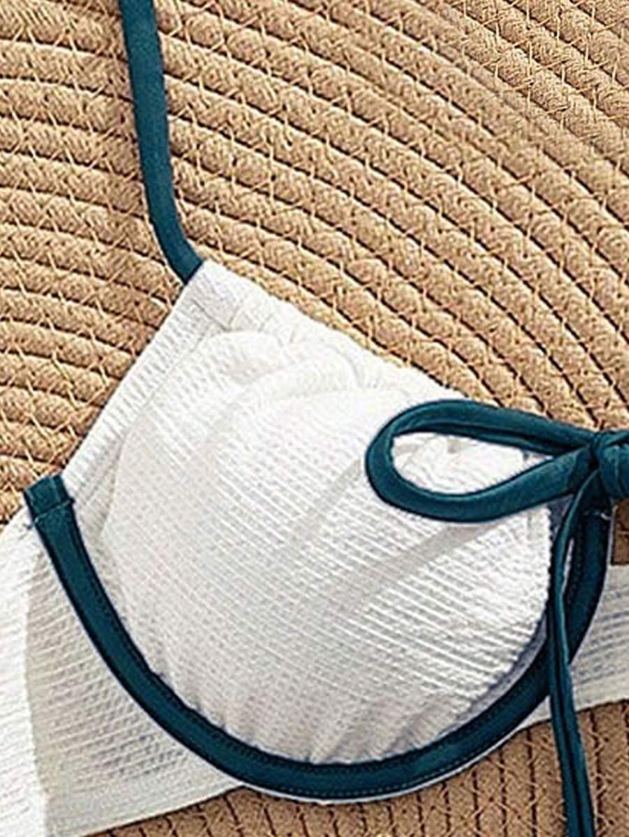 2 piezas conjunto de bikini con taza suave con textura blanca, desmontable y acolchada con aro, con mono marron, traje de bano minimalista y sexy para mujeres