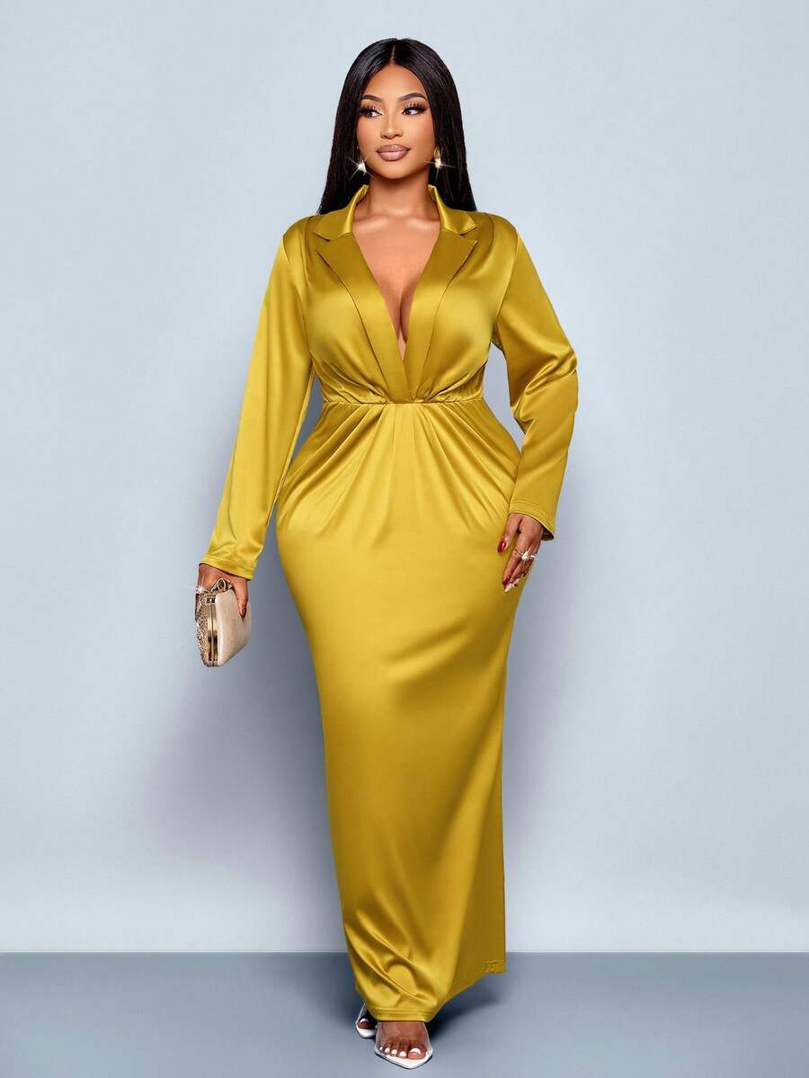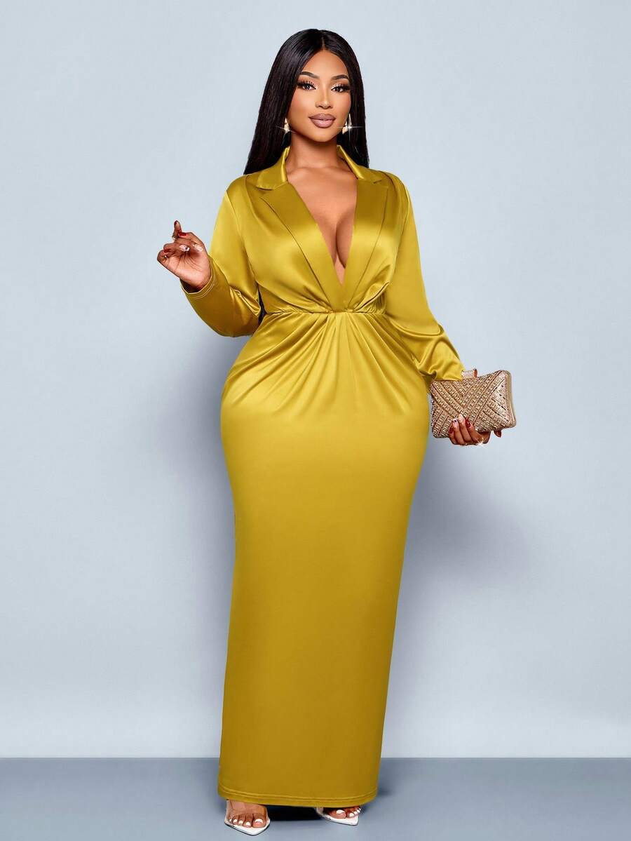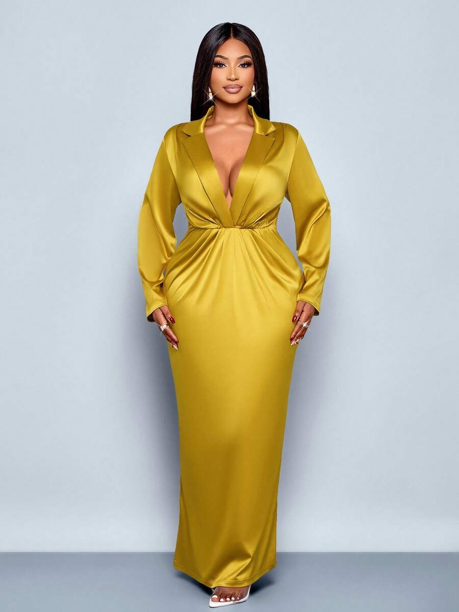 Vestido de manga larga elegante y de moda para uso diario y citas, con escote en v profundo, cintura plegada, en tela satinada brillante de color amarillo jengibre, para mujeres de talla grande