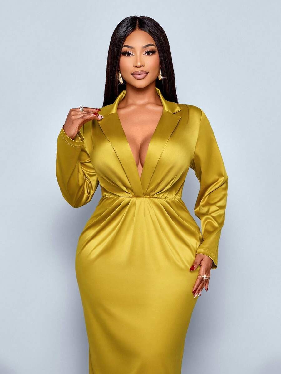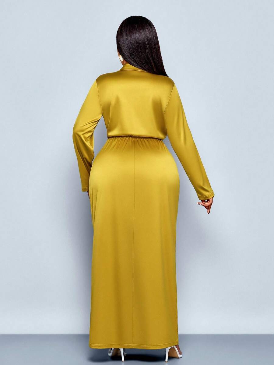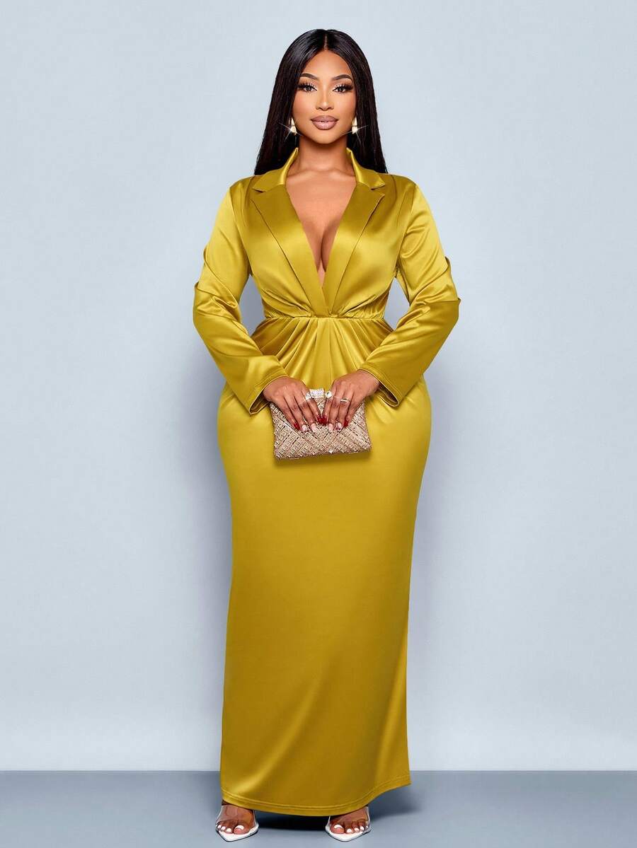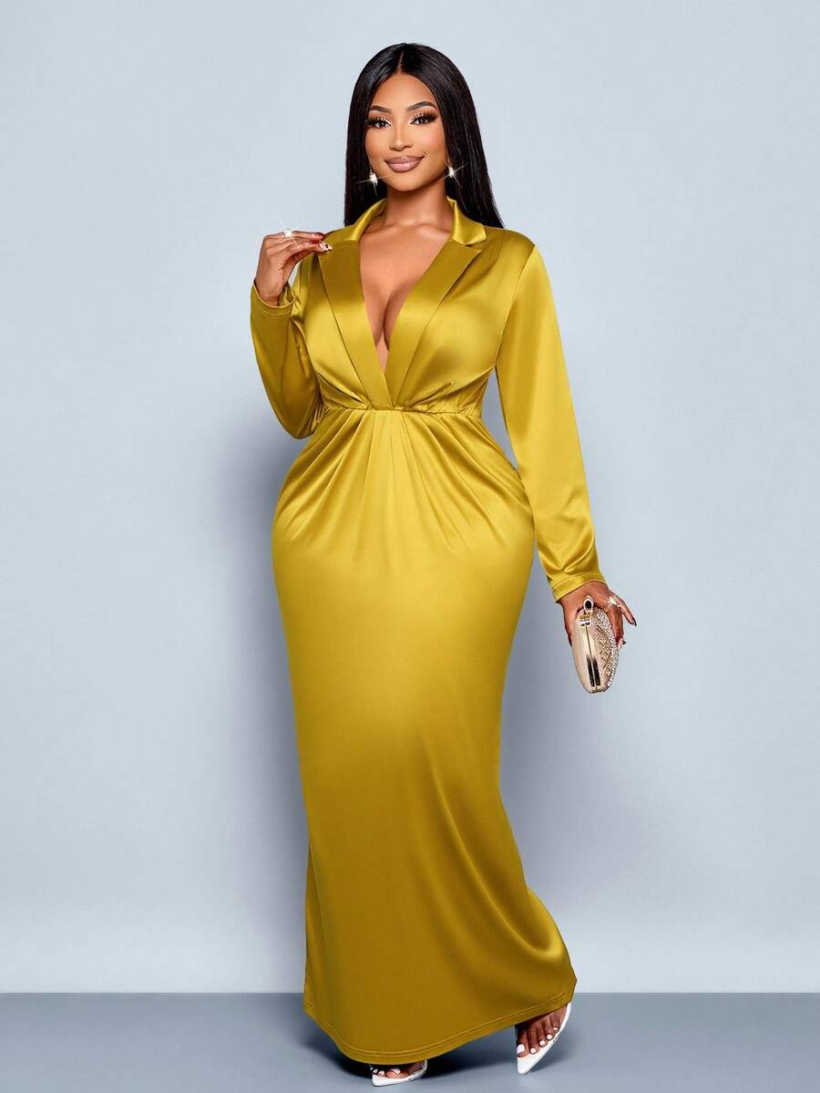Vestido de manga larga elegante y de moda para uso diario y citas, con escote en v profundo, cintura plegada, en tela satinada brillante de color amarillo jengibre, para mujeres de talla grande