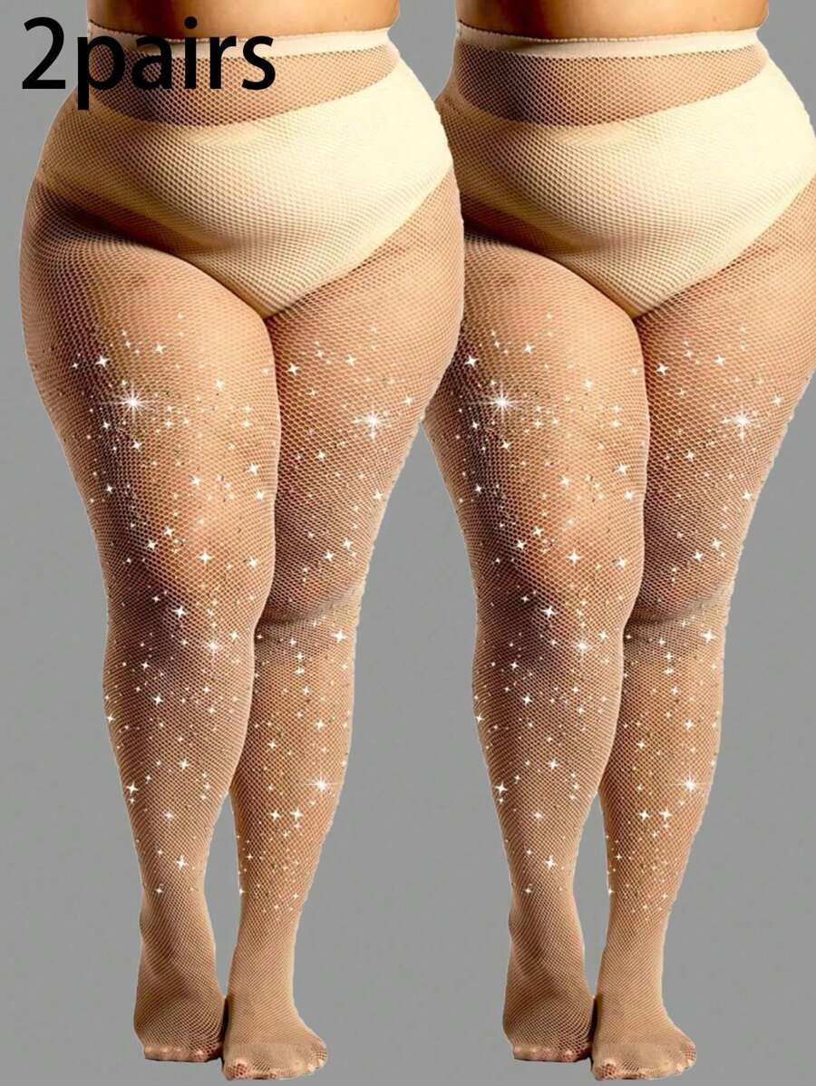 2 pares de medias de rejilla de color negro con tono de piel y adornadas con rhinestones para mujeres de talla grande, mallas de malla pequena de gran elasticidad, medias brillantes para baile en discoteca, adecuadas para todas las estaciones, estilo