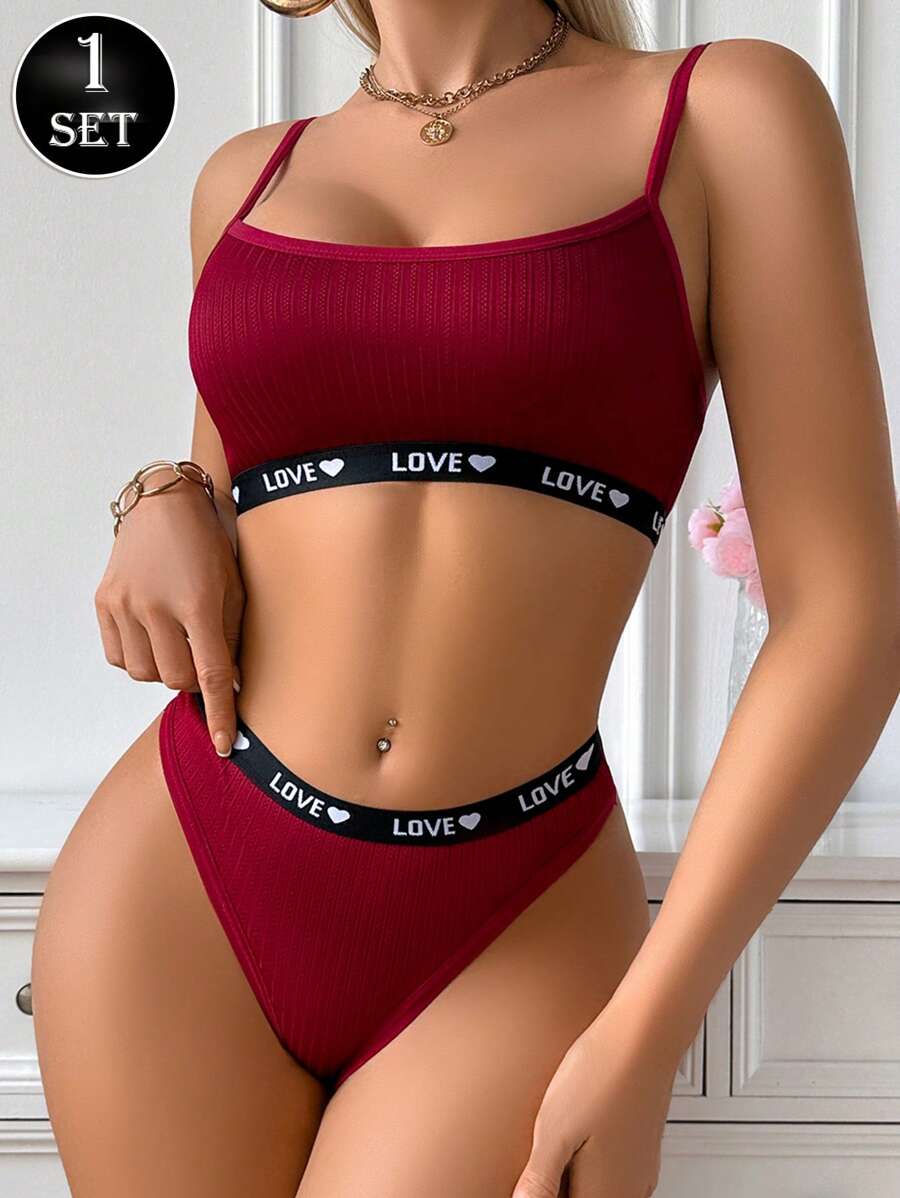1 conjunto de brasier acanalado y tanga a juego con texto en ingles de estilo europeo y americano de colores contrastantes para mujer