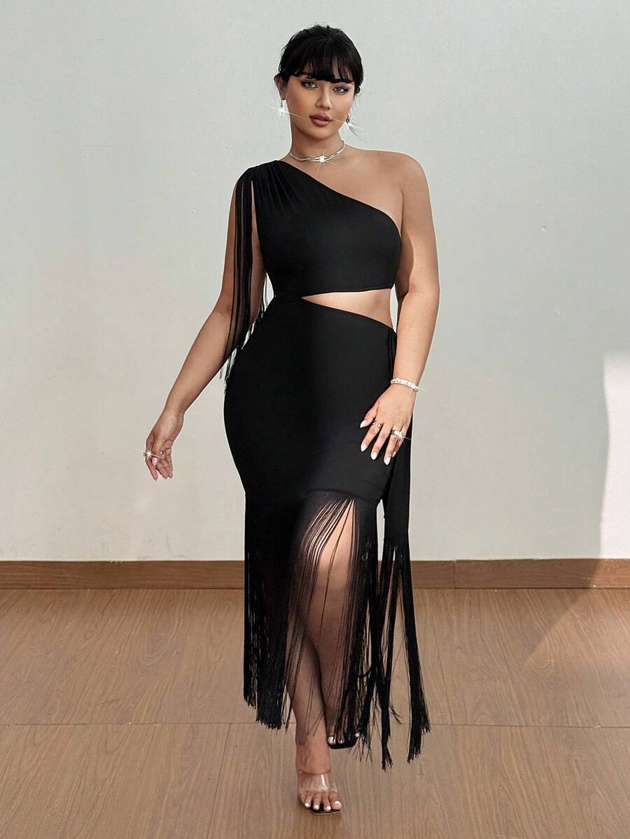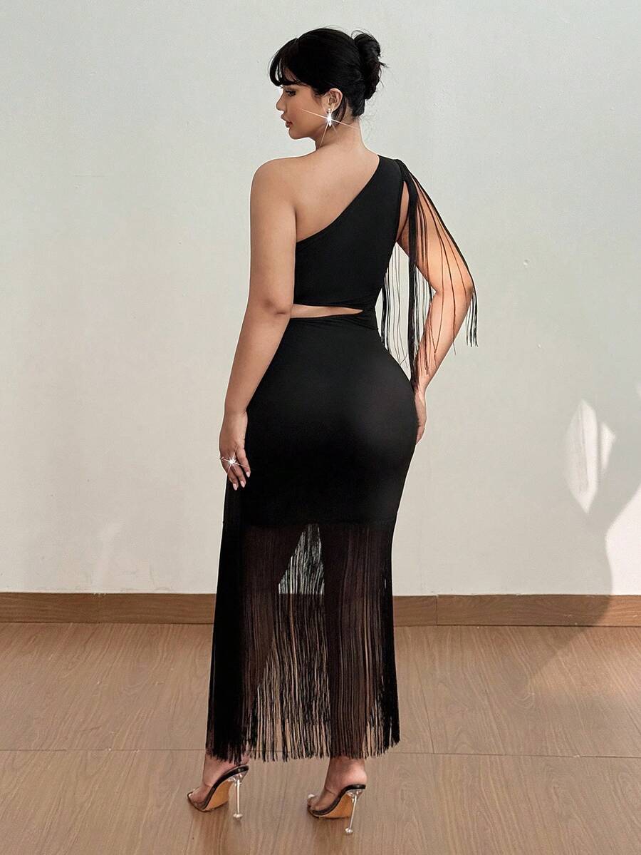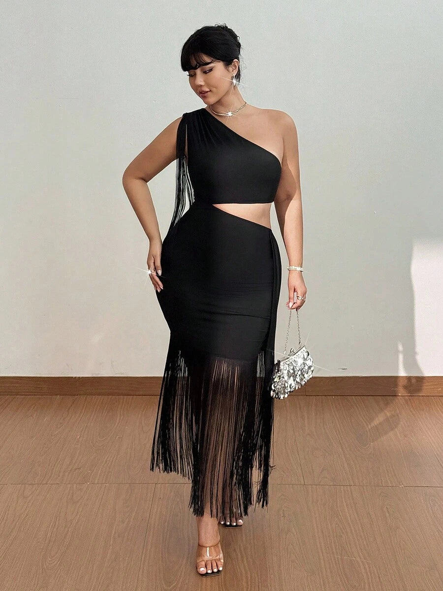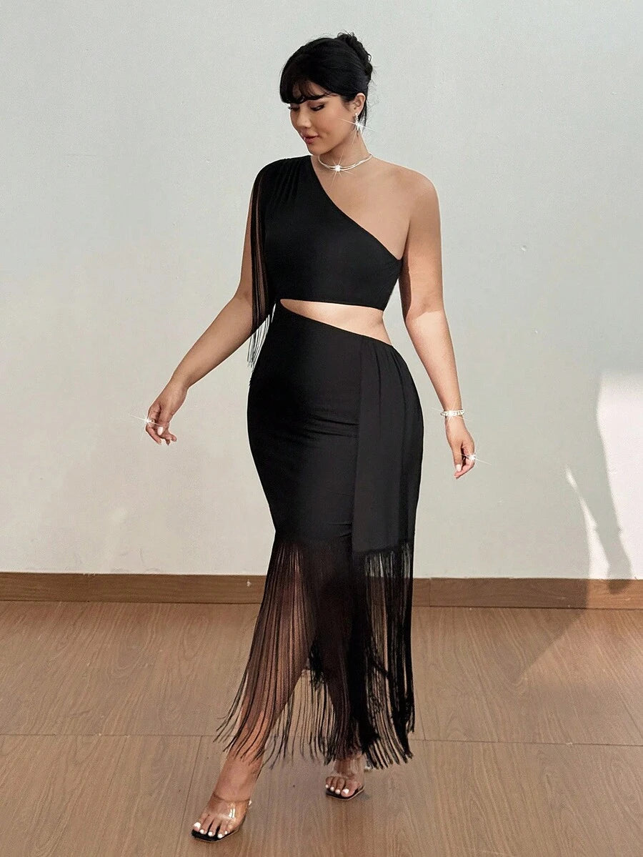 Viva relle vestido maxi ajustado de mujer talla grande con hombro asimetrico, recorte en la cintura y flecos en patchwork
