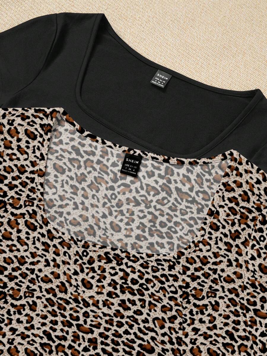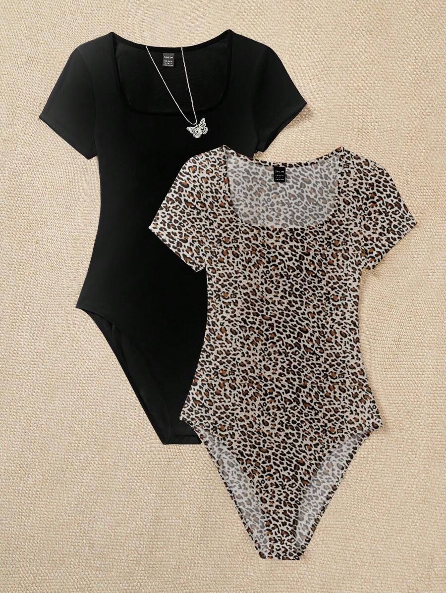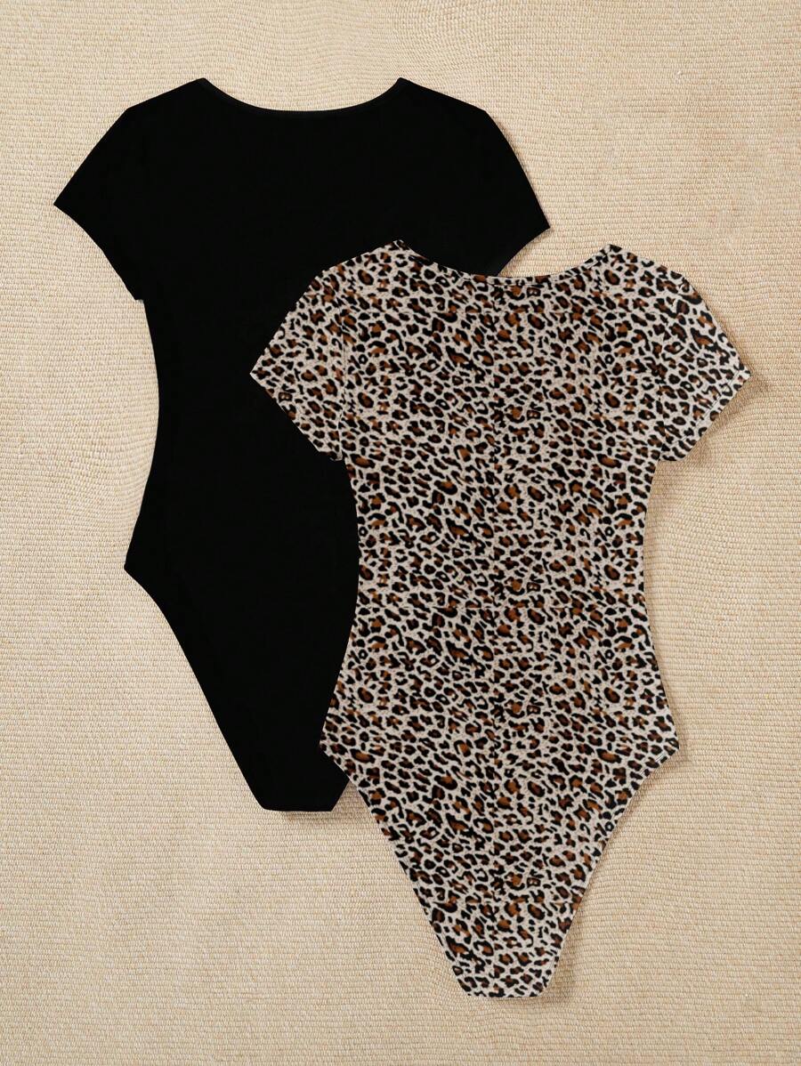 Attitoon conjunto de 2 bodys de mujer talla grande con estampado de leopardo y unicolor, body casual minimalista de cuello redondo y manga corta, adecuado para el verano