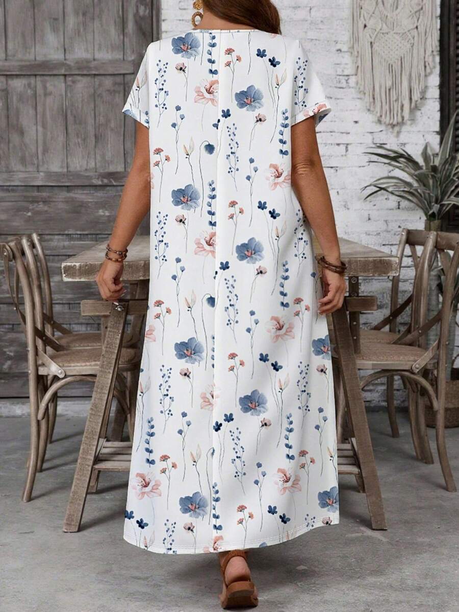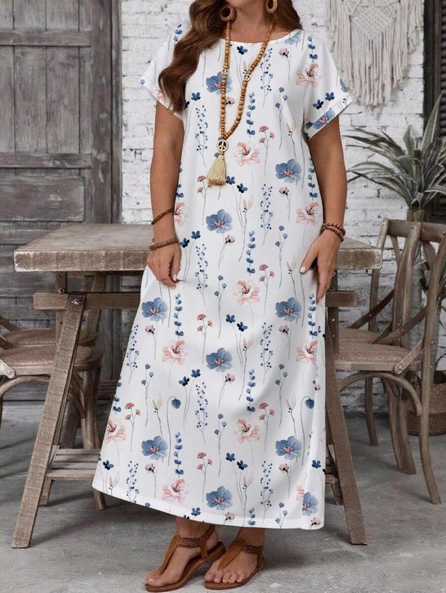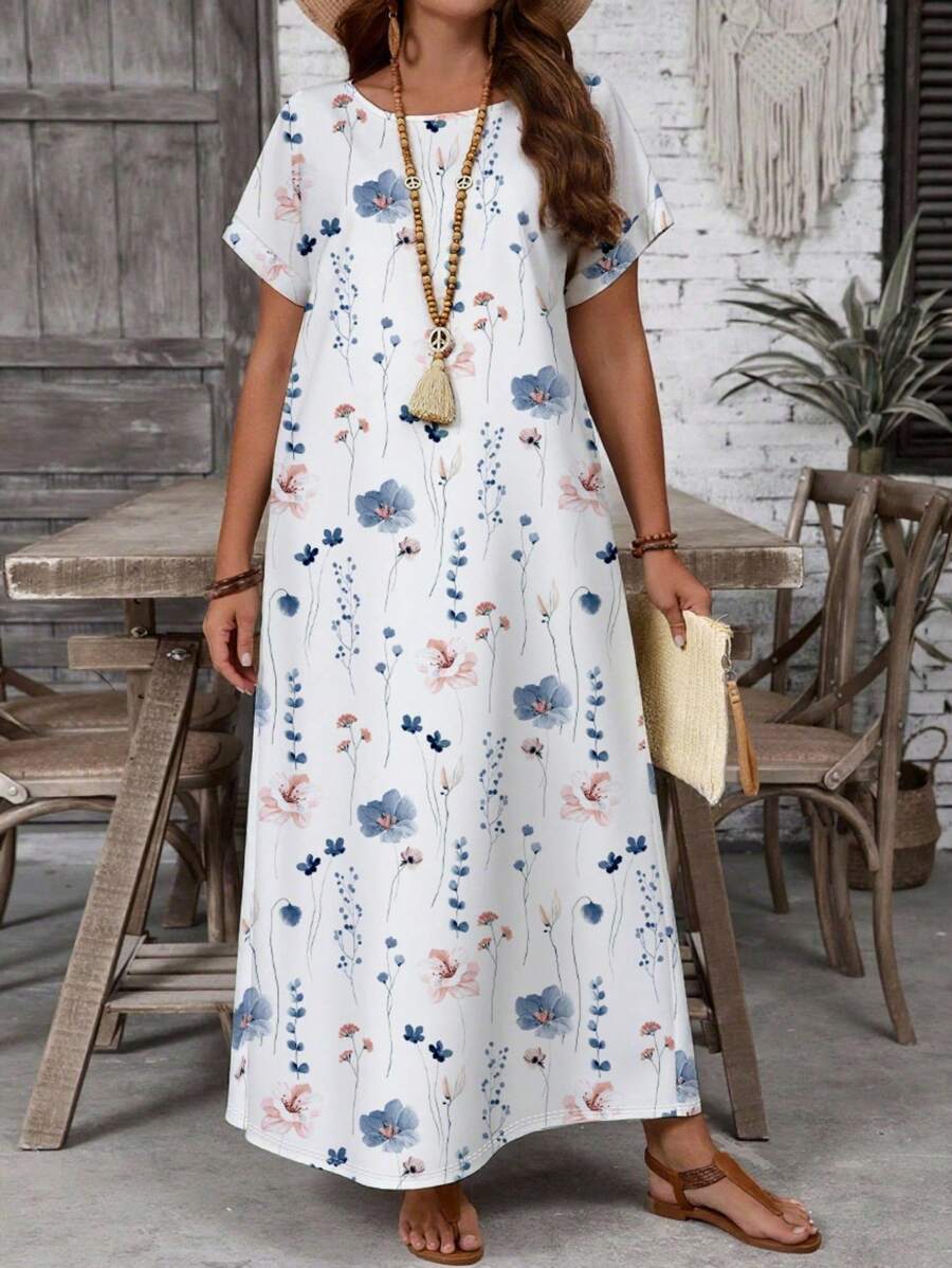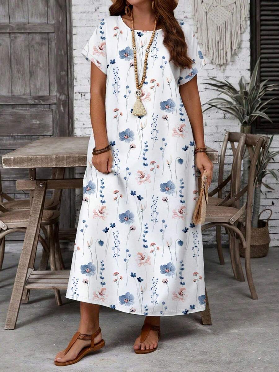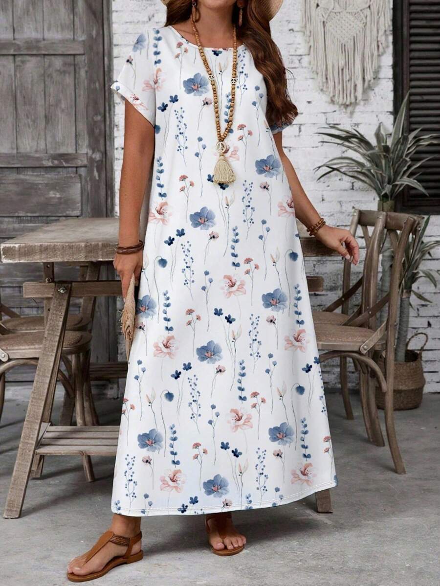 Vestido casual holgado de manga corta con cuello redondo y estampado floral para mujer de talla grande, verano