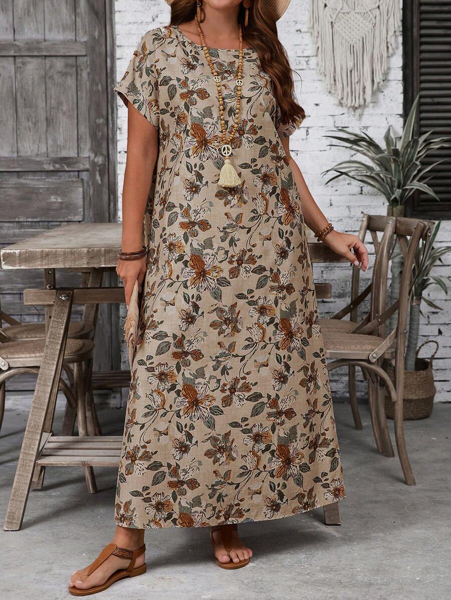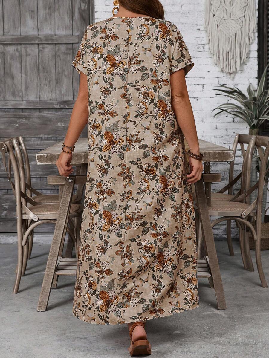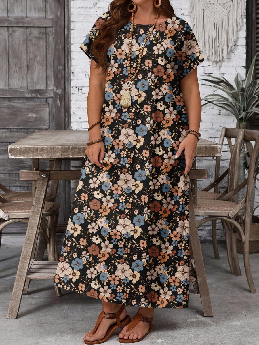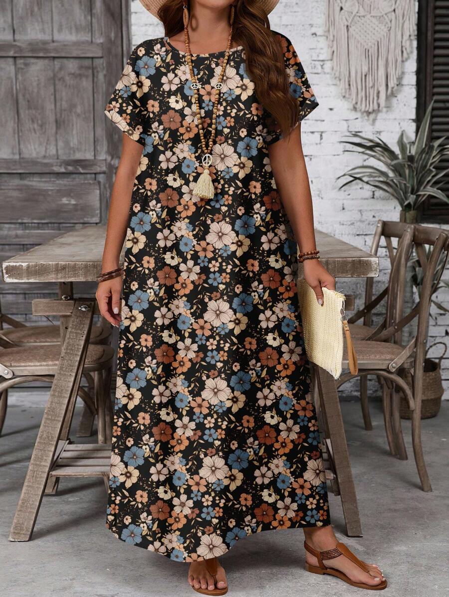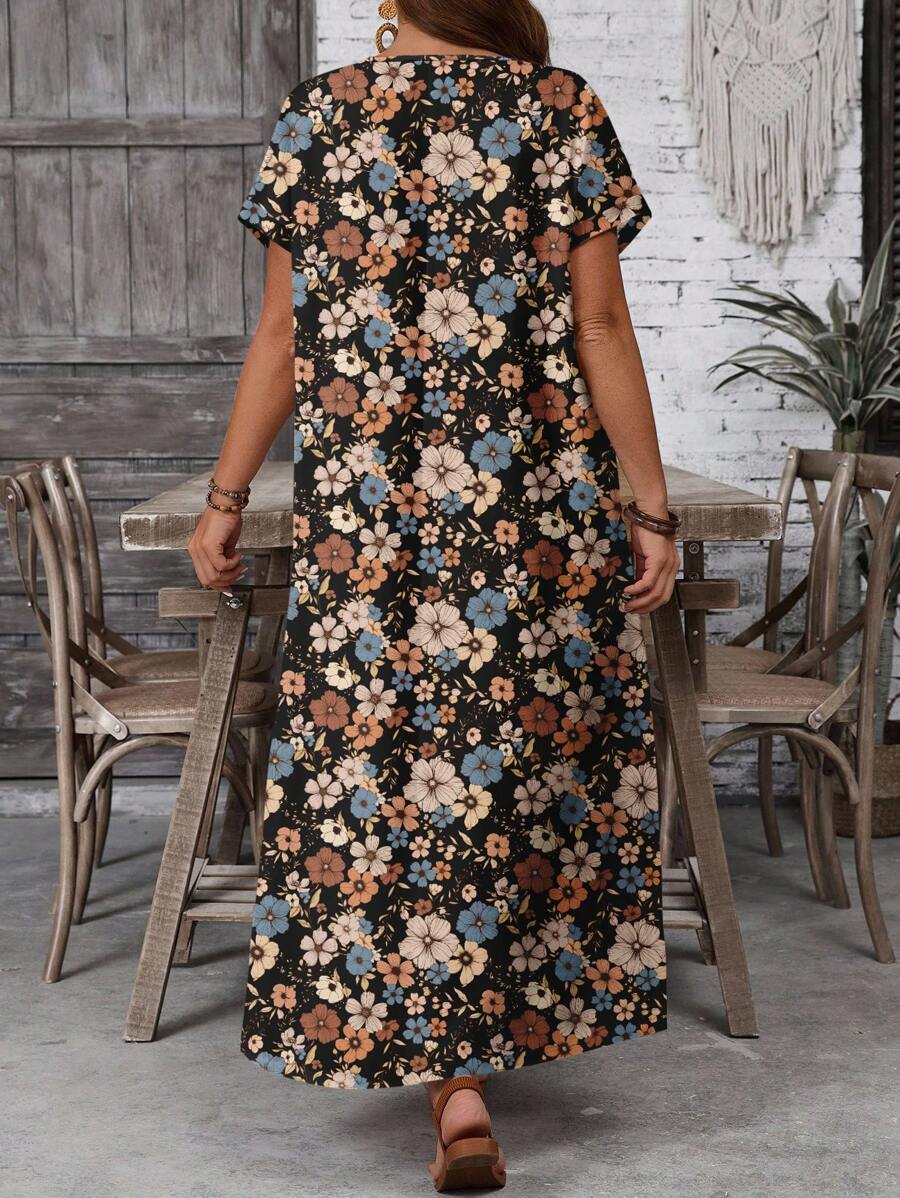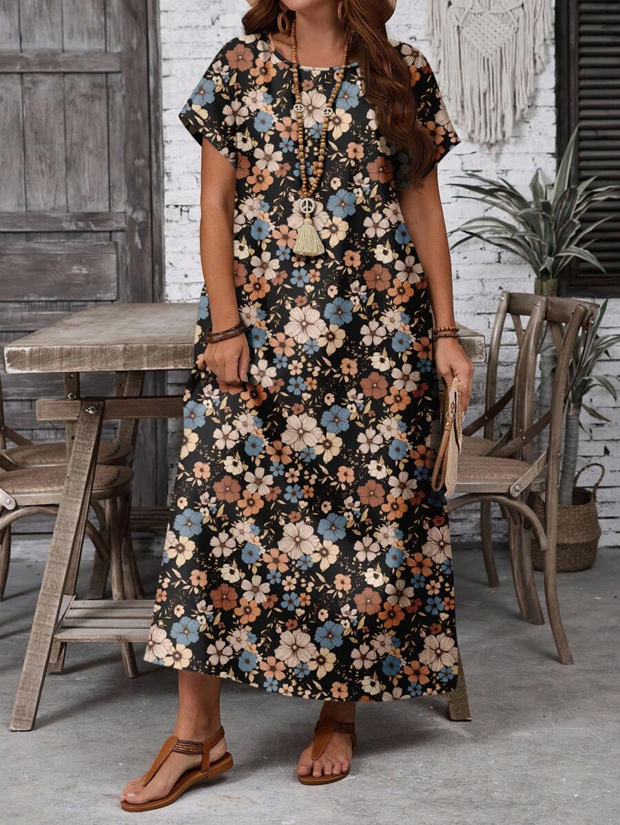 Vestido casual holgado de manga corta con cuello redondo y estampado floral para mujer de talla grande, verano