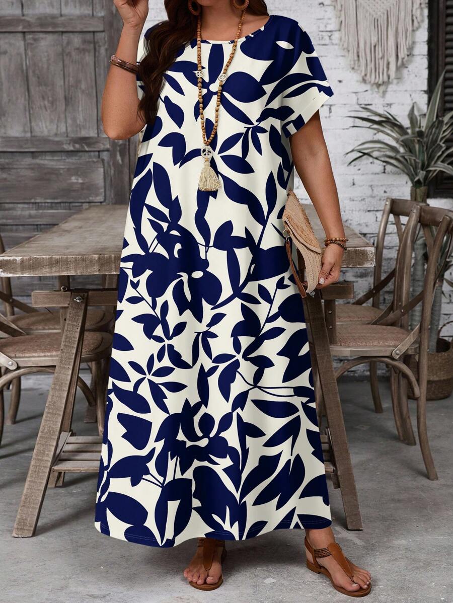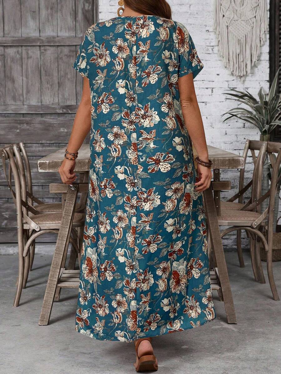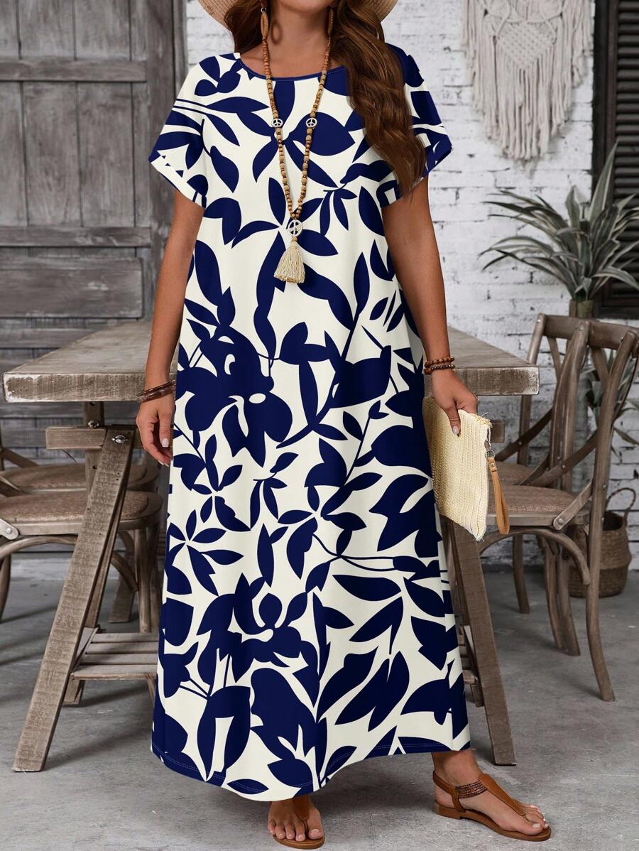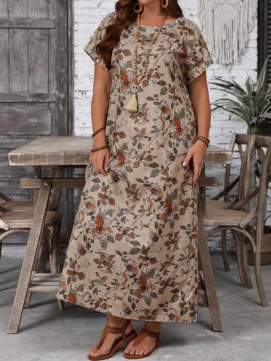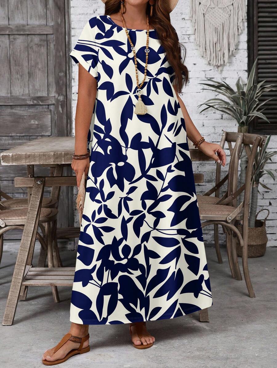 Vestido casual holgado de manga corta con cuello redondo y estampado floral para mujer de talla grande, verano