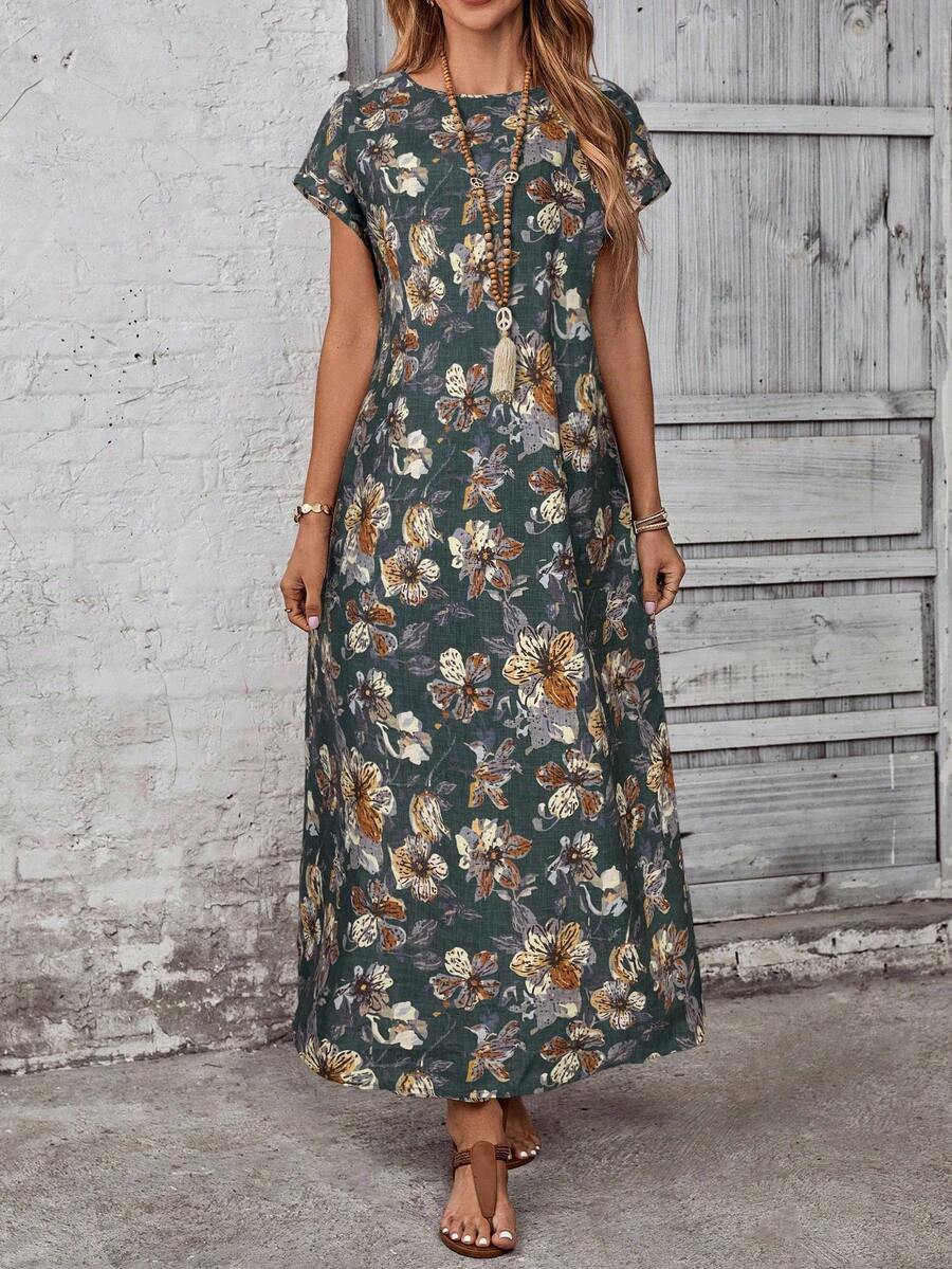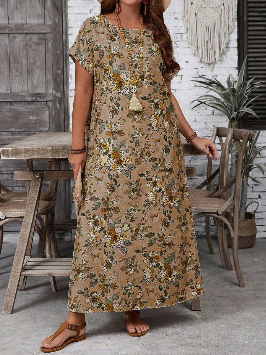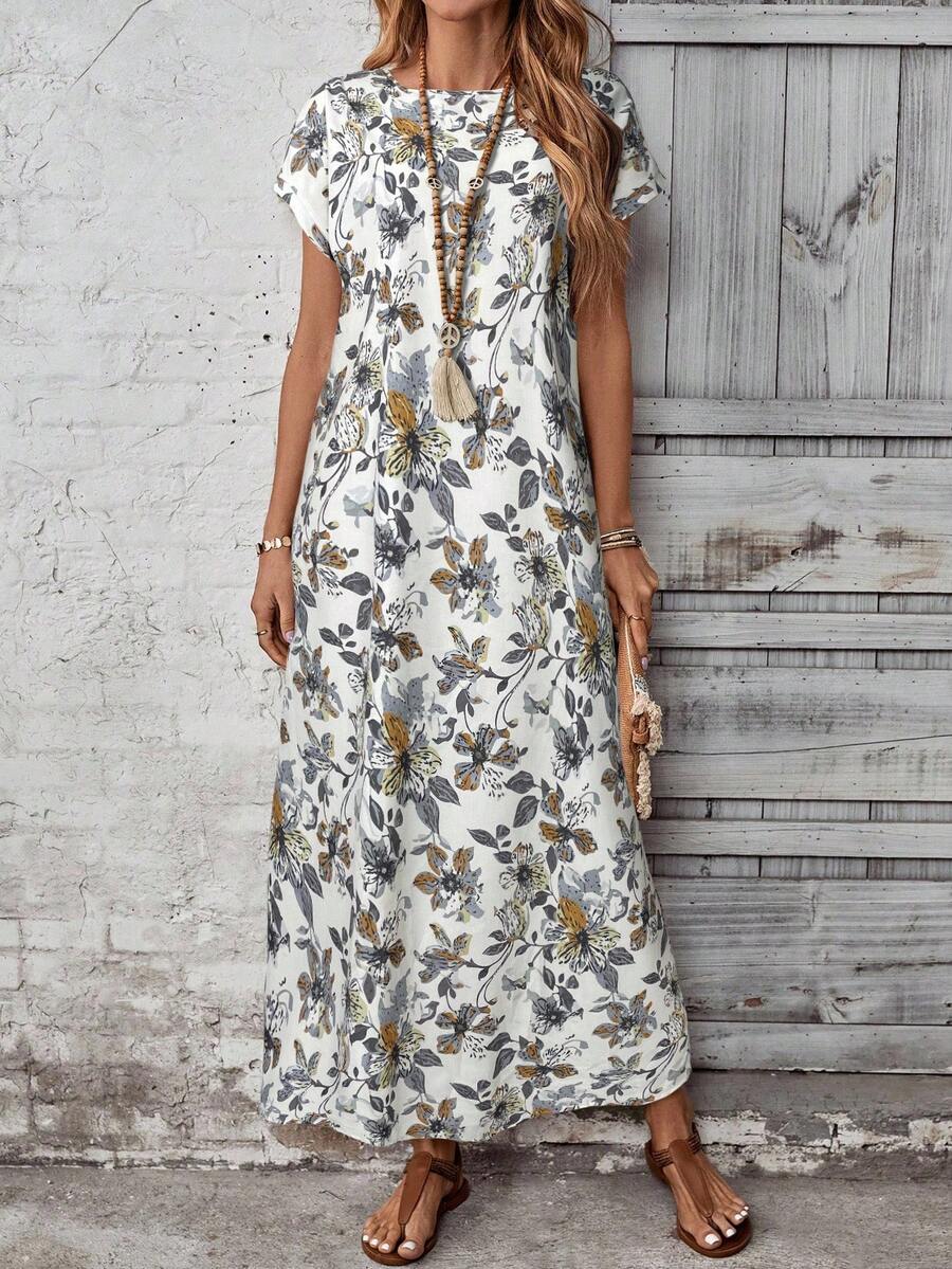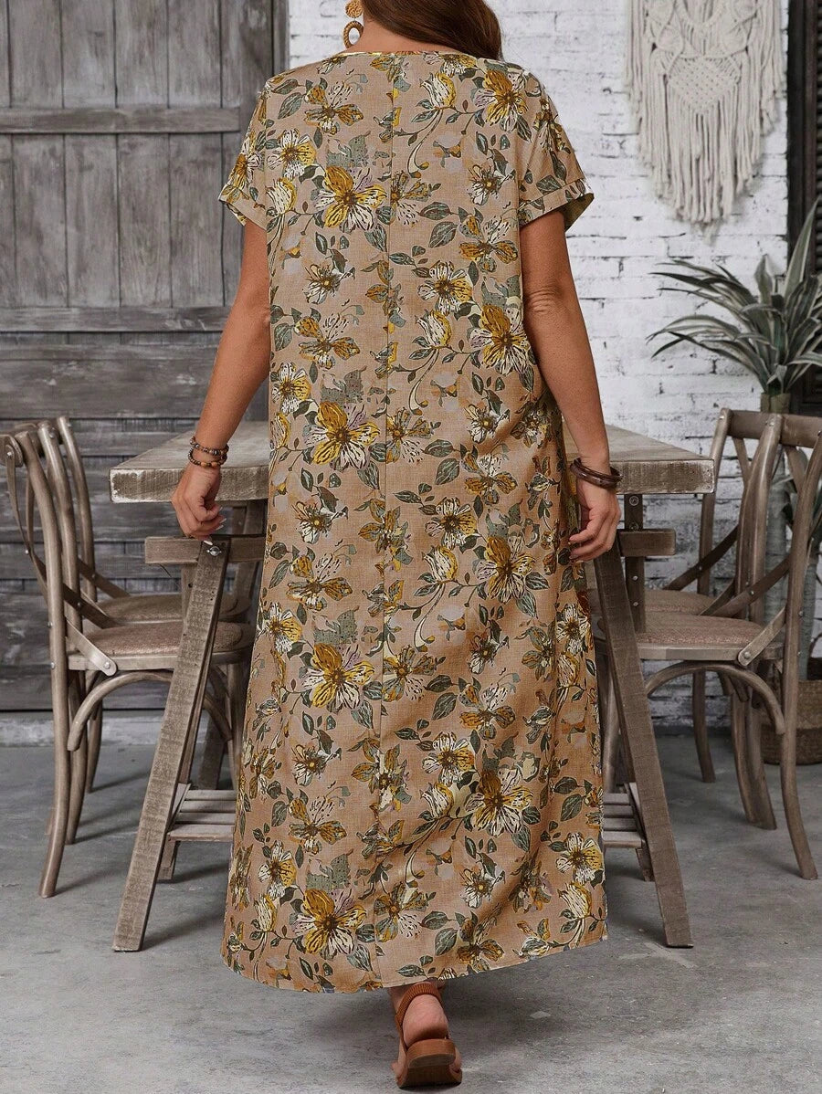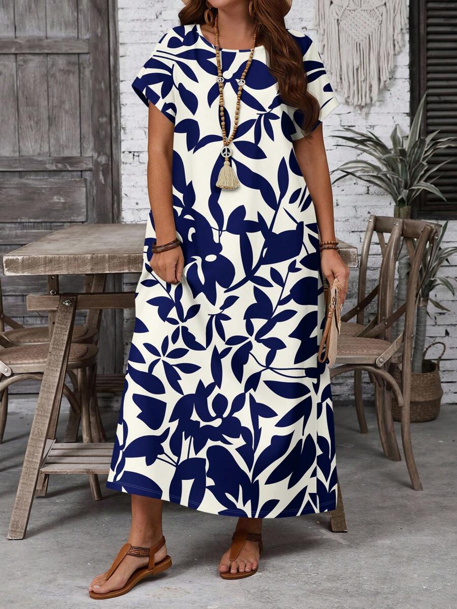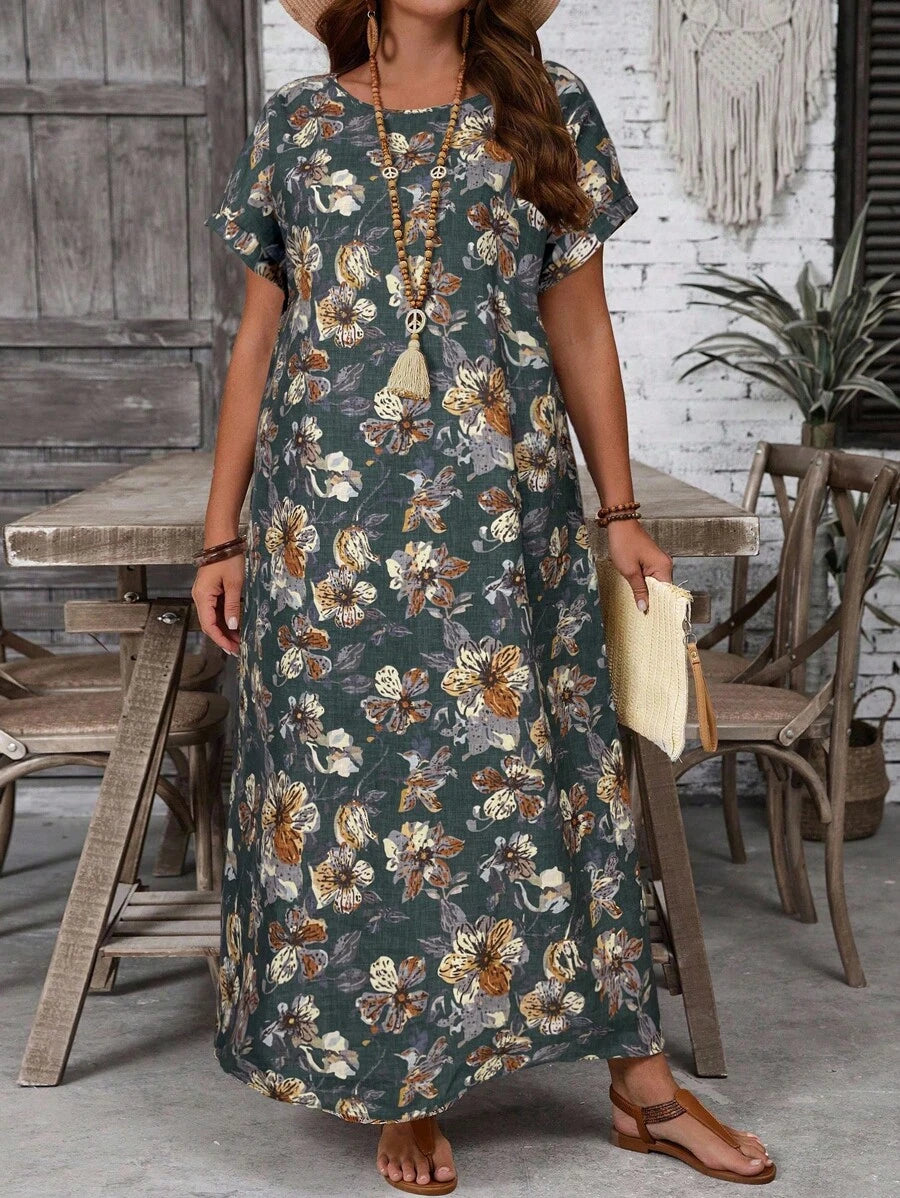 Vestido casual holgado de manga corta con cuello redondo y estampado floral para mujer de talla grande, verano
