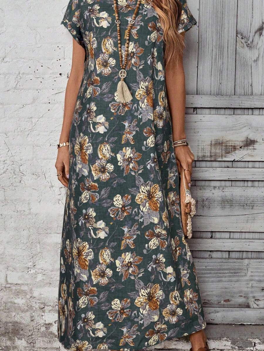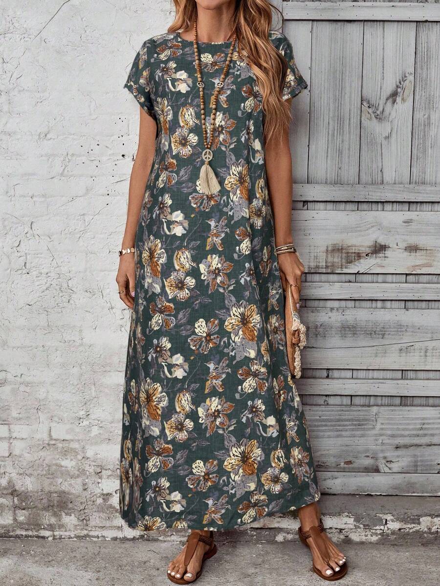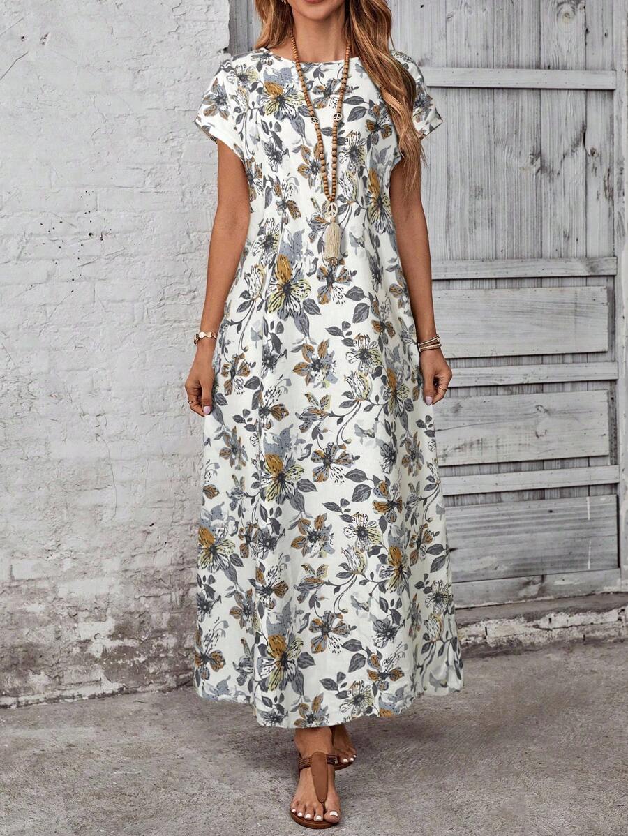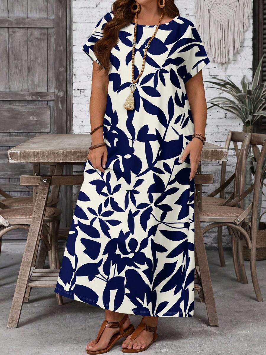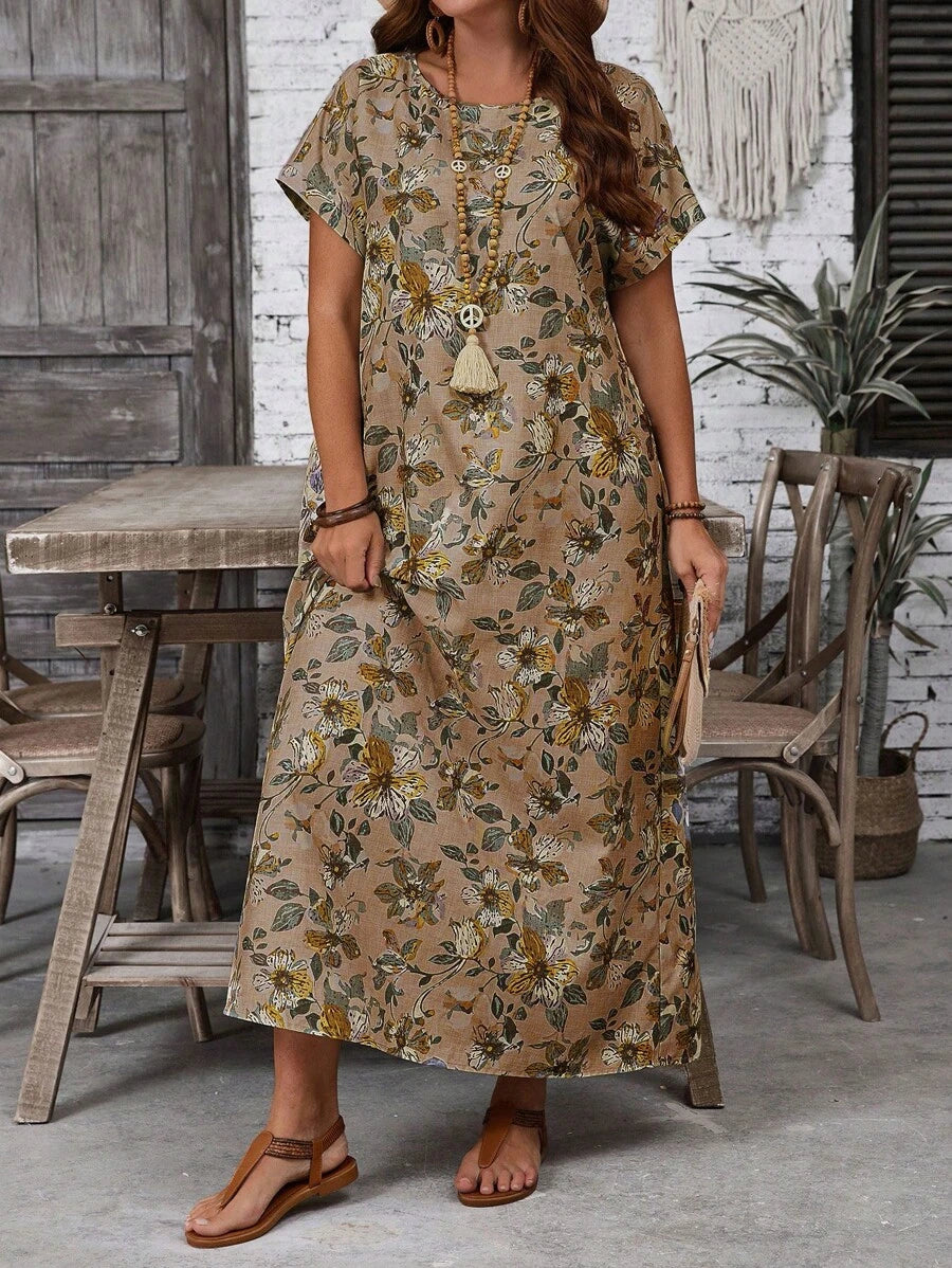 Vestido casual holgado de manga corta con cuello redondo y estampado floral para mujer de talla grande, verano