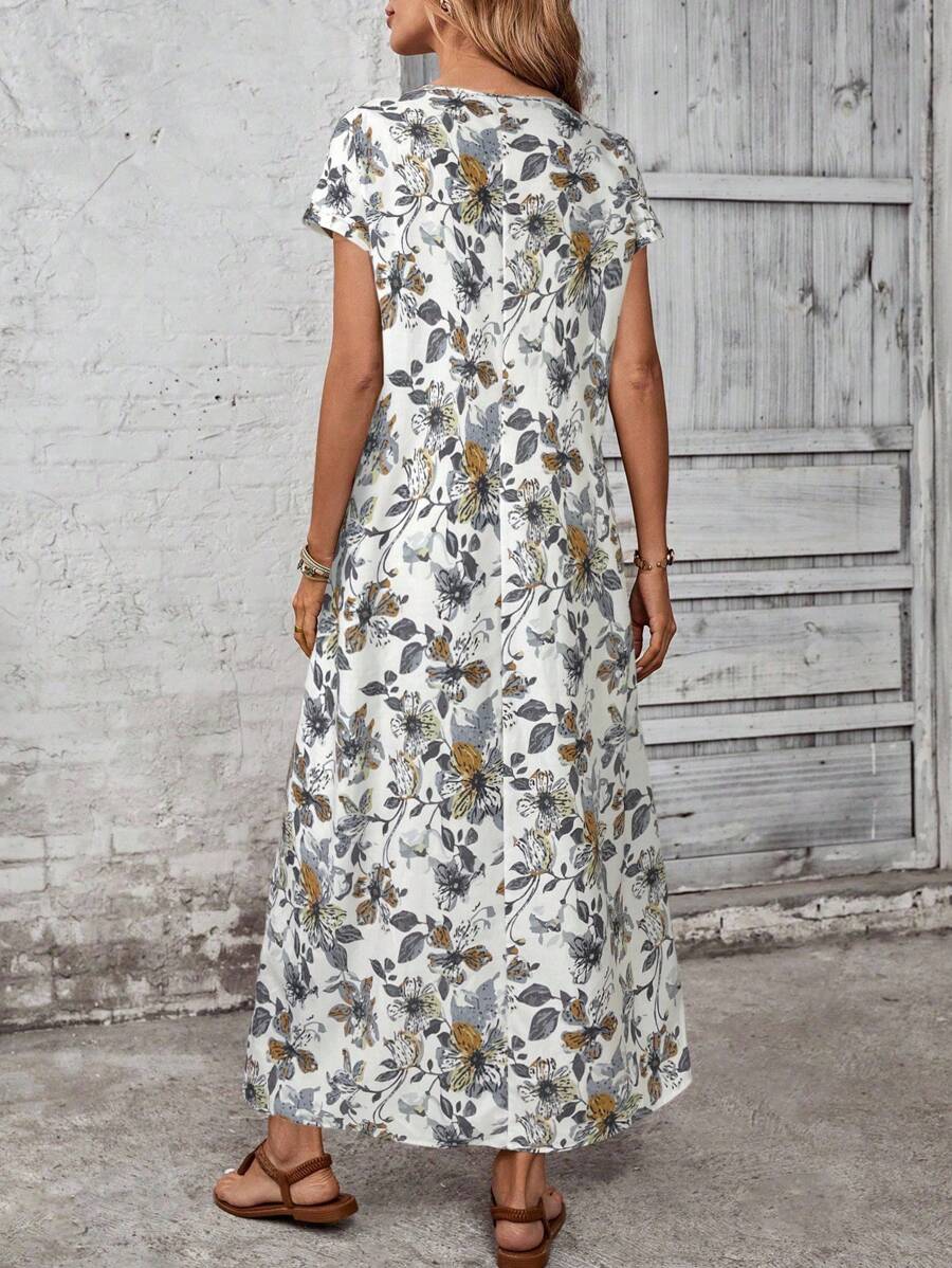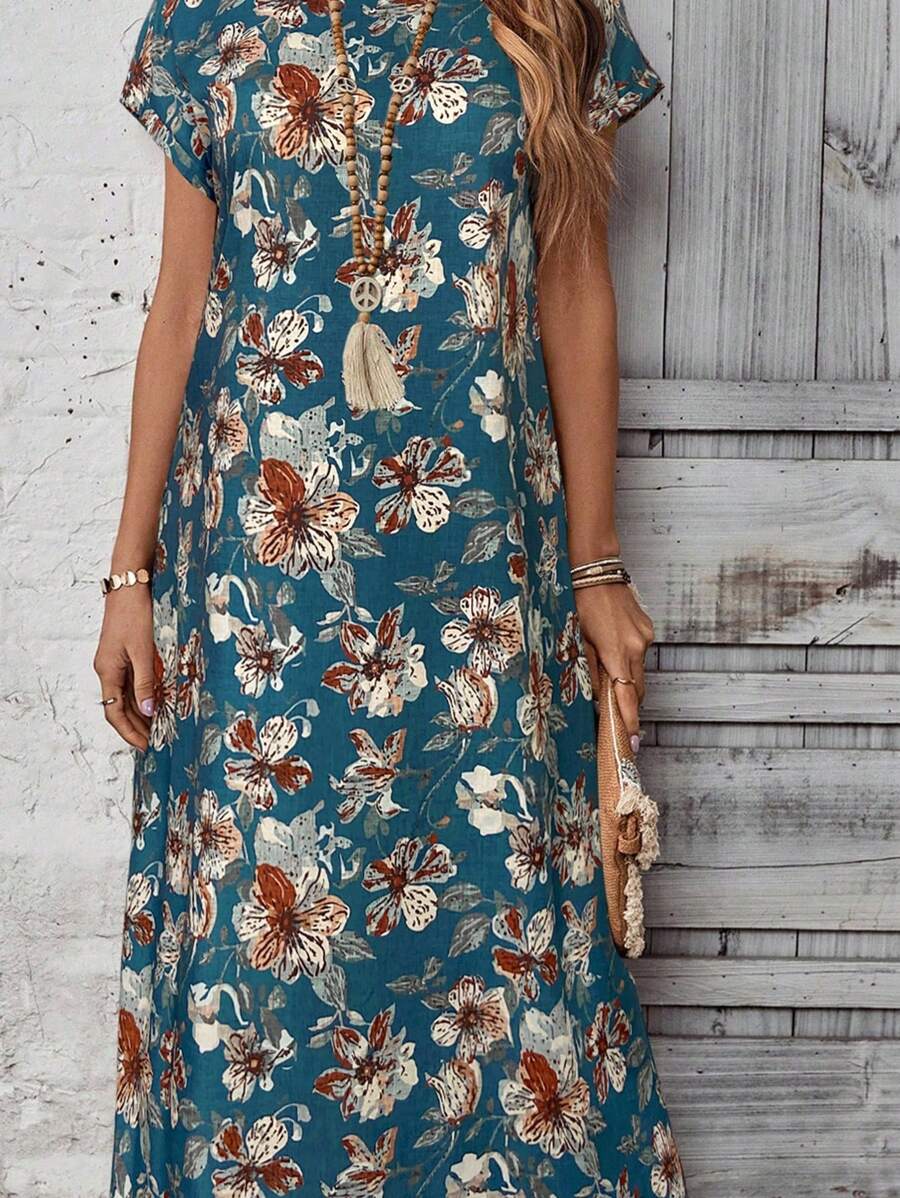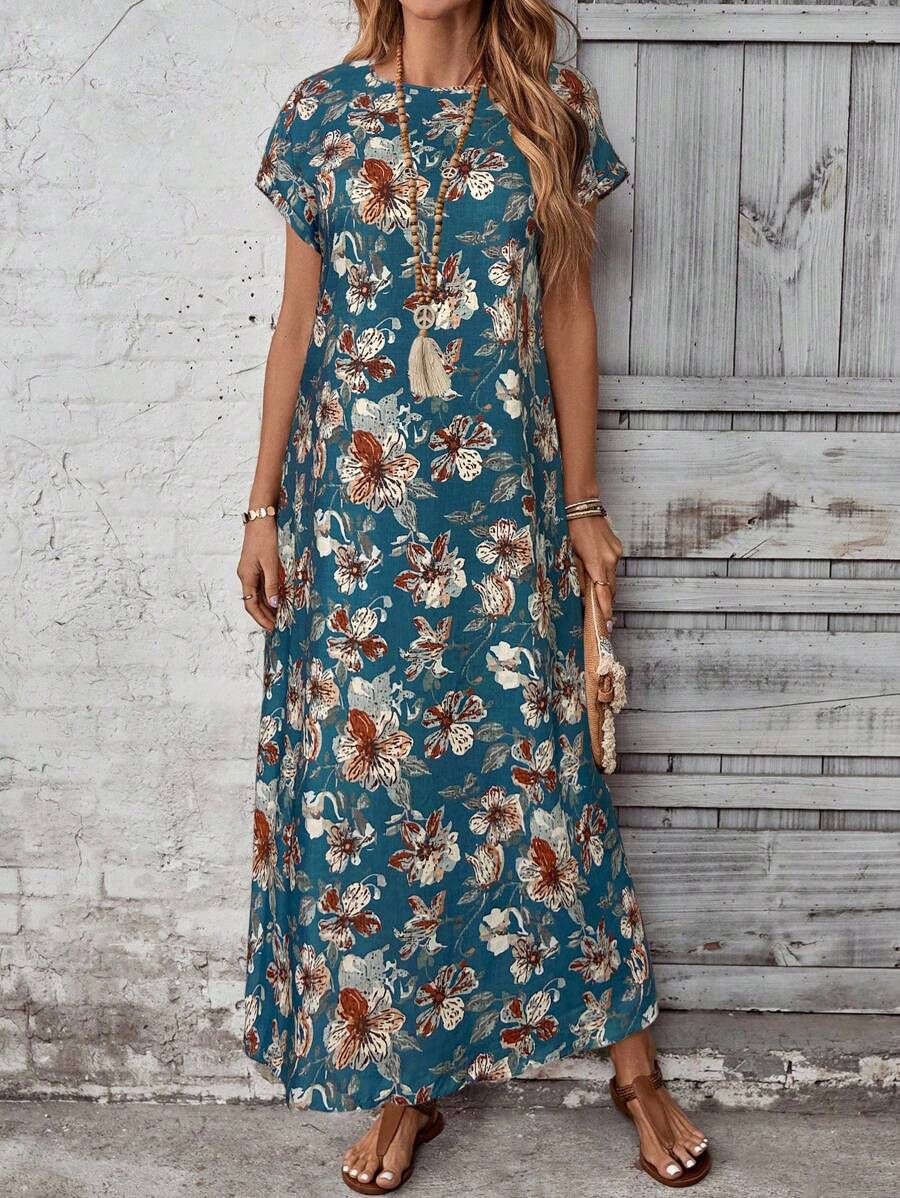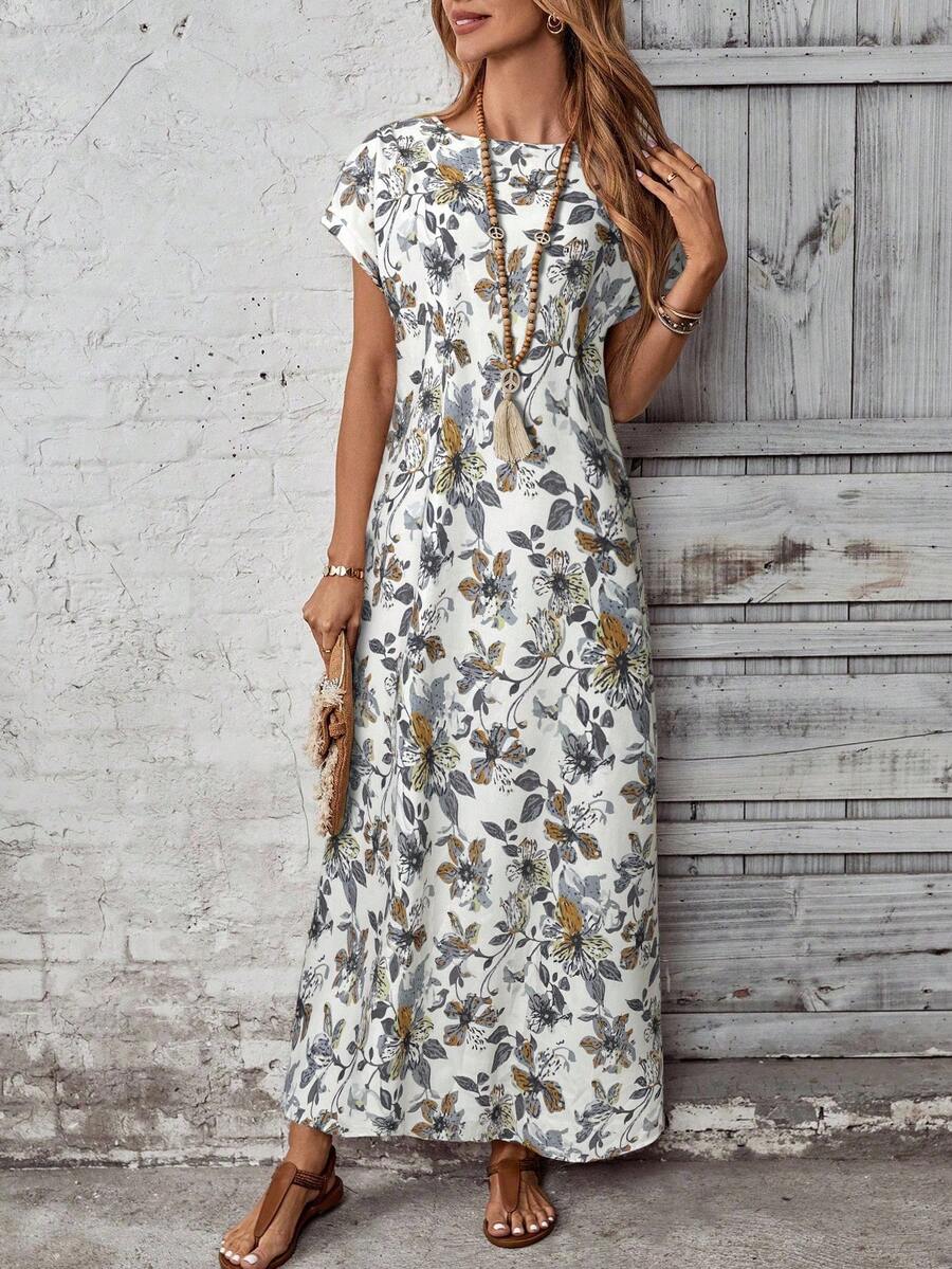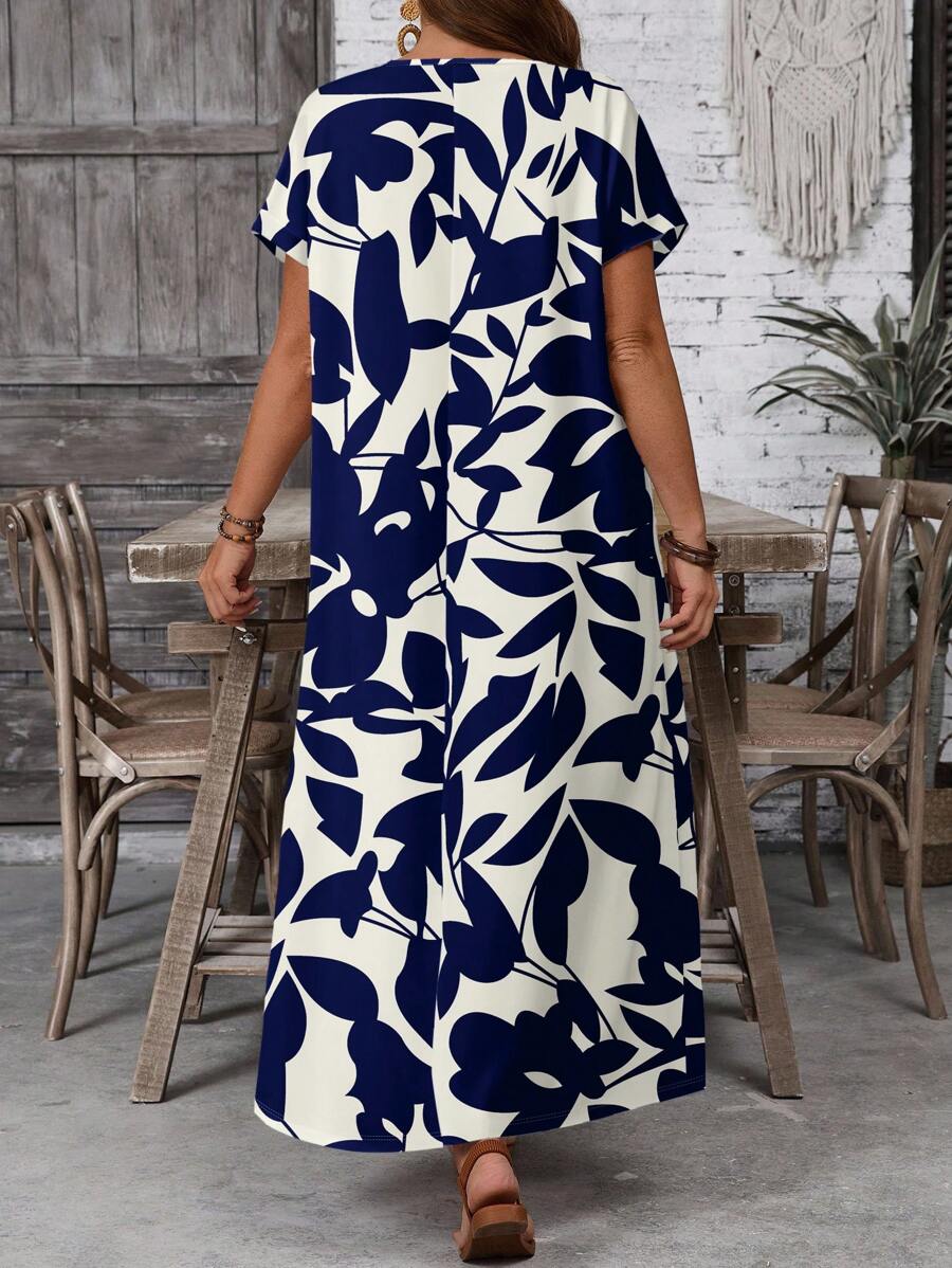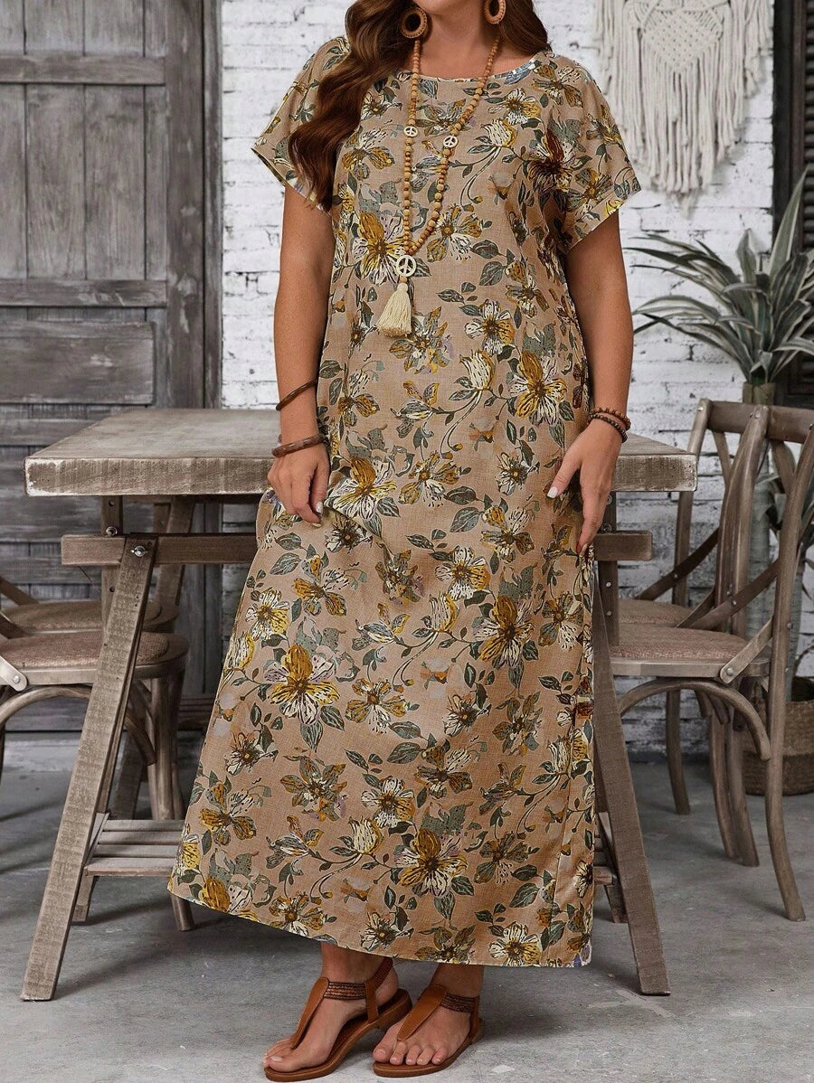 Vestido casual holgado de manga corta con cuello redondo y estampado floral para mujer de talla grande, verano