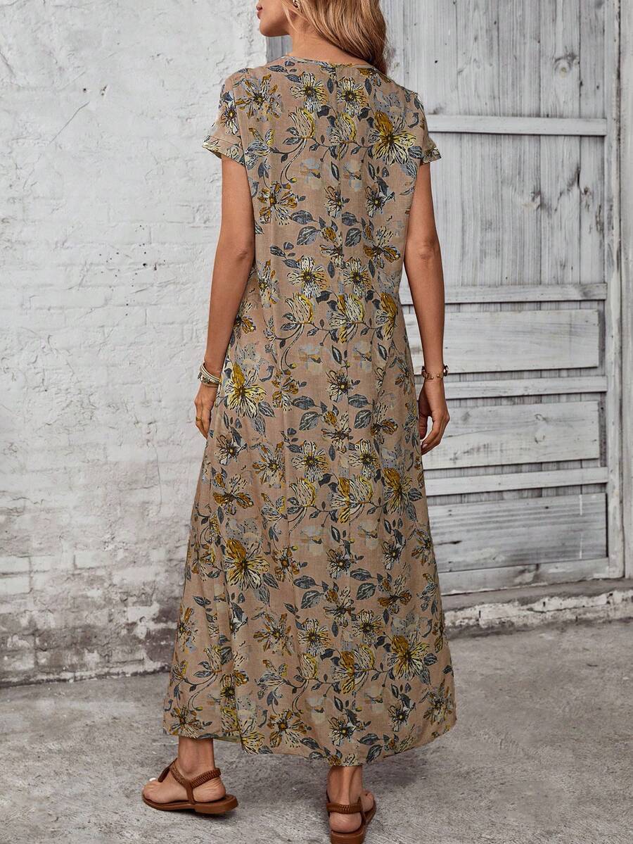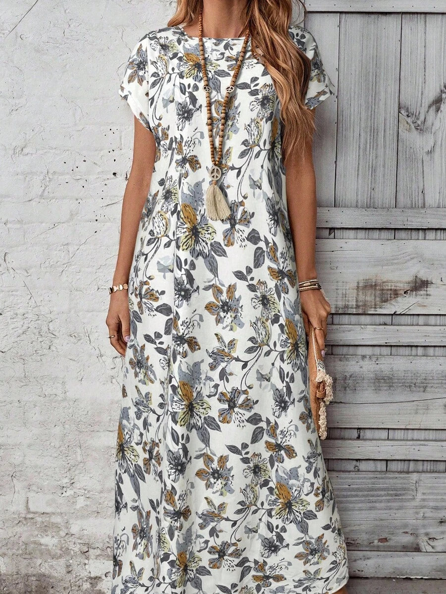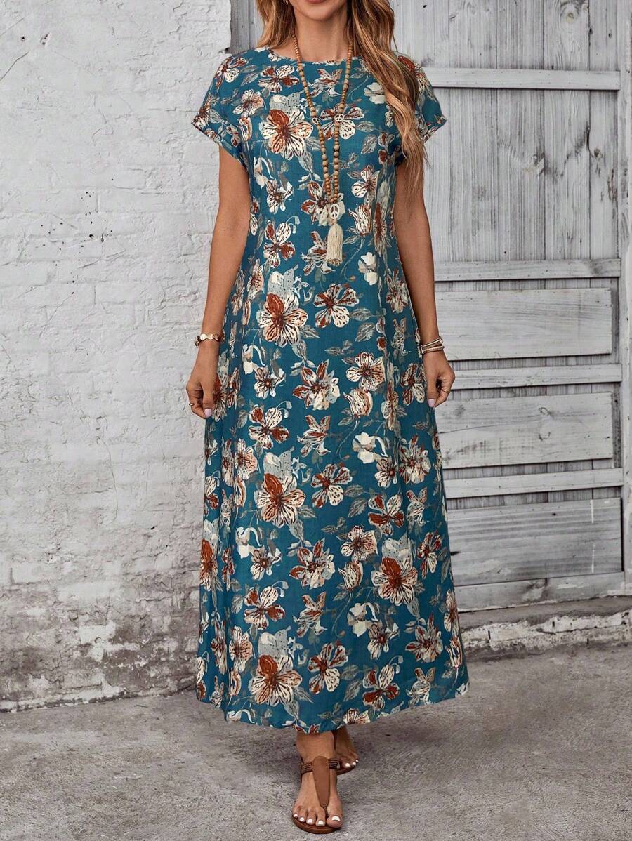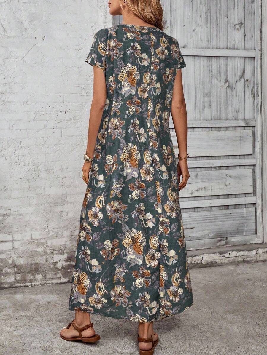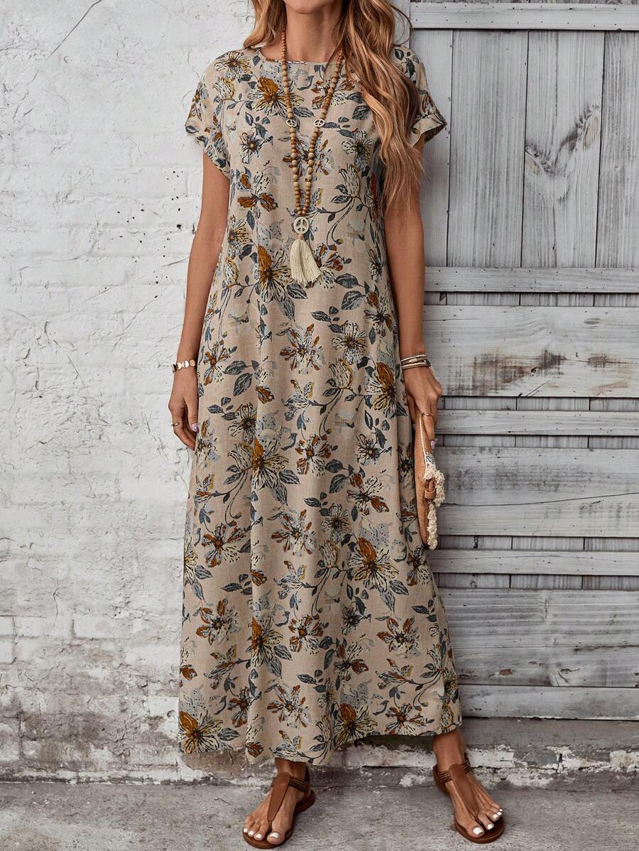Vestido casual holgado de manga corta con cuello redondo y estampado floral para mujer de talla grande, verano