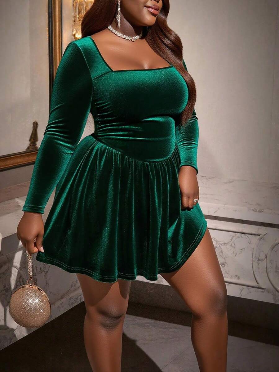 Vestido elegante de manga larga con cuello cuadrado, volantes en el bajo y unicolor para mujer de talla grande
