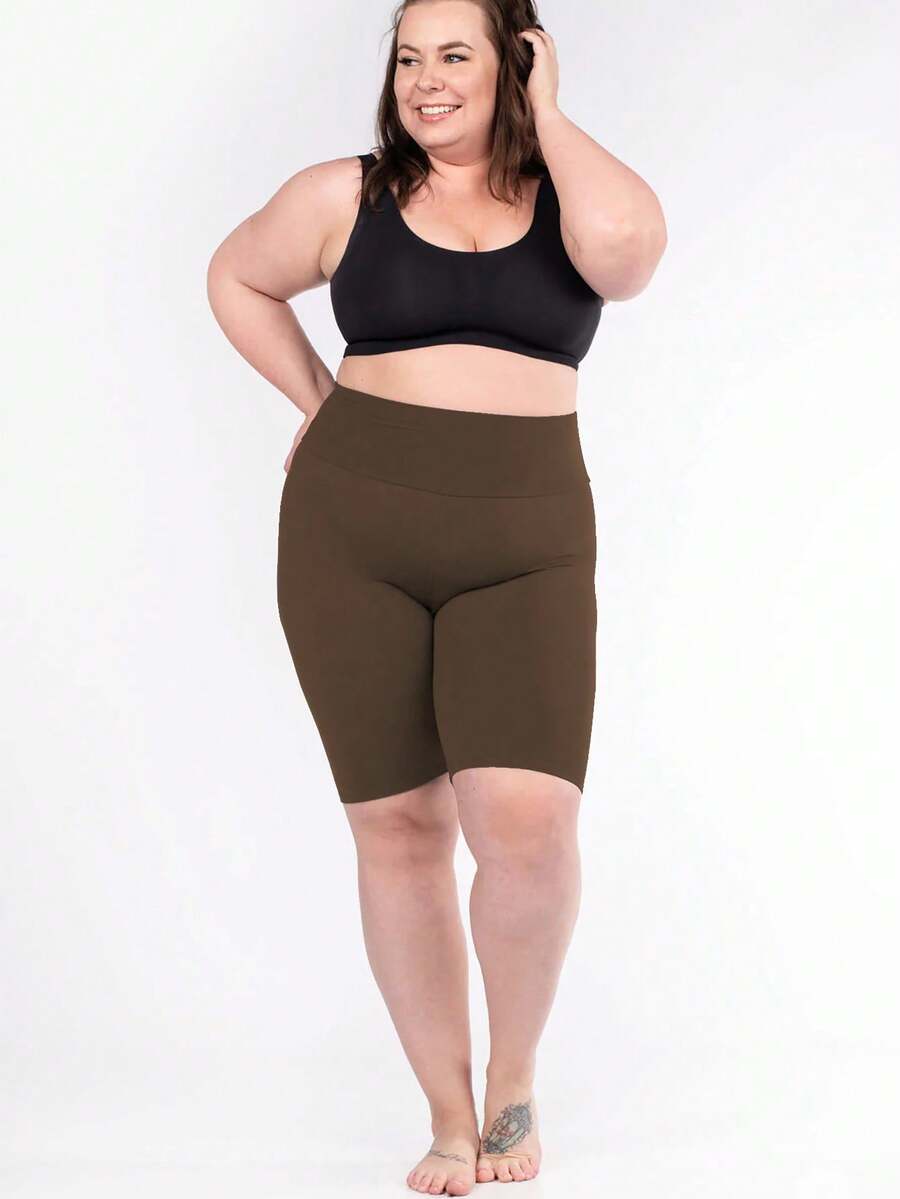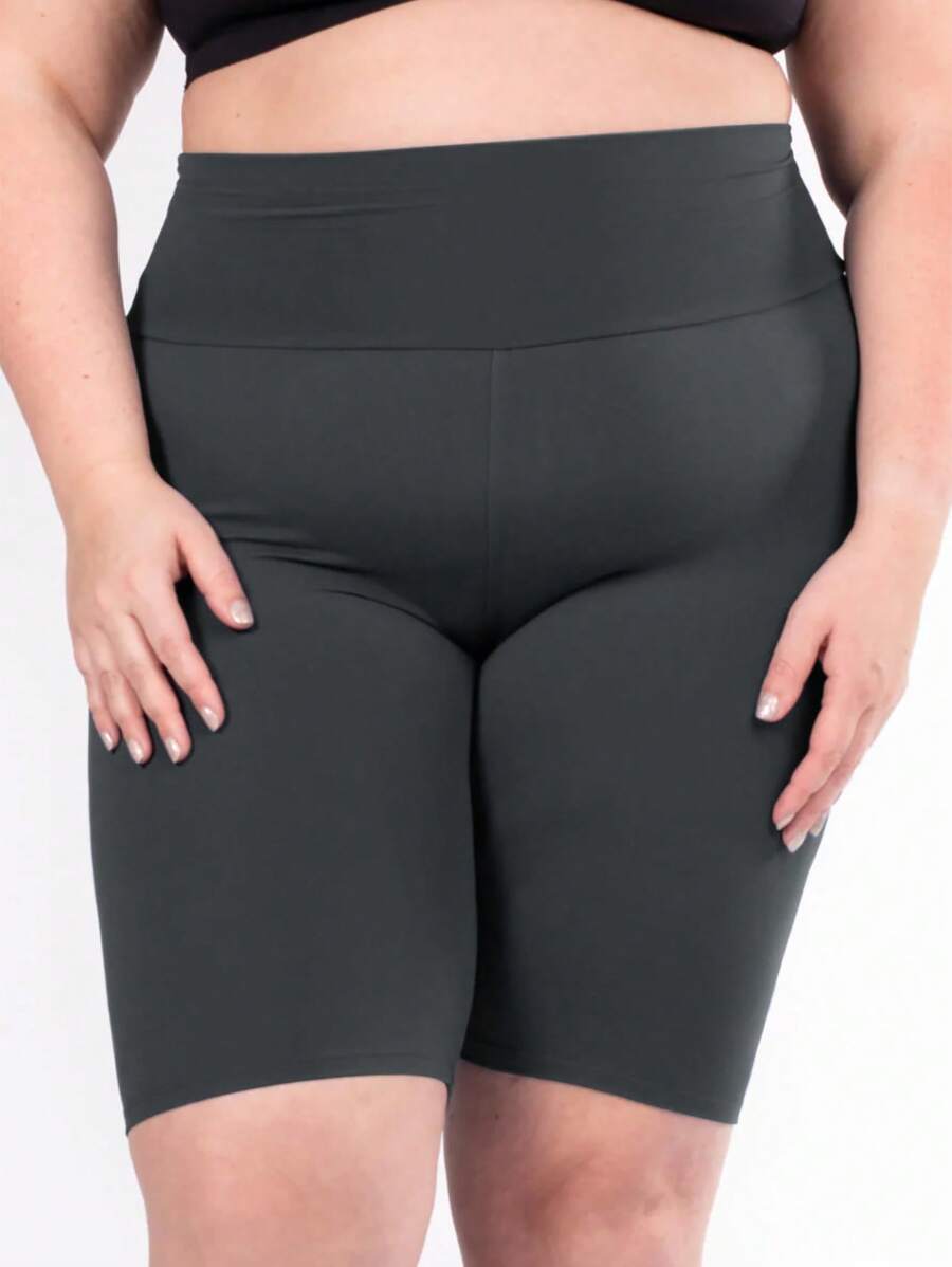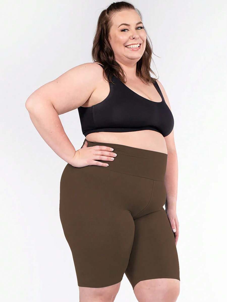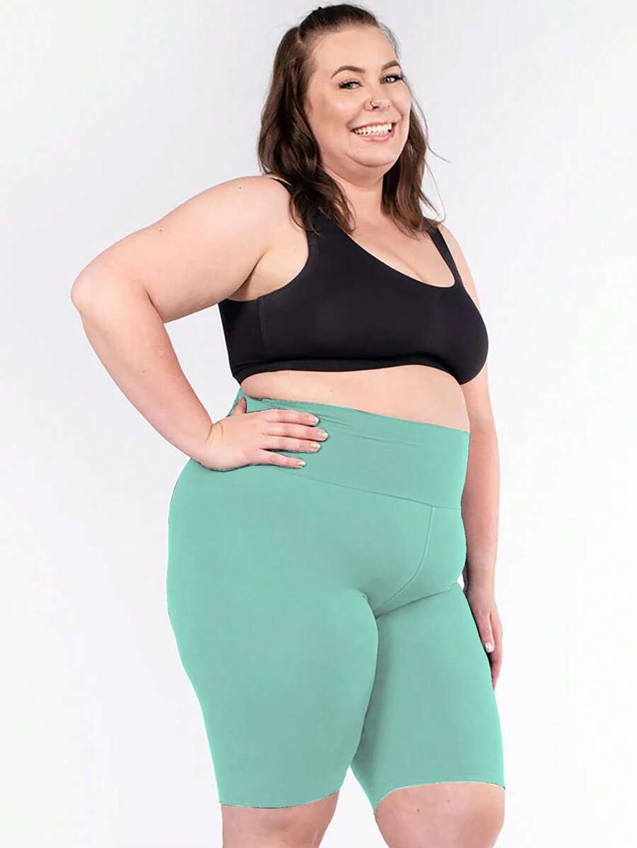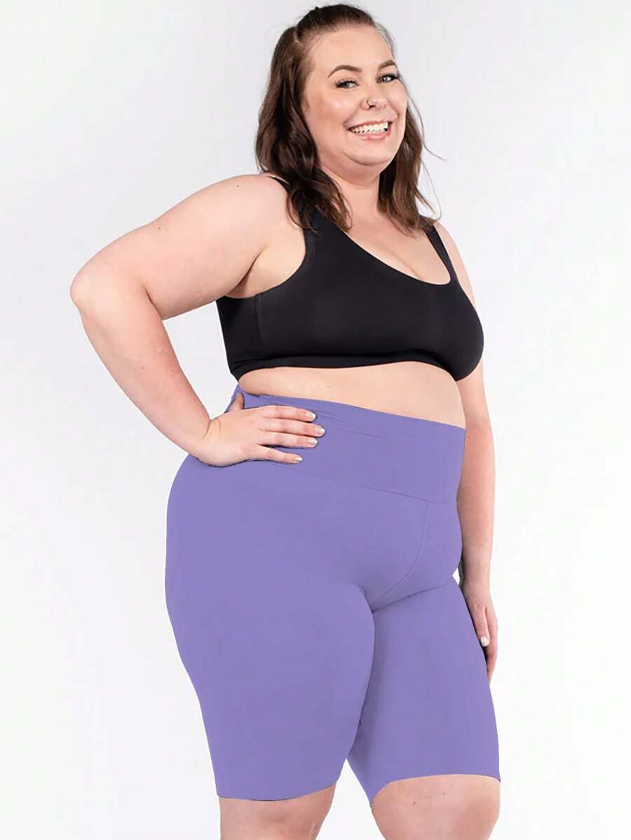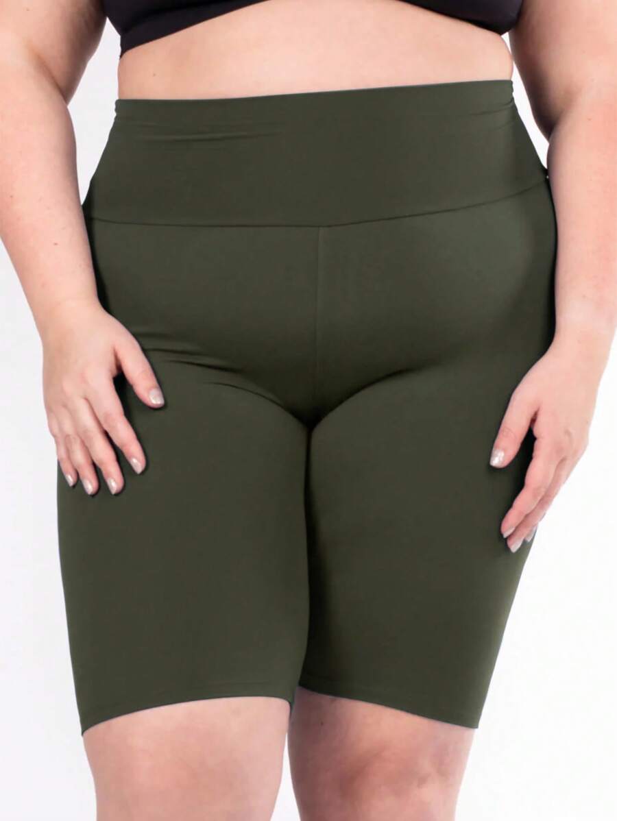 Pantalones cortos de mujer de talla grande de unicolor, tela de punto de poliester, cintura elastica, longitud corta, mallas de fitness de alta elasticidad, adecuadas para uso casual y entrenamiento los fines de semana