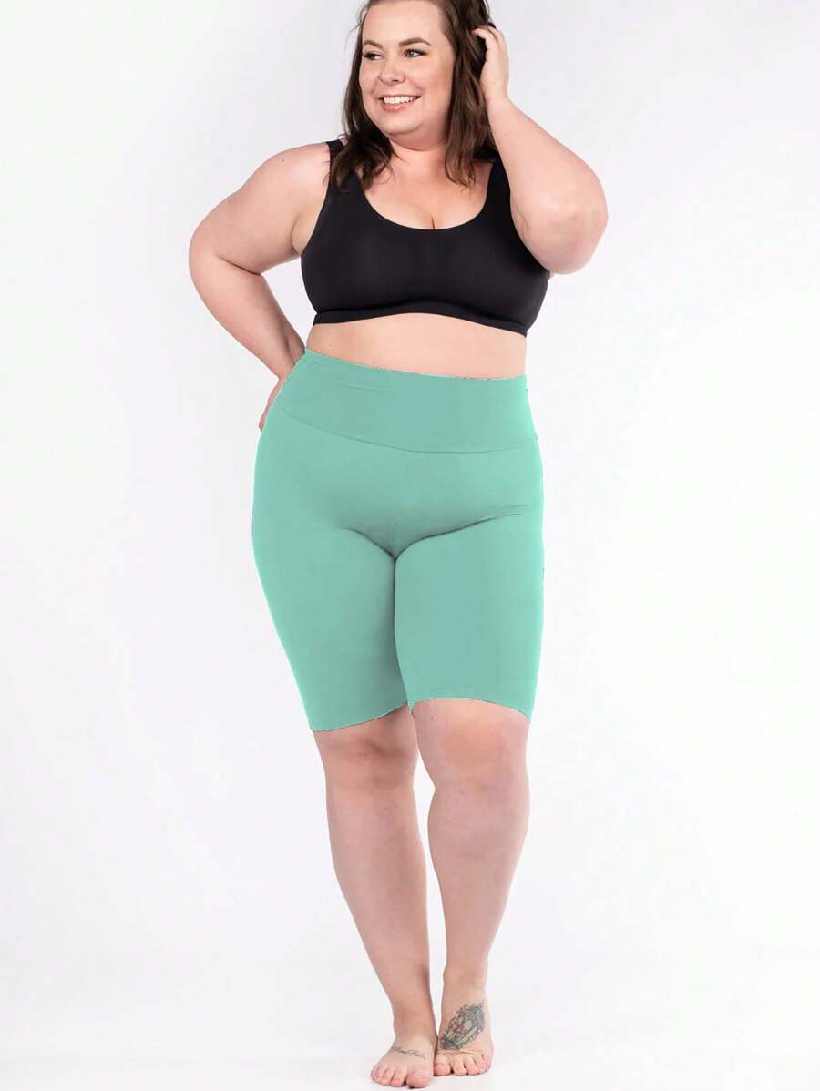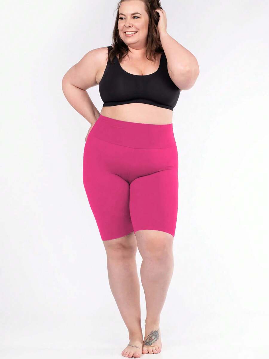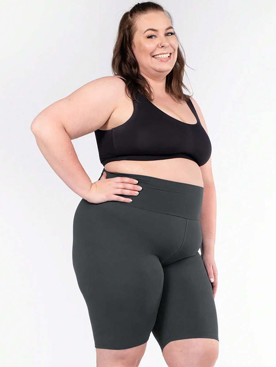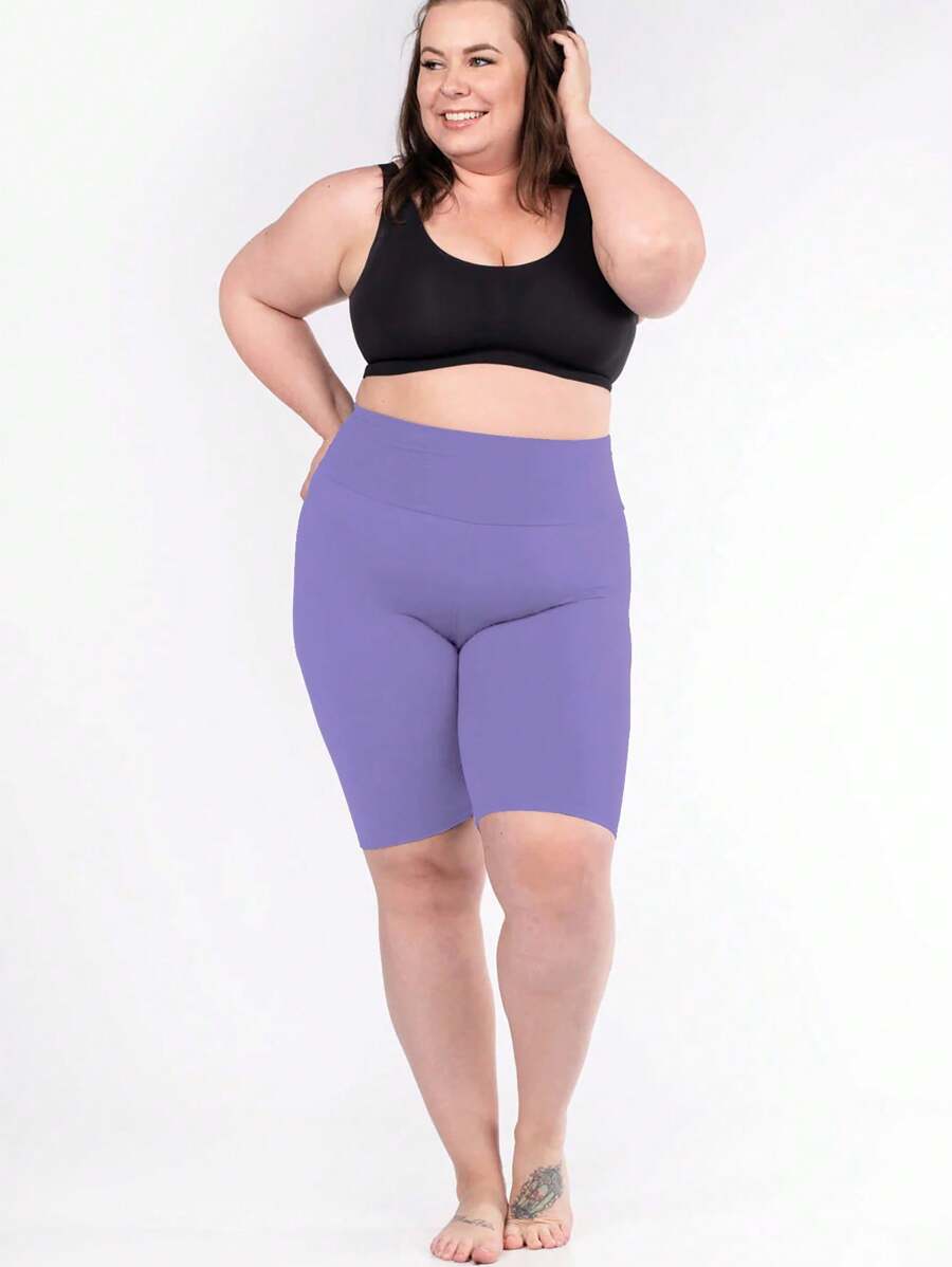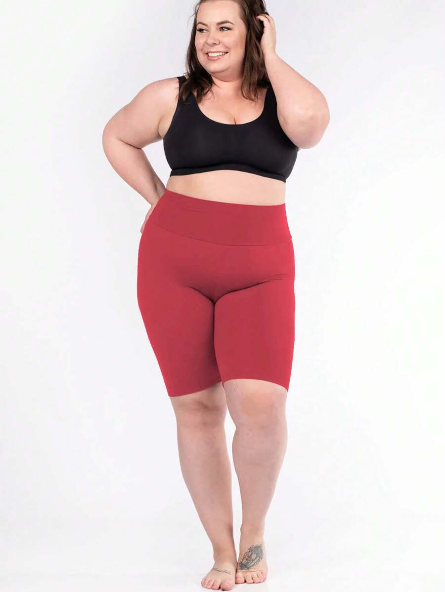 Pantalones cortos de mujer de talla grande de unicolor, tela de punto de poliester, cintura elastica, longitud corta, mallas de fitness de alta elasticidad, adecuadas para uso casual y entrenamiento los fines de semana