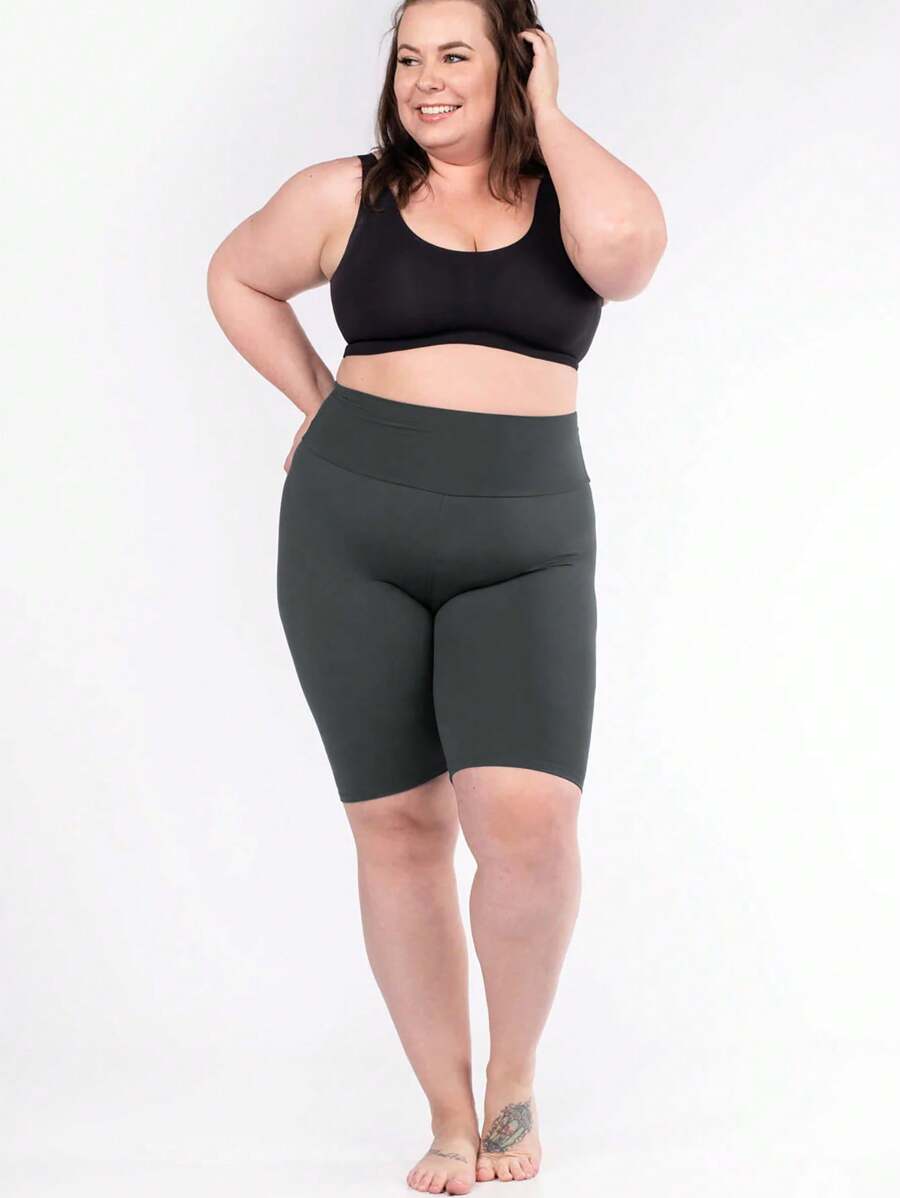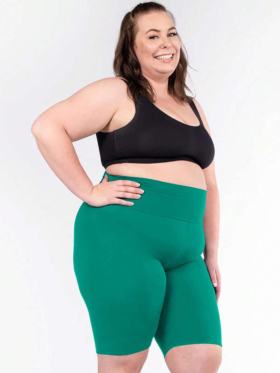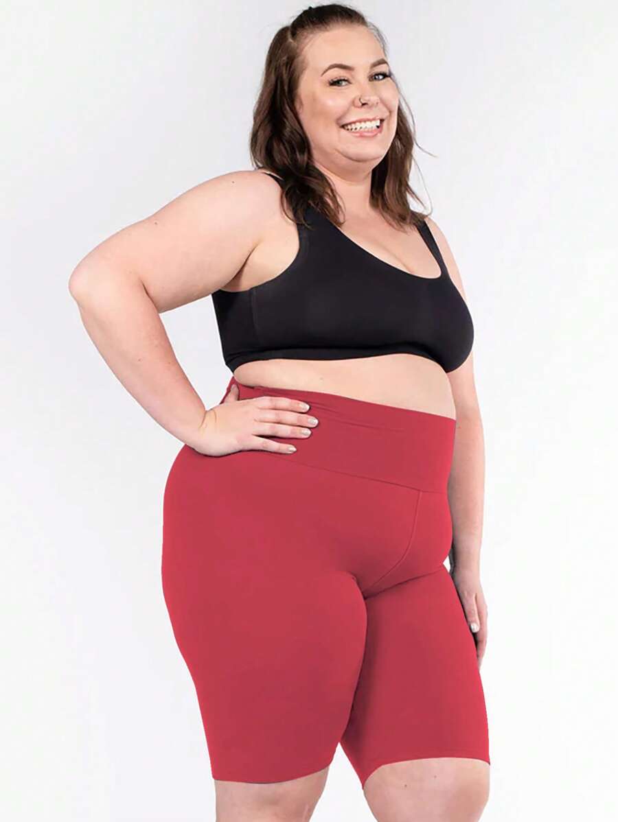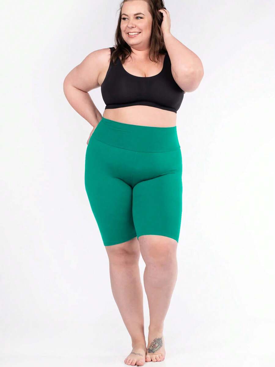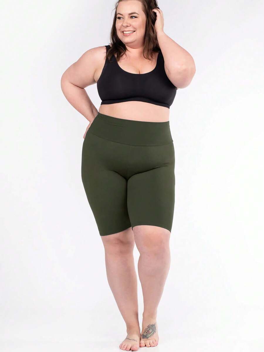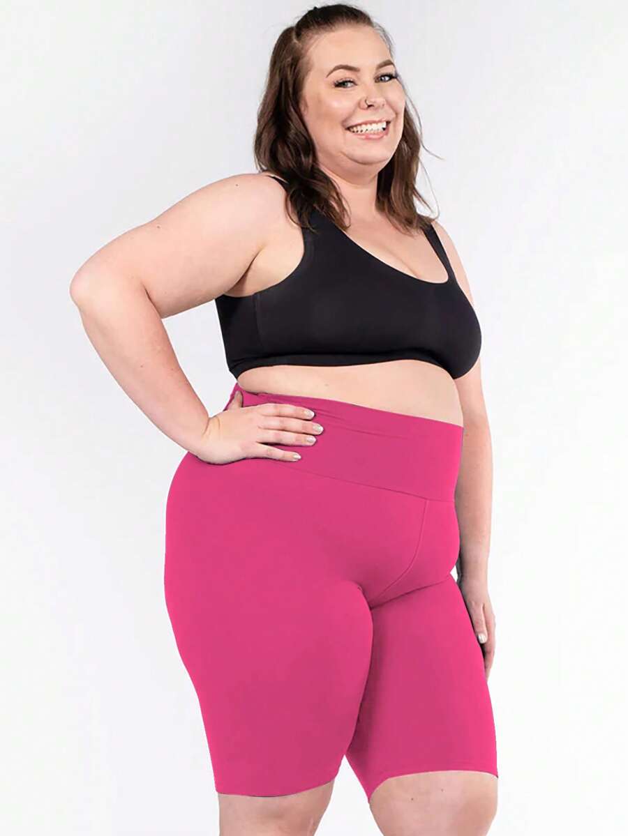Pantalones cortos de mujer de talla grande de unicolor, tela de punto de poliester, cintura elastica, longitud corta, mallas de fitness de alta elasticidad, adecuadas para uso casual y entrenamiento los fines de semana