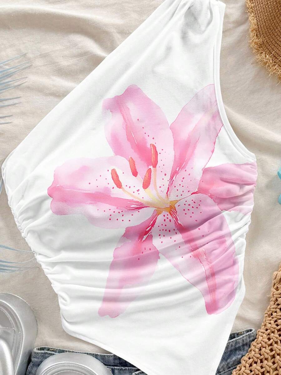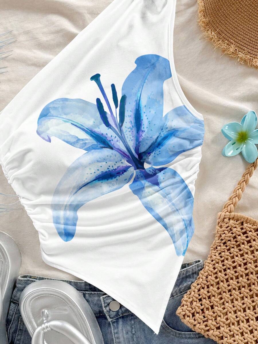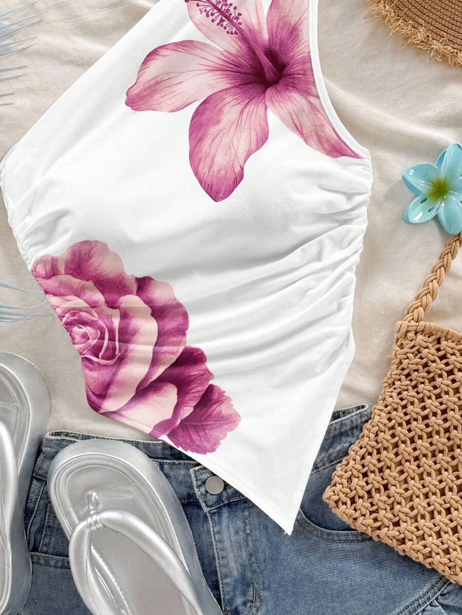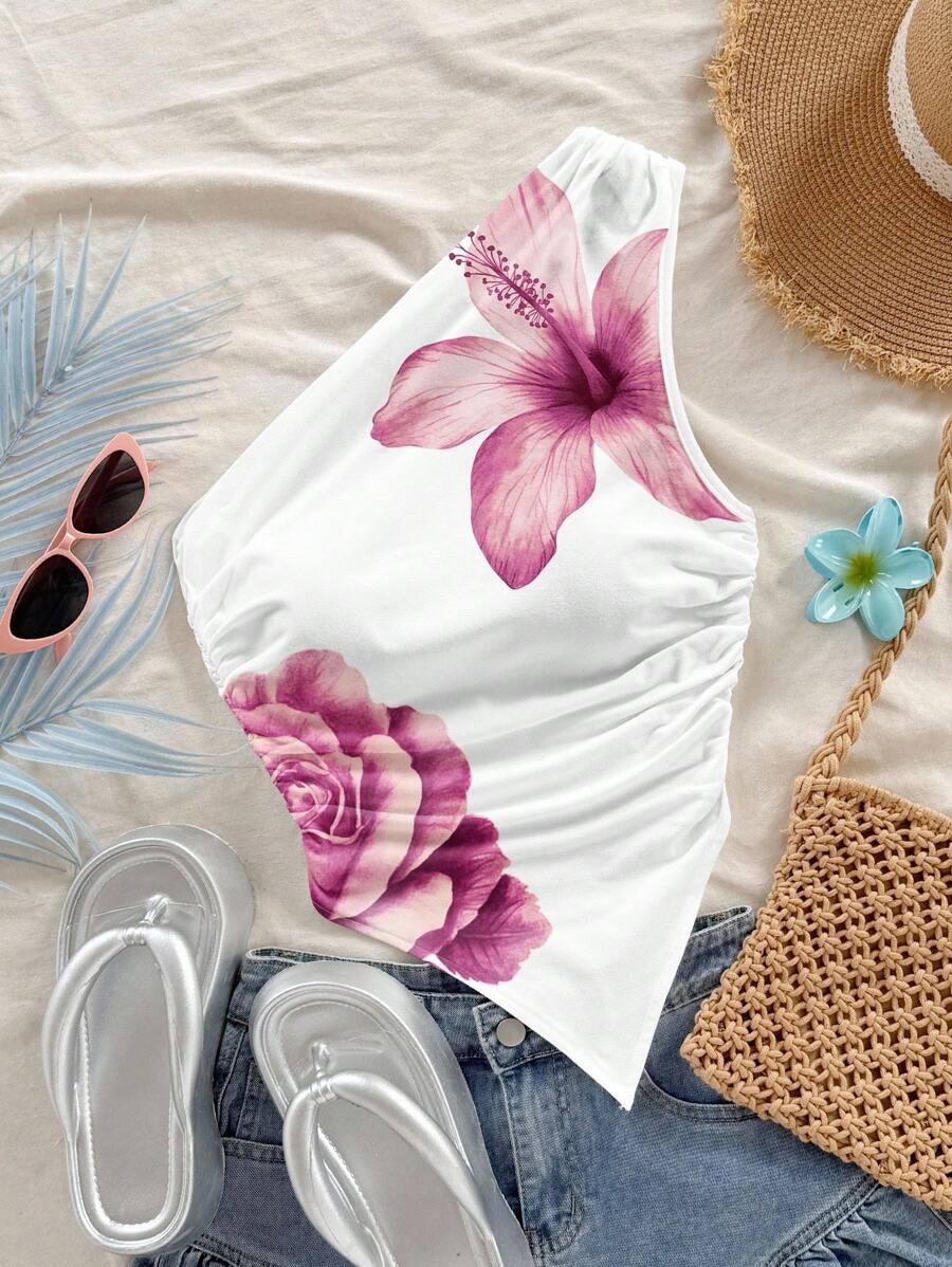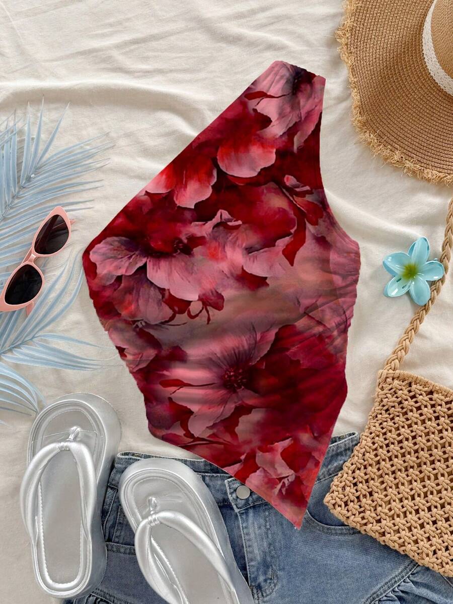 Top corto con hombros descubiertos y estampado floral casual, adecuado para vacaciones de verano